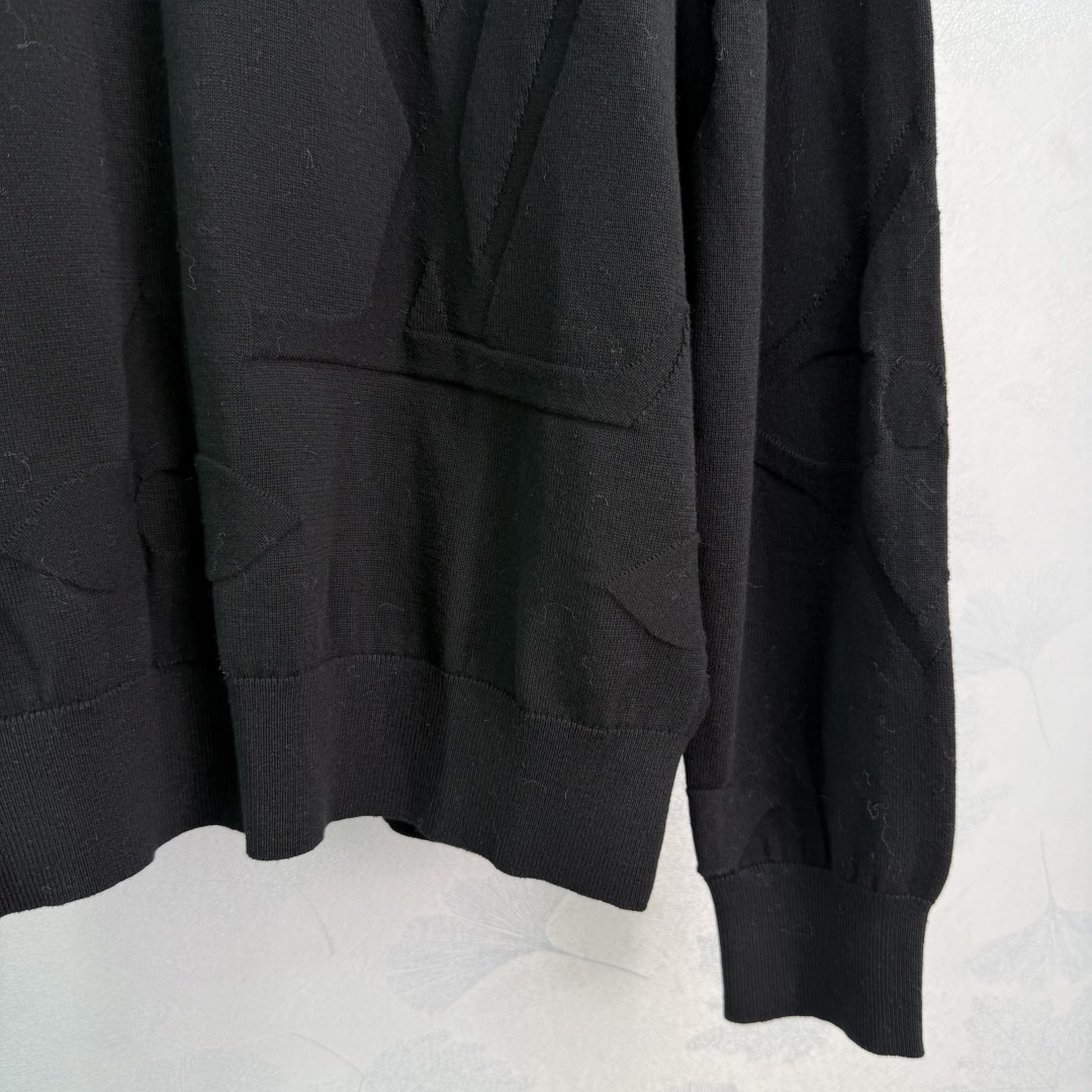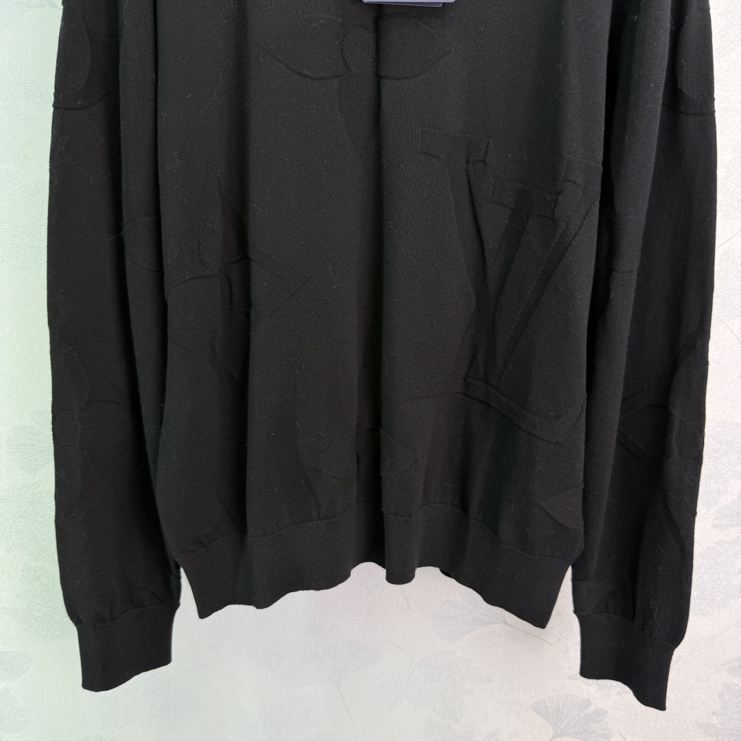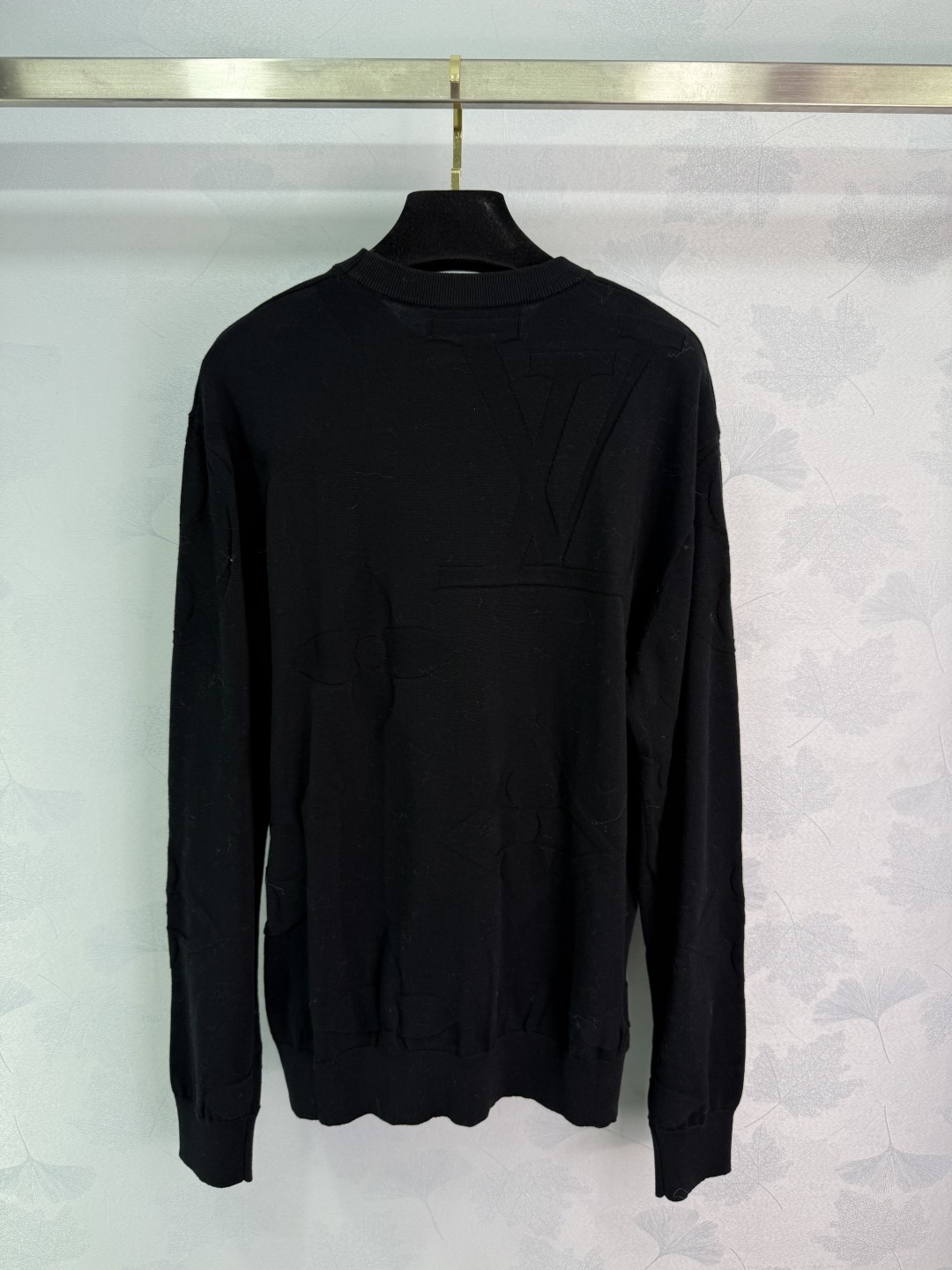 Elevate your wardrobe with this luxurious black knit sweater from Louis Vuitton. Crafted from a blend of cotton and wool, featuring embossed detailing.