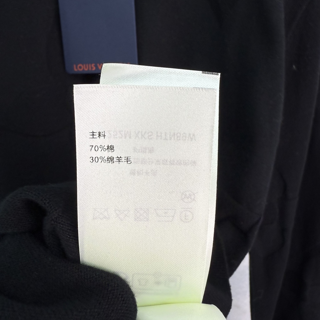 This Louis Vuitton black embossed knit crewneck long sleeve sweater is a stylish and comfortable addition to any wardrobe. Crafted from a blend of 70% cotton and 30% wool, this sweater offers a soft and luxurious feel, perfect for cooler weather.