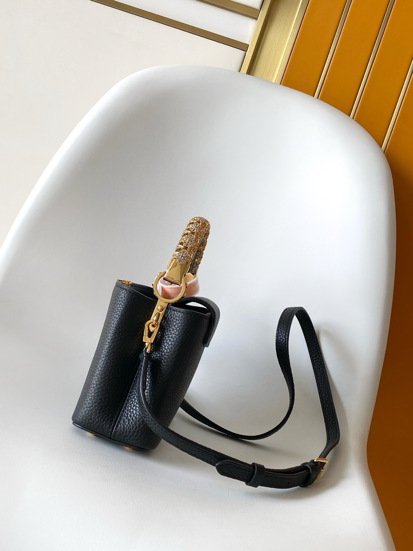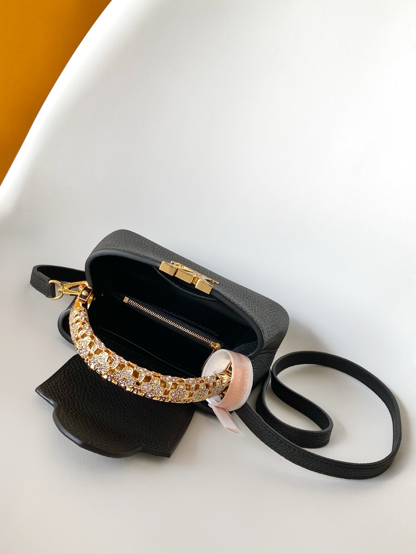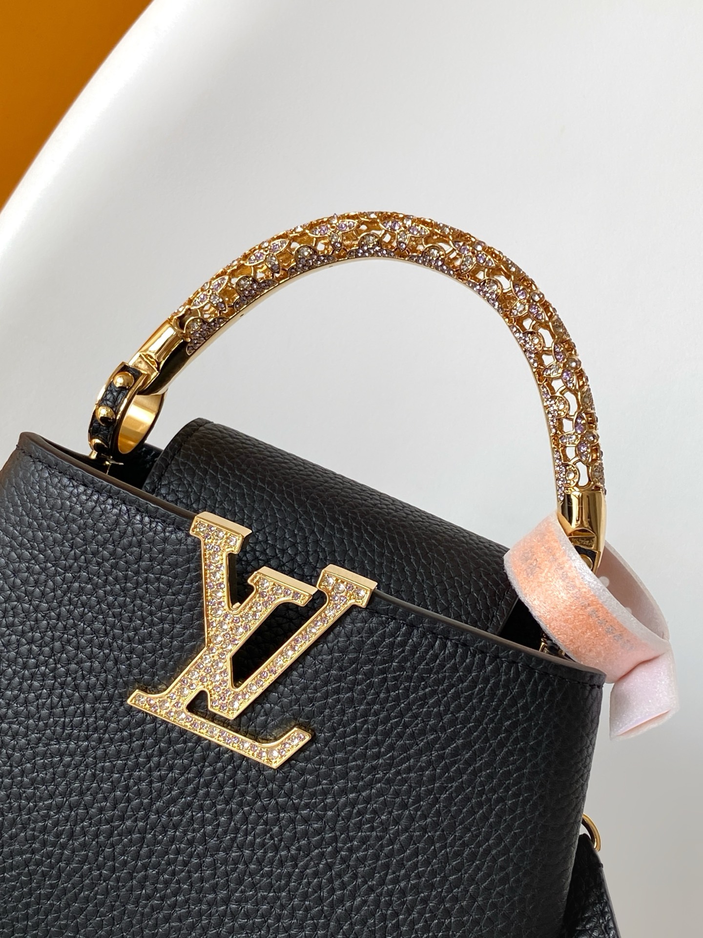 Tags: Black Taurillon Leather Bag, Designer Top Handle Bag, Louis Vuitton Capucines Bag, Mini Leather Handbag, Rhinestone Handle Bag