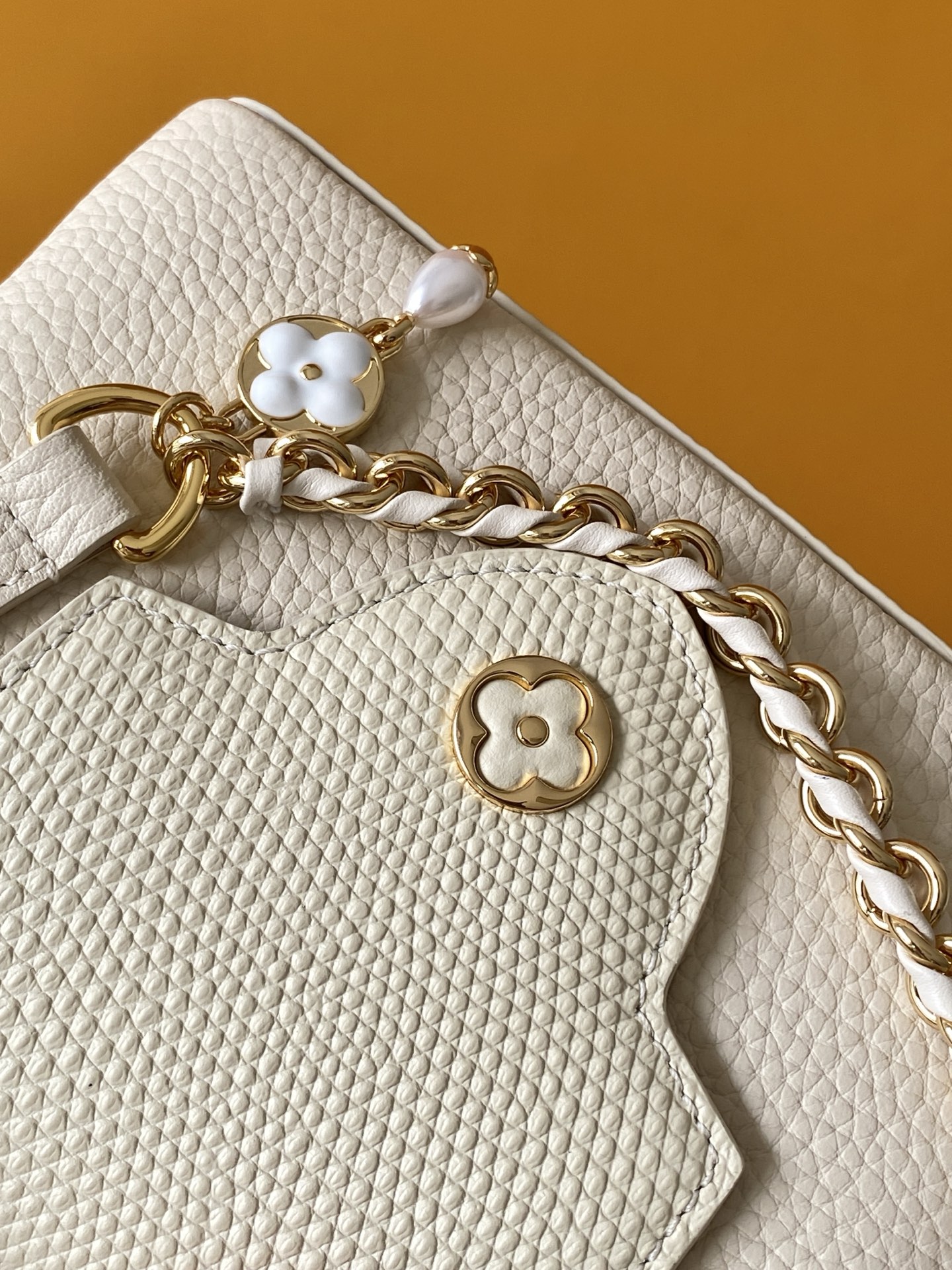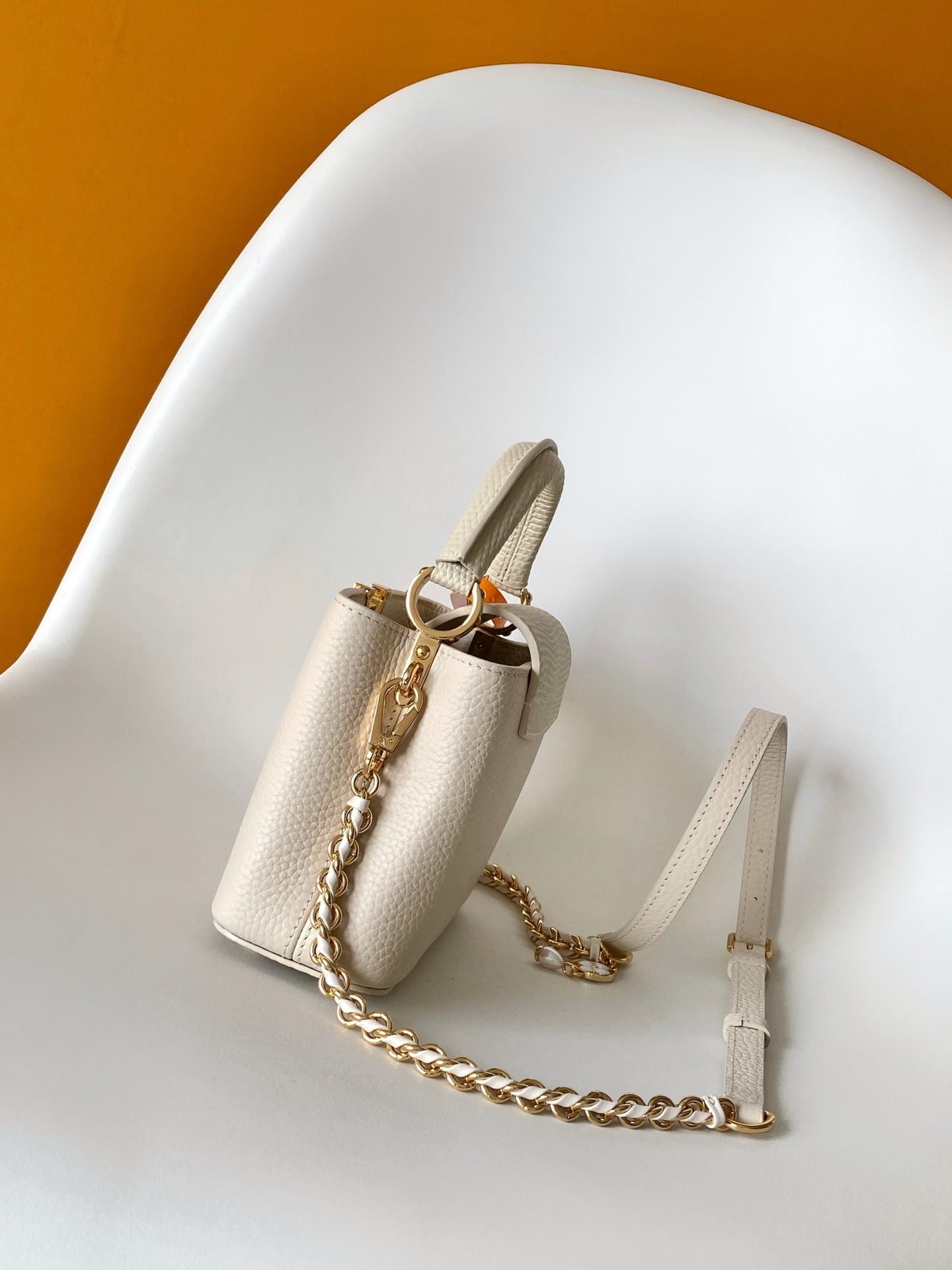 The Capucines Nano handbag in Taurillon leather, with a shell-like trim and iconic Louis Vuitton letters, is perfect for carrying wallets and small items.