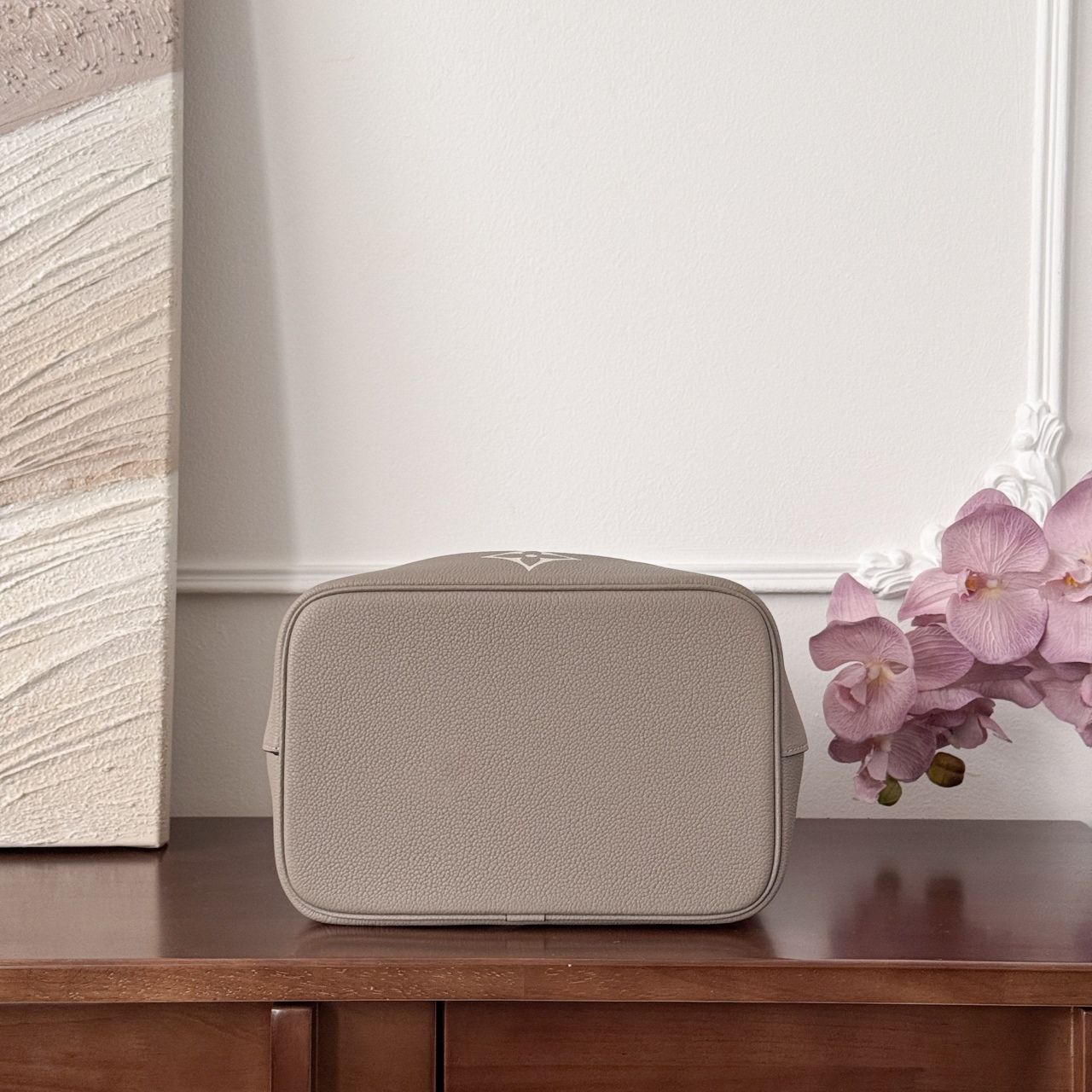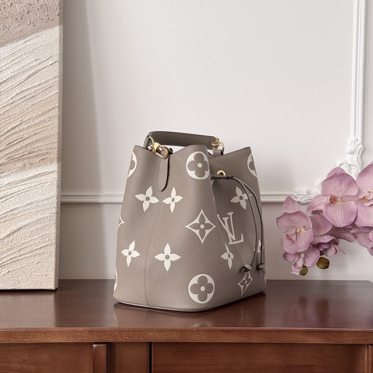 The Louis Vuitton Neonoe bucket bag in elephant gray. Versatile for shoulder or hand carry, perfect for work or leisure, a daily essential for urban women.
