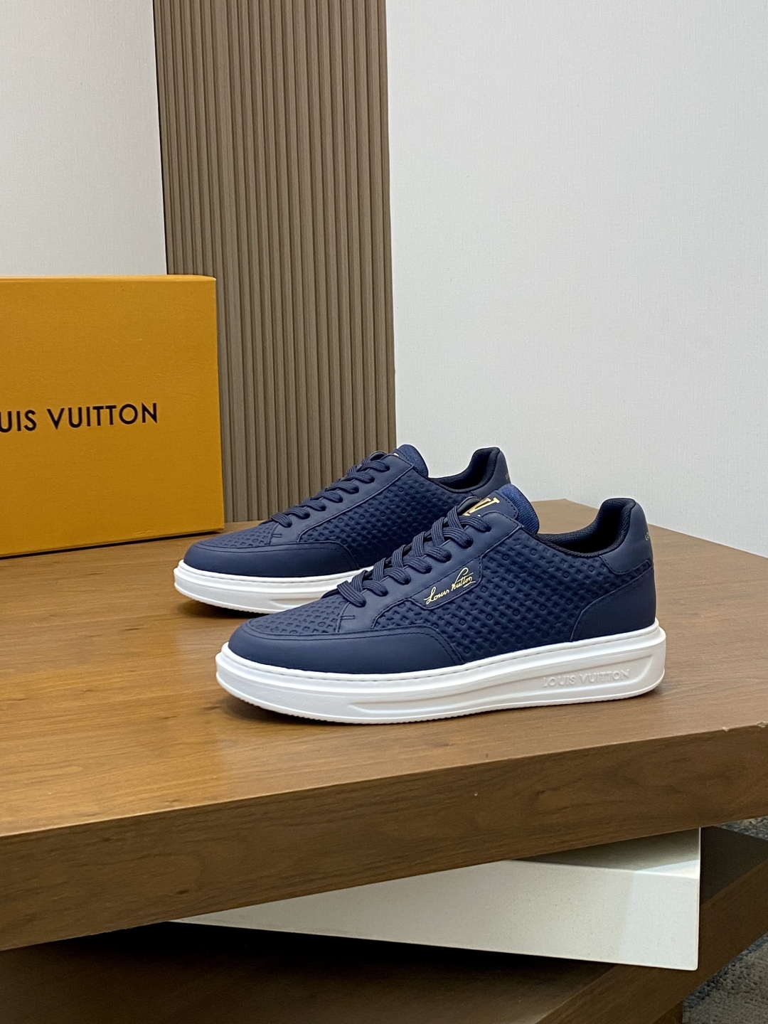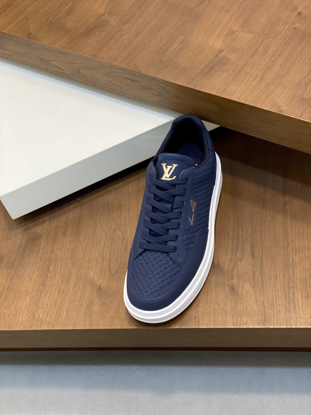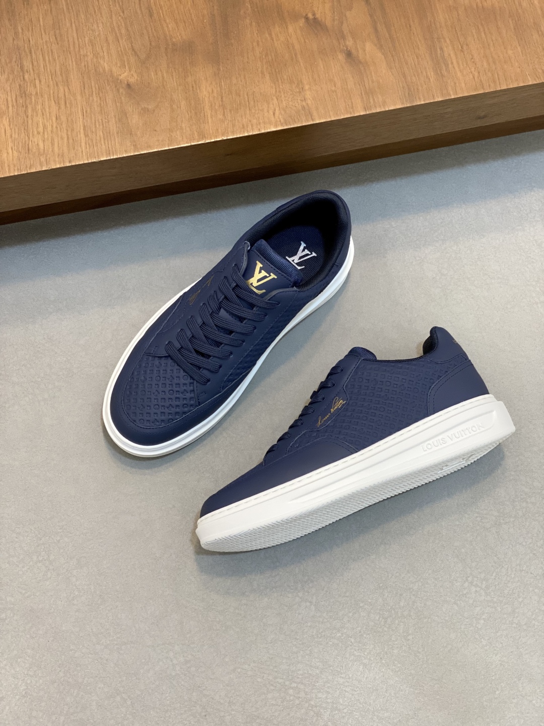 Step out in style with these Louis Vuitton sneakers. Crafted from premium leather, these navy shoes offer comfort and a touch of luxury. Perfect for everyday wear.