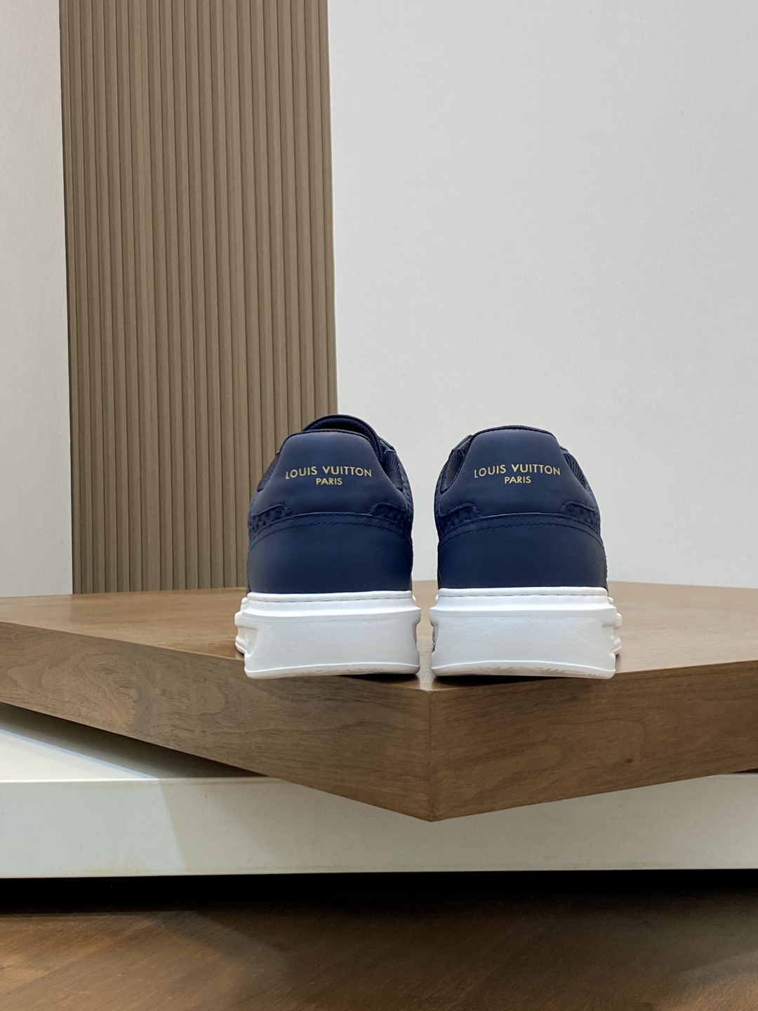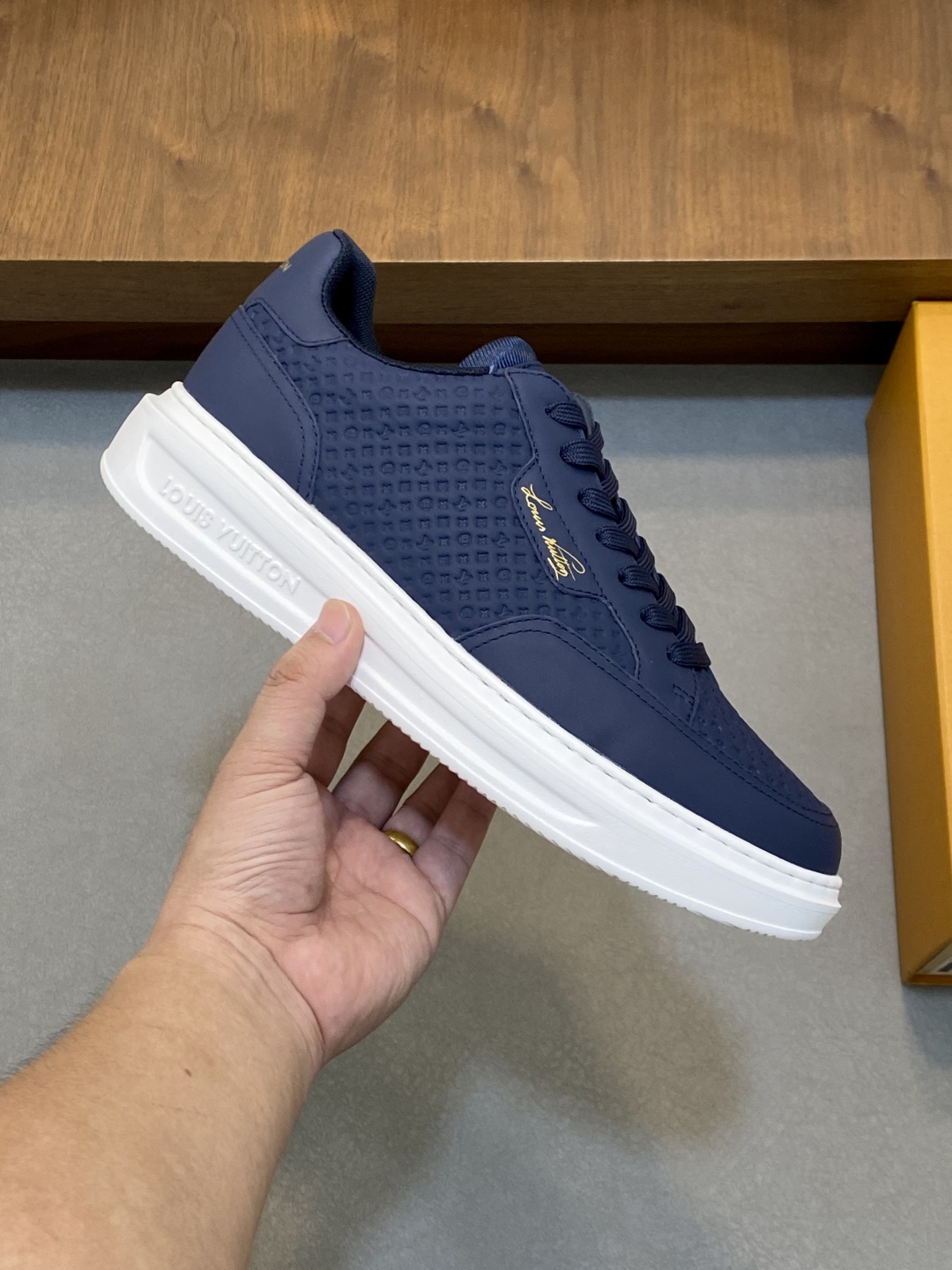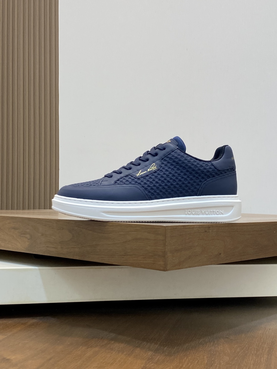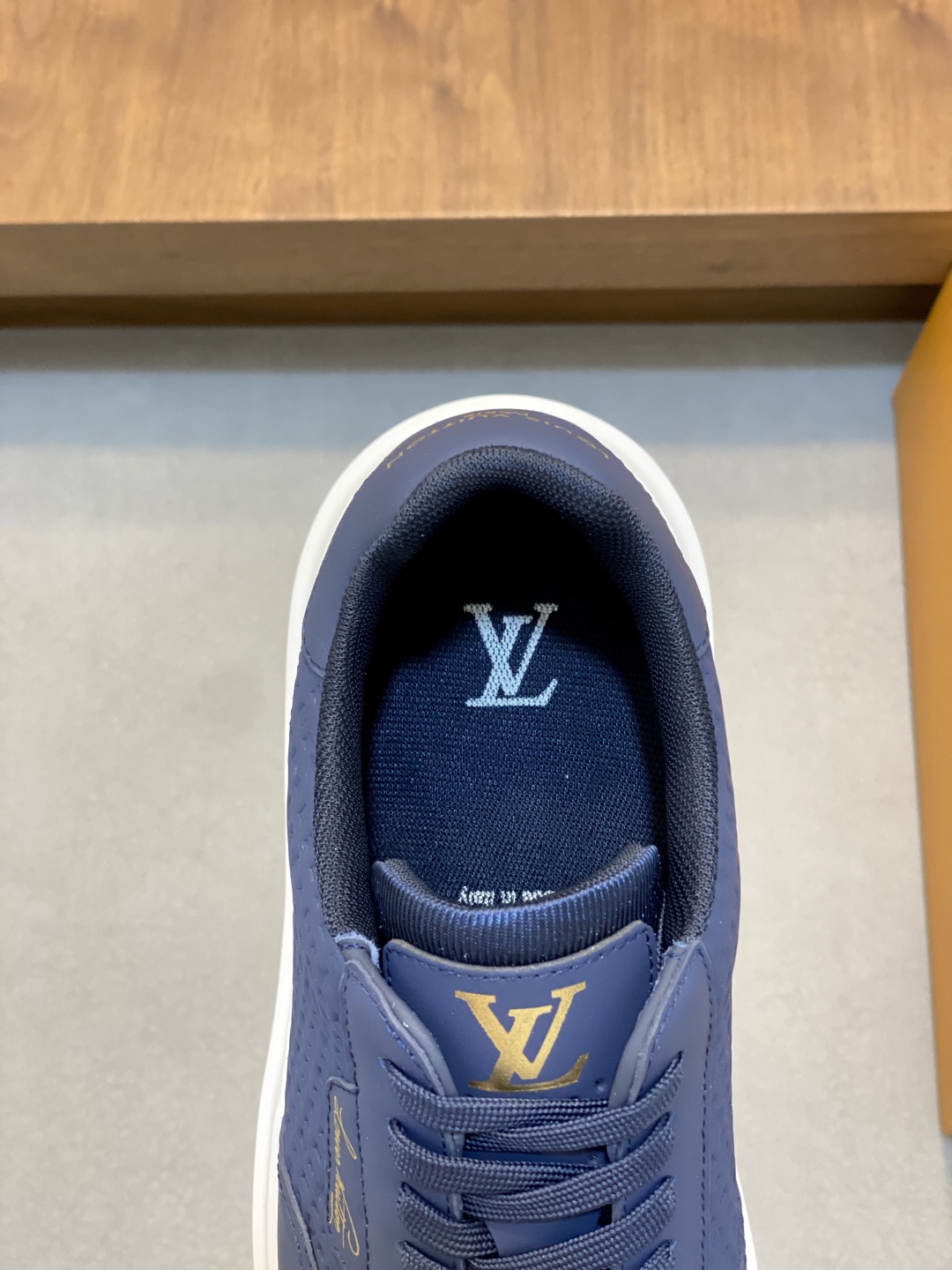 Step out in style with these Louis Vuitton sneakers. Crafted from premium leather, these navy shoes offer comfort and a touch of luxury. Perfect for everyday wear.