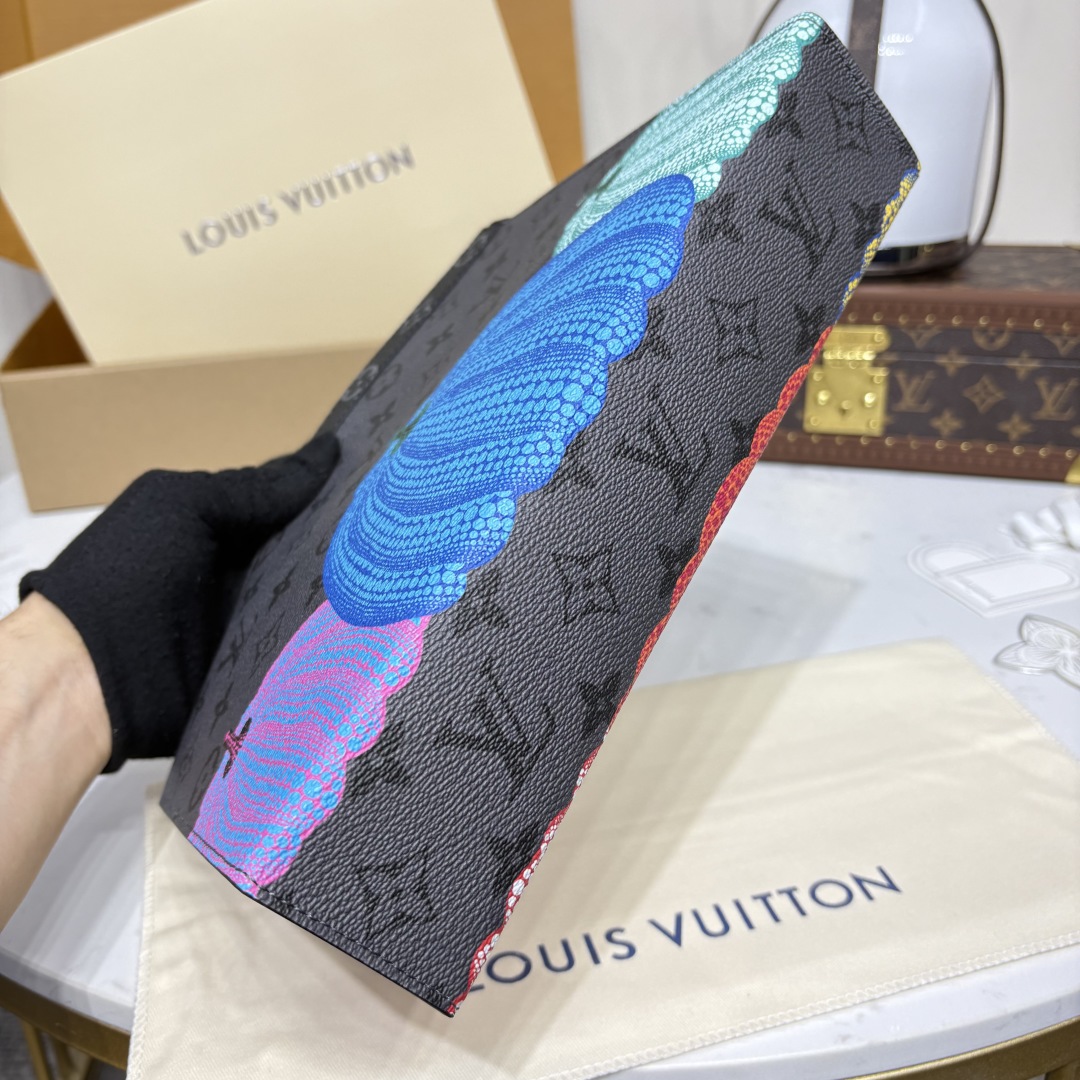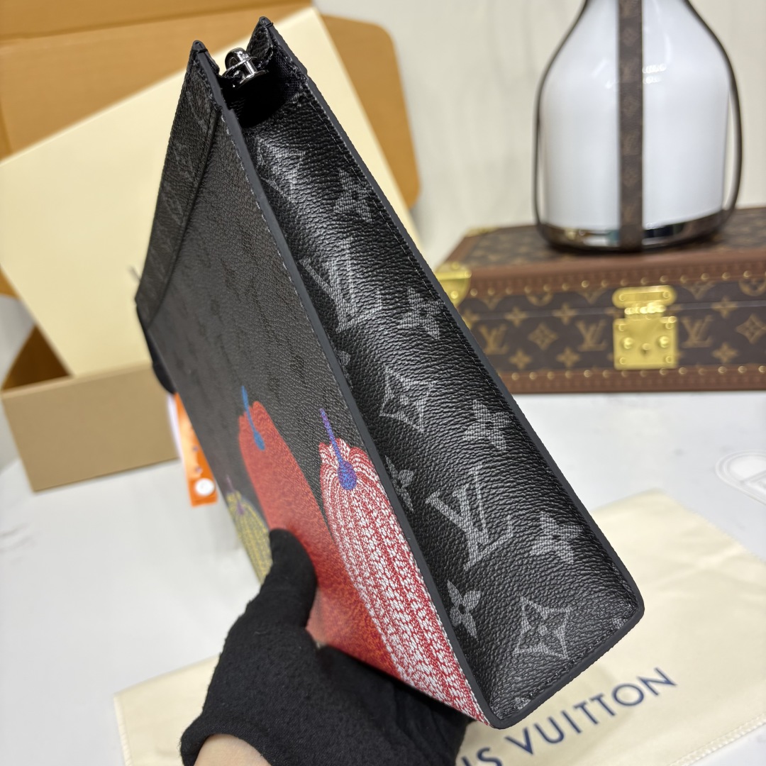 Introducing the Louis Vuitton Pochette Voyage Medium Clutch Bag, a stylish and functional accessory inspired by the iconic artwork of Japanese artist Yayoi Kusama. This clutch combines luxury craftsmanship with a unique design, making it a standout piece in any collection.