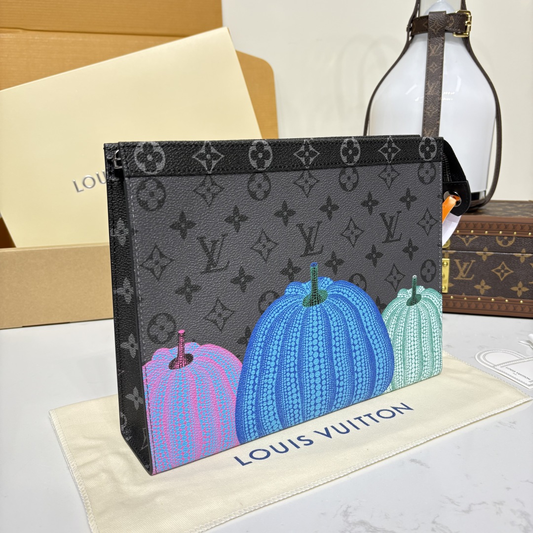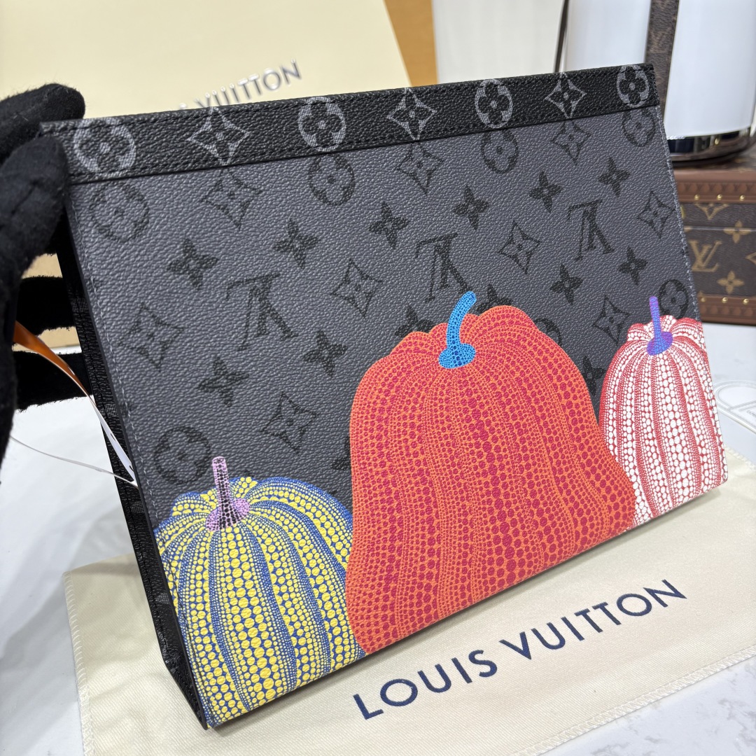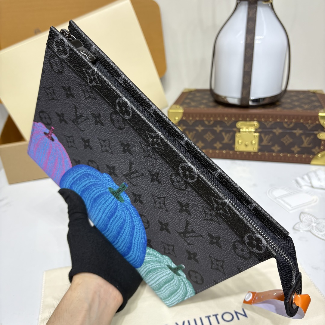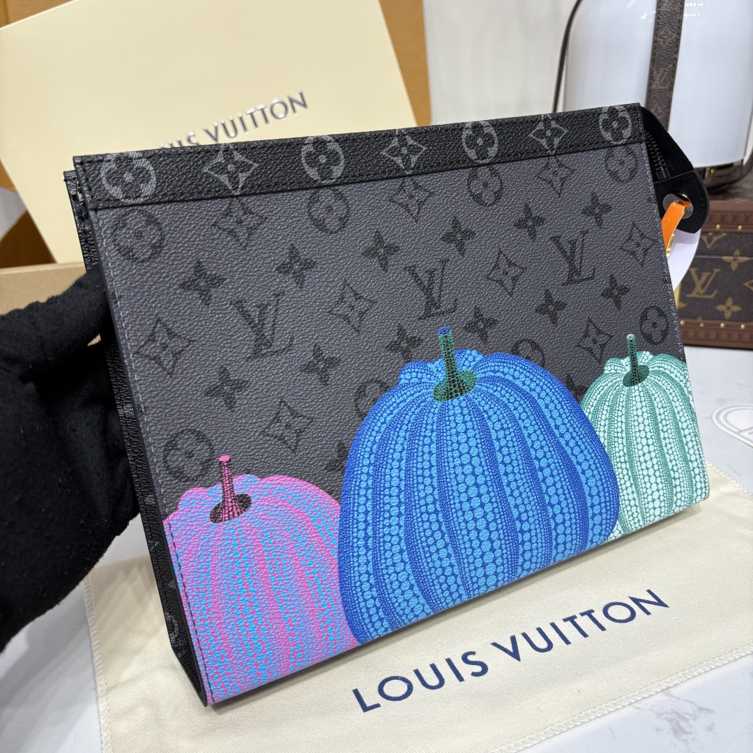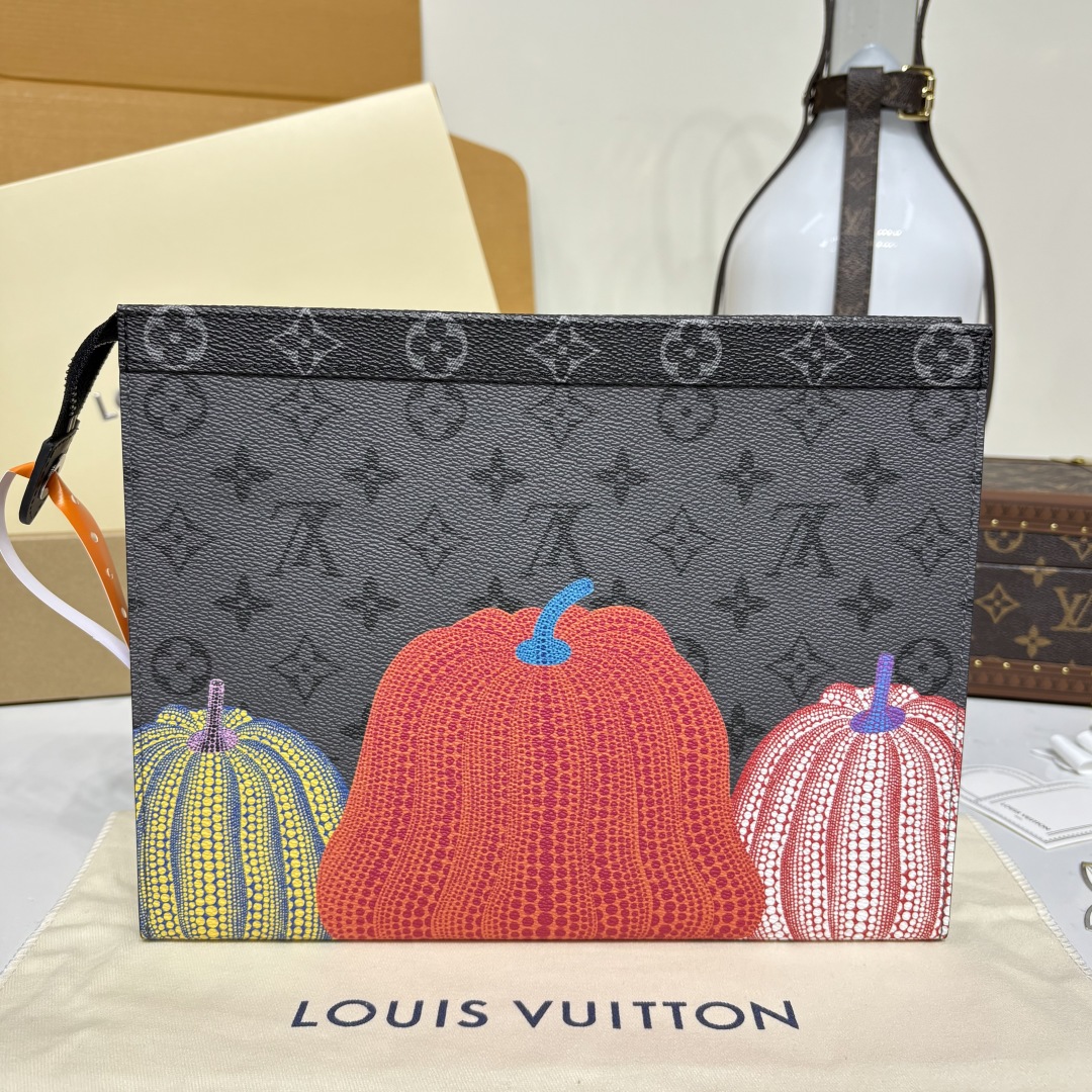 The Louis Vuitton Pochette Voyage Medium Clutch Bag features a design inspired by Yayoi Kusama's iconic pumpkin motif. Ideal for carrying essentials.