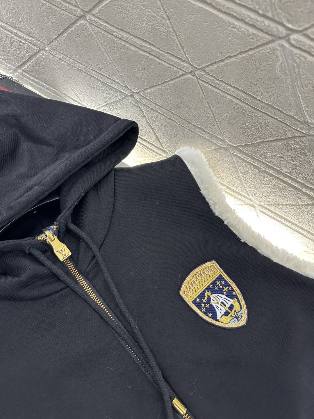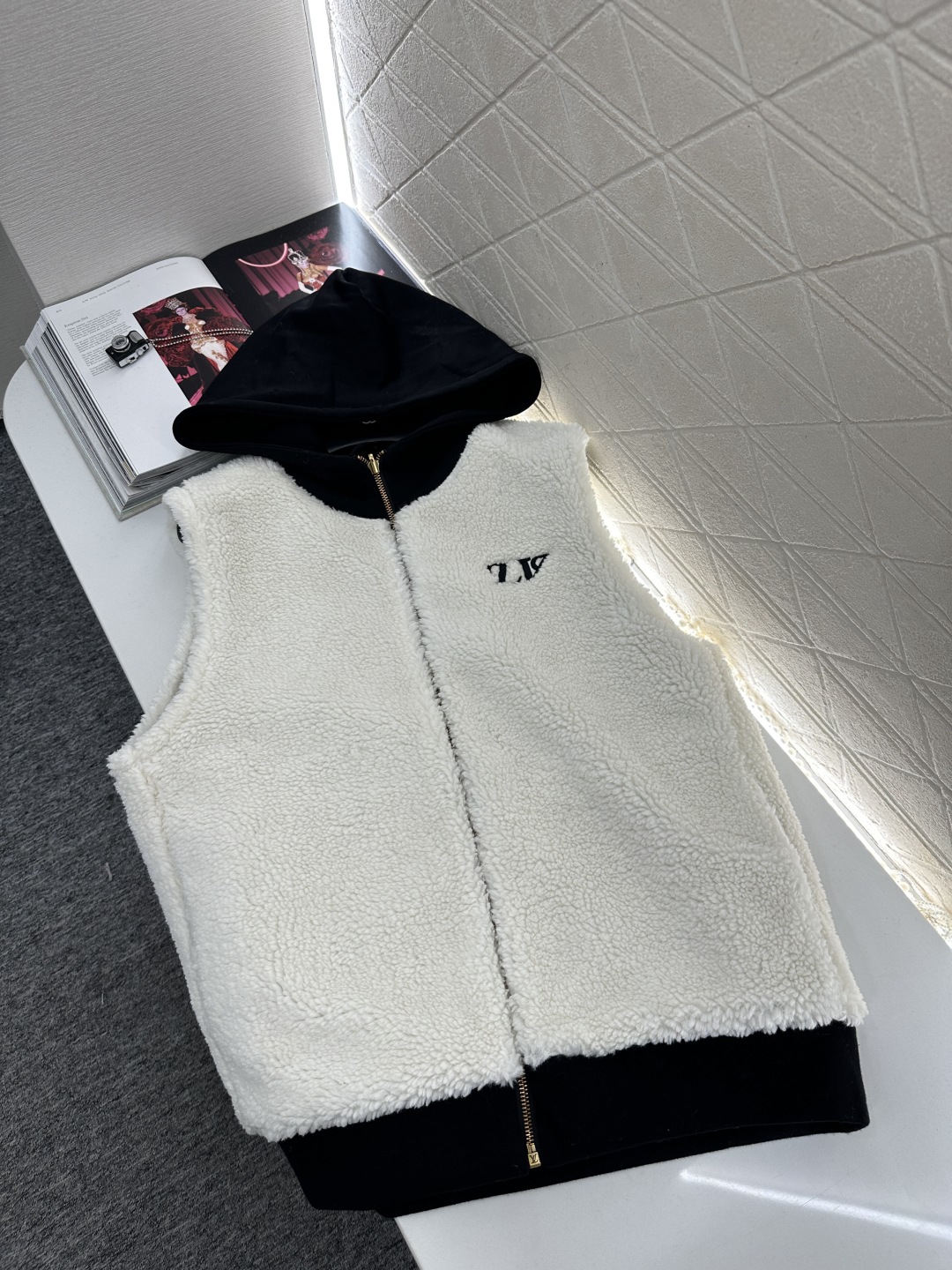Stay cozy and chic with this reversible Louis Vuitton teddy fleece vest. Features soft lamb wool, a hood, and a classic logo. Perfect for layering!