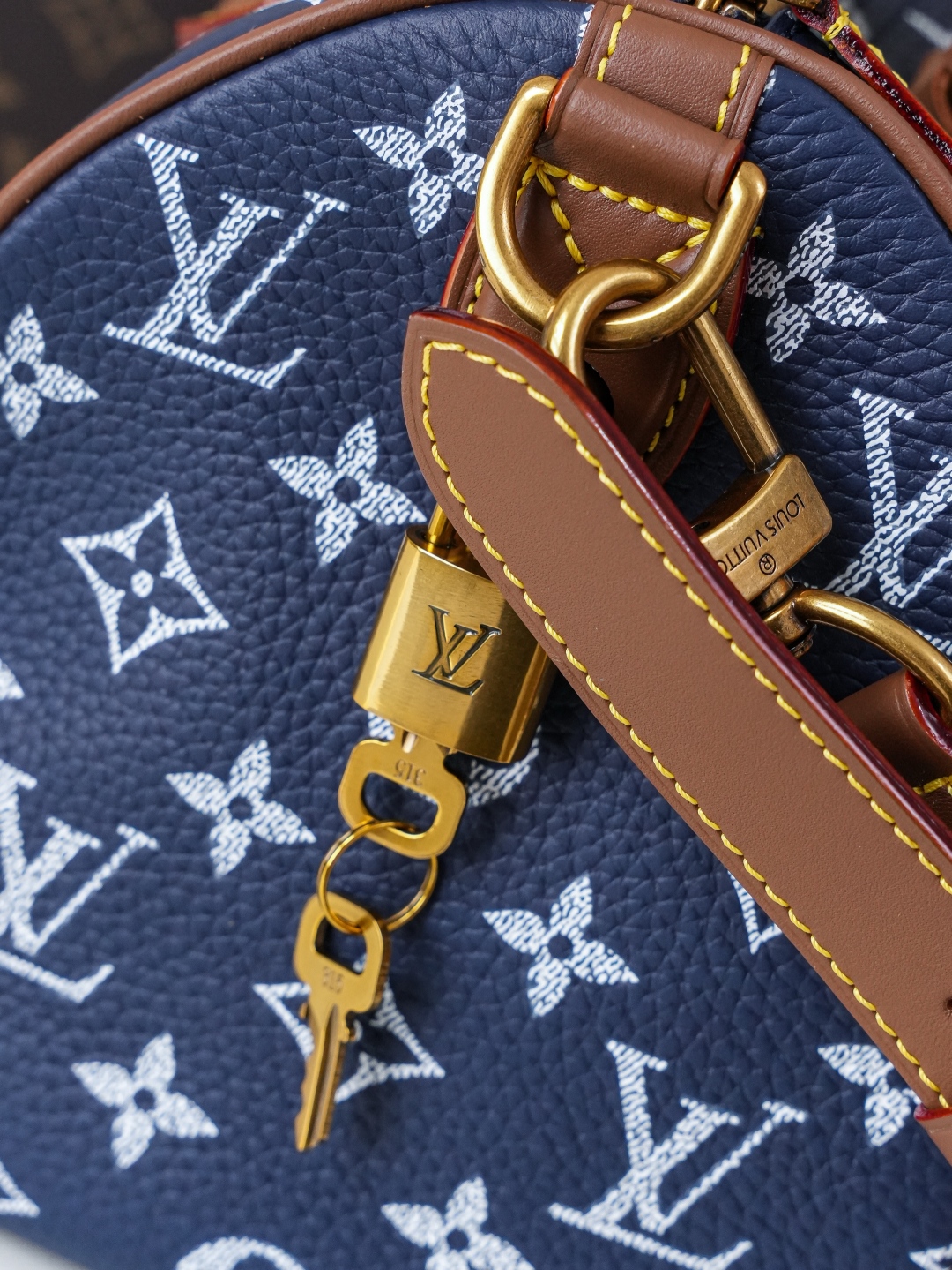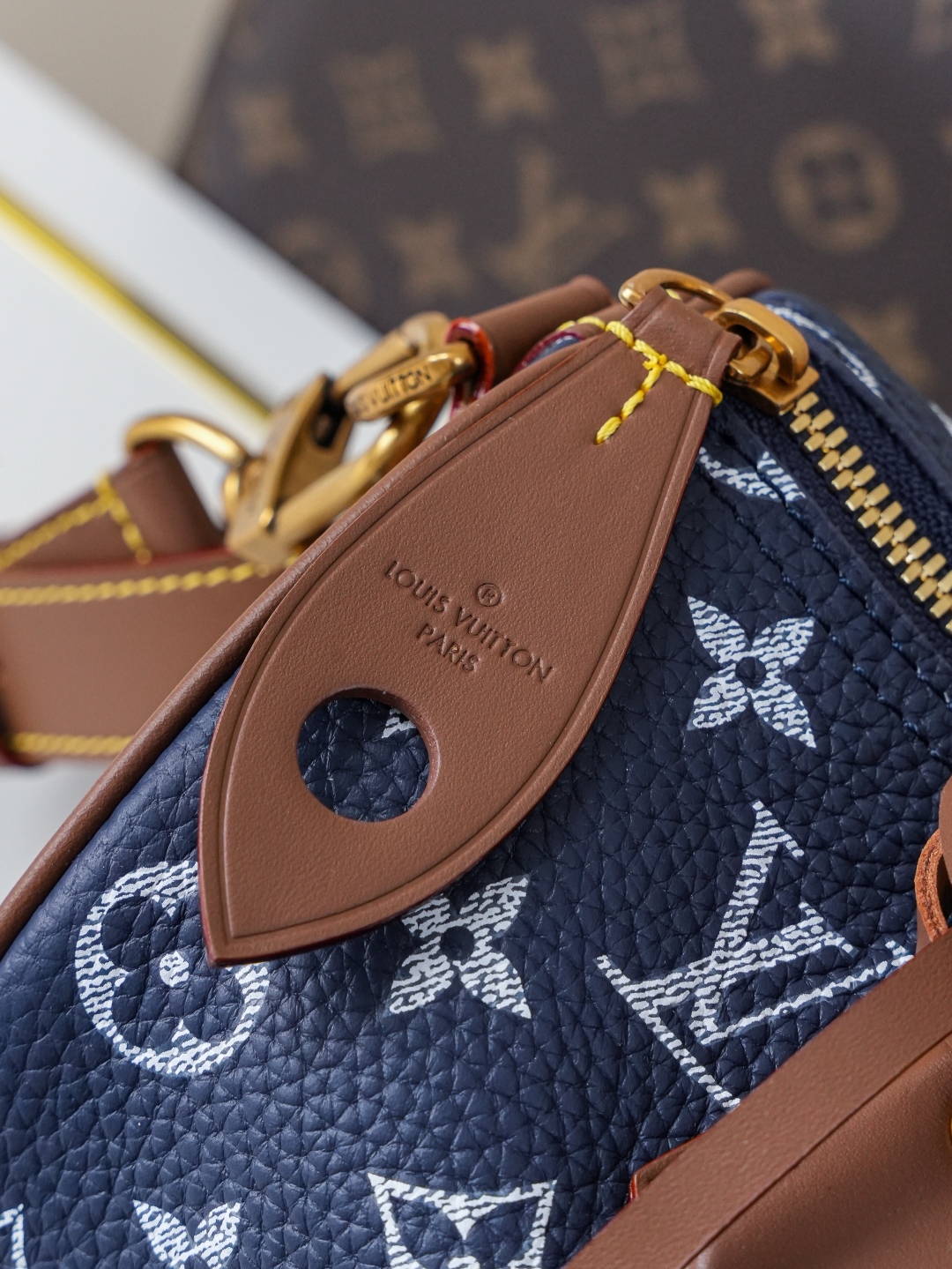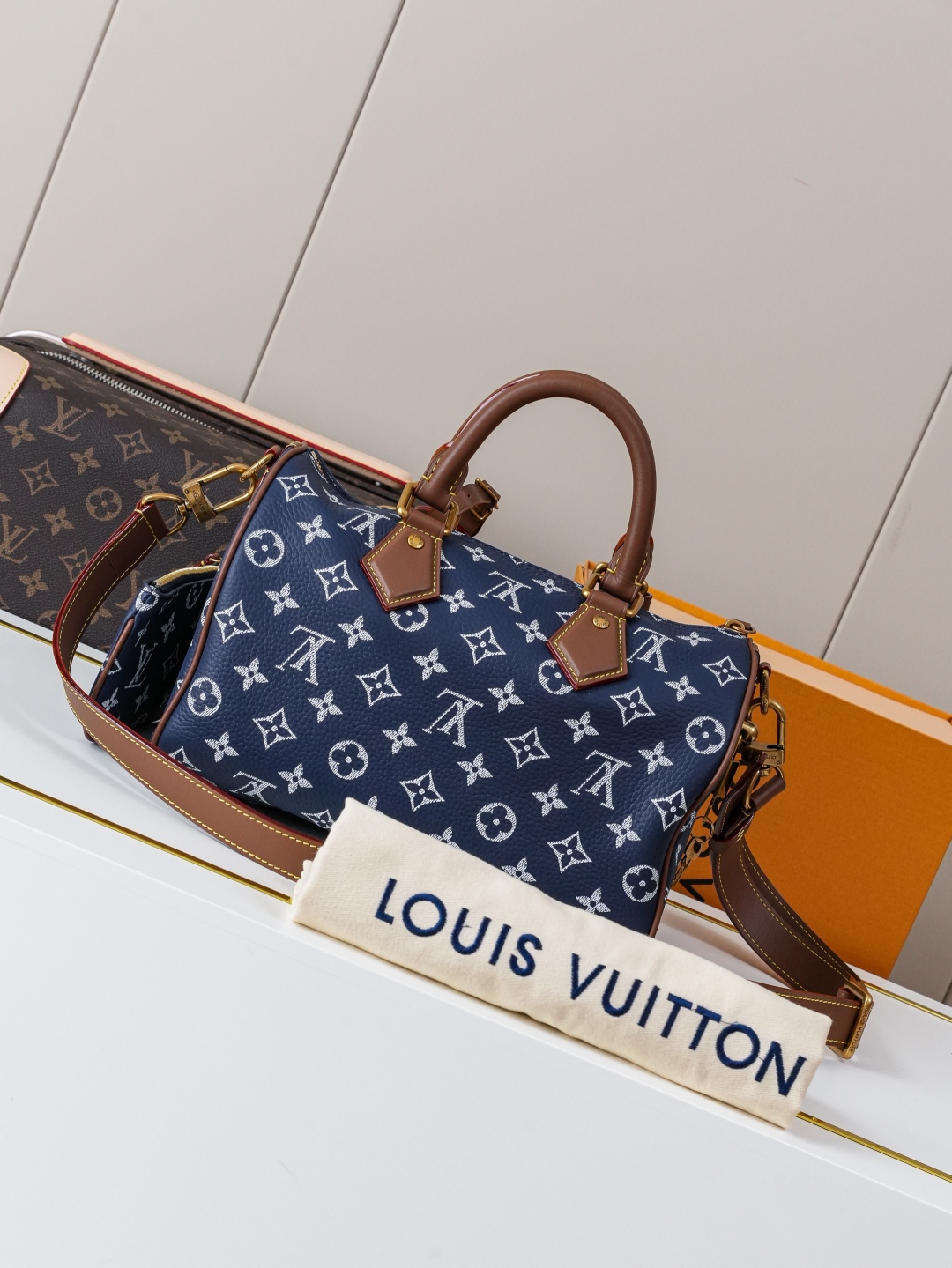 Tags: Designer Top Handle Bag, Louis Vuitton Speedy, Luxury Blue Handbag, Monogram Leather Handbag, Shoulder Bag With Strap