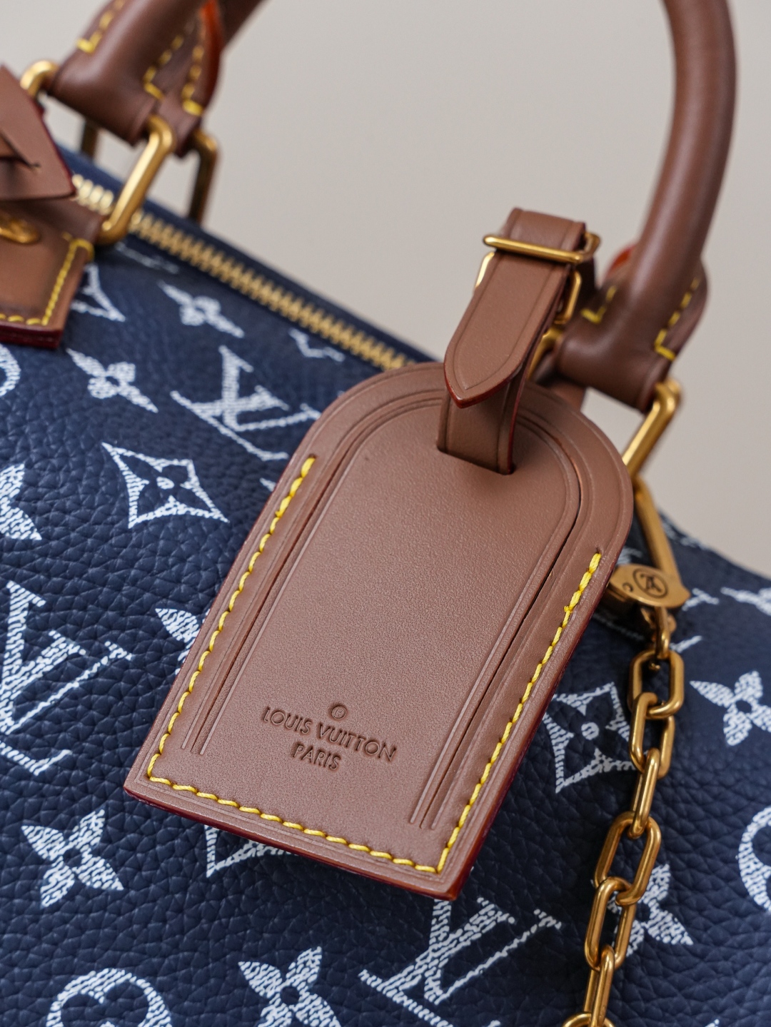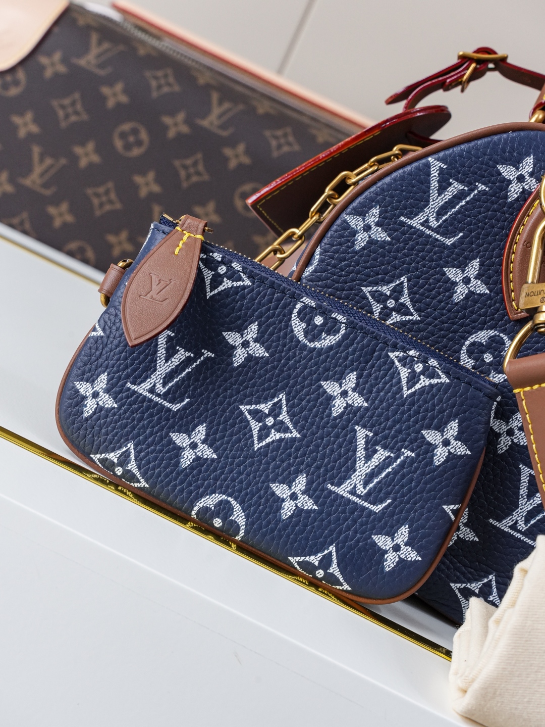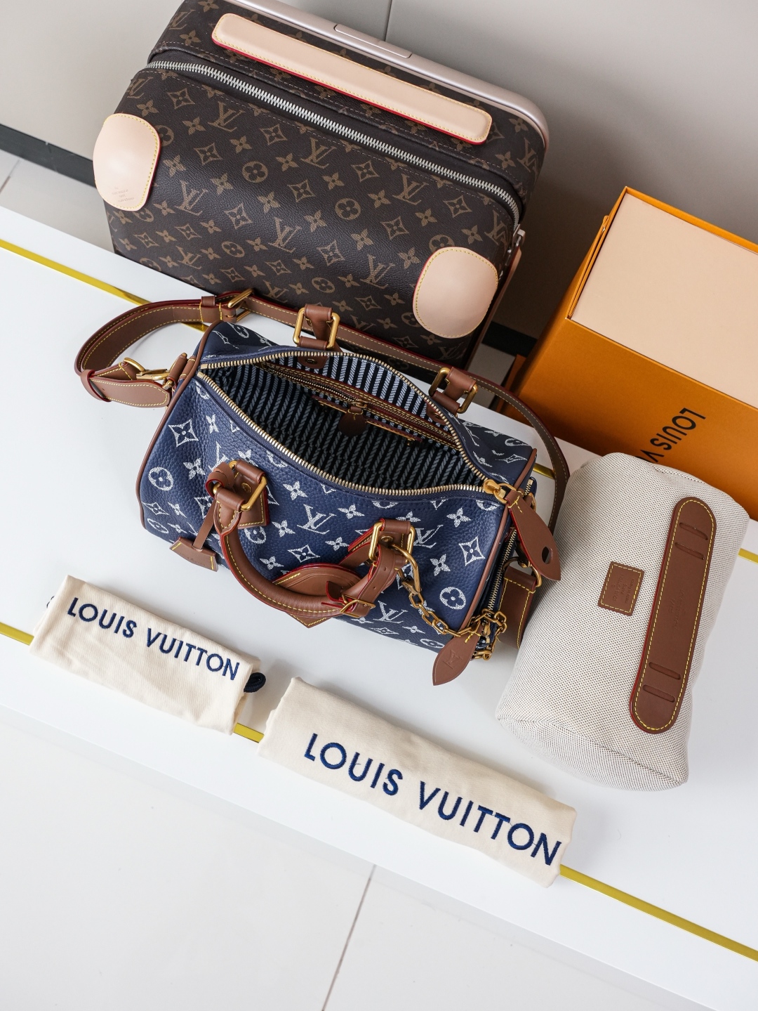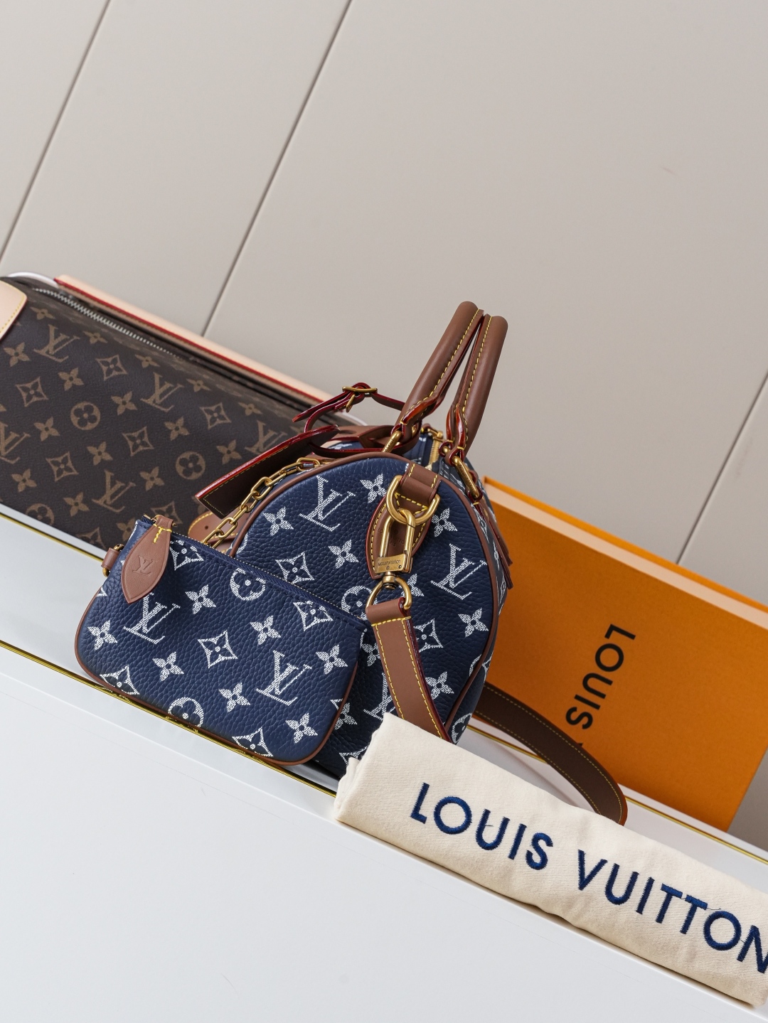 Tags: Designer Top Handle Bag, Louis Vuitton Speedy, Luxury Blue Handbag, Monogram Leather Handbag, Shoulder Bag With Strap
