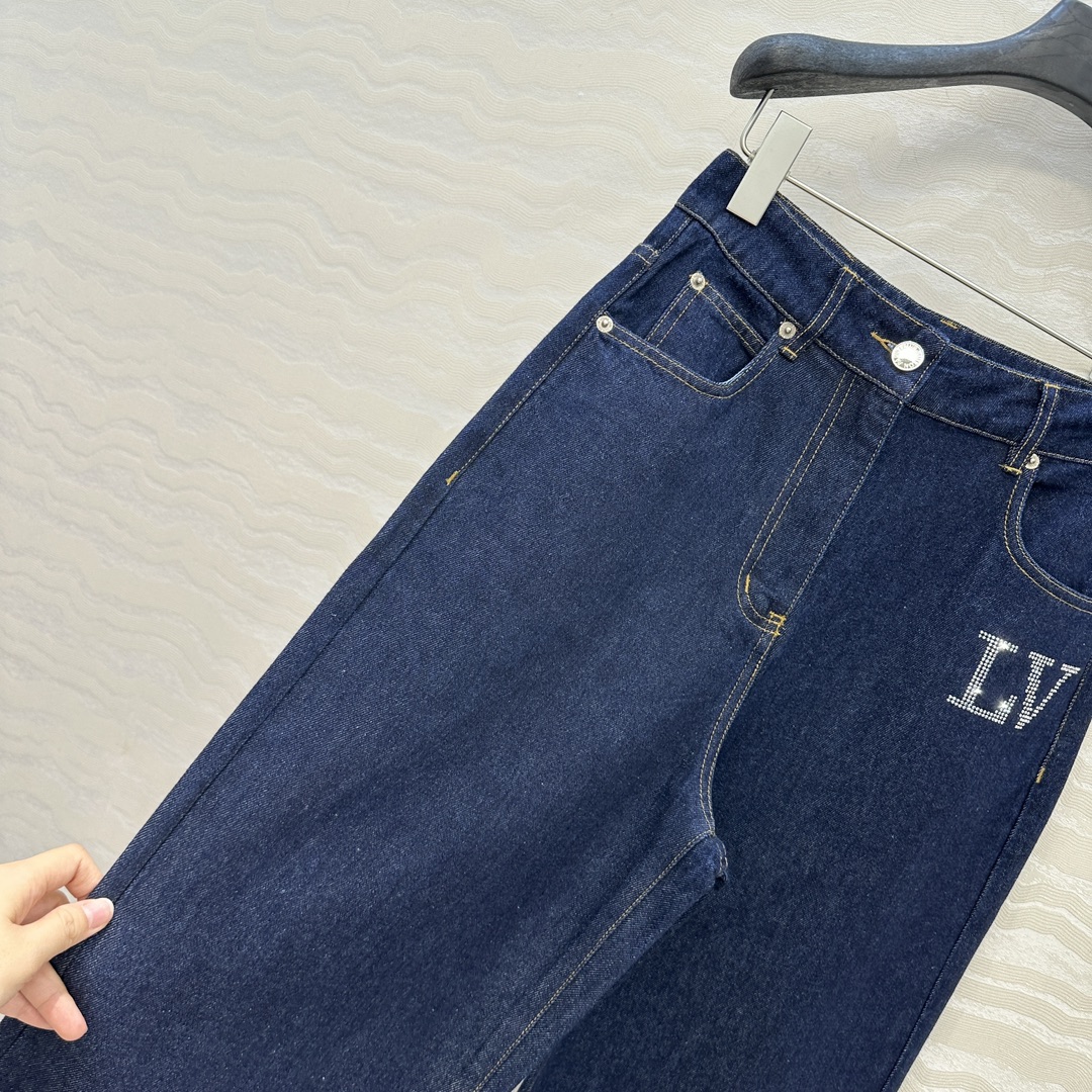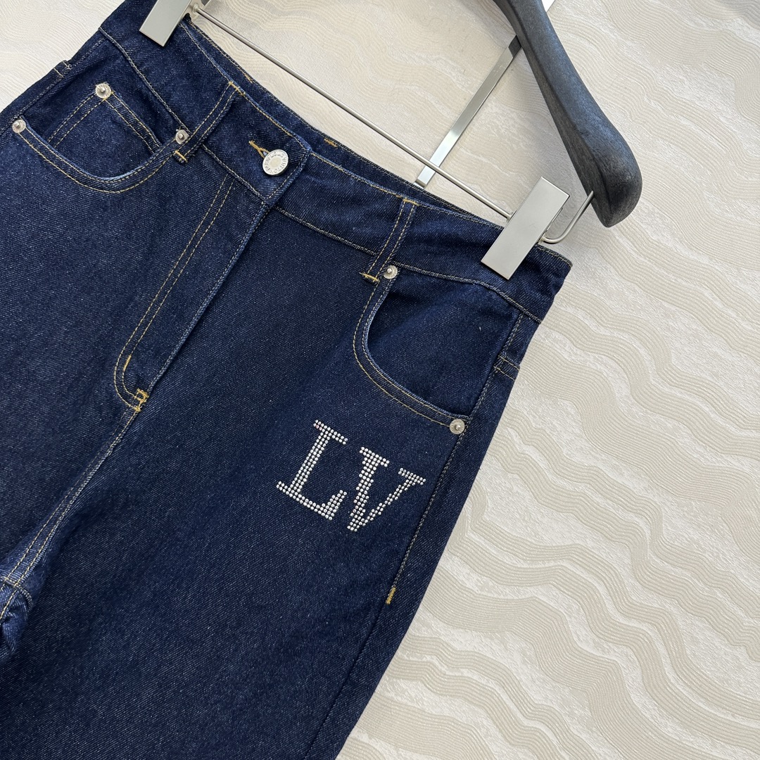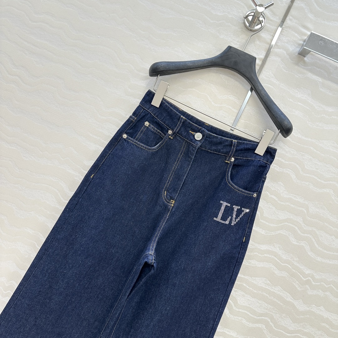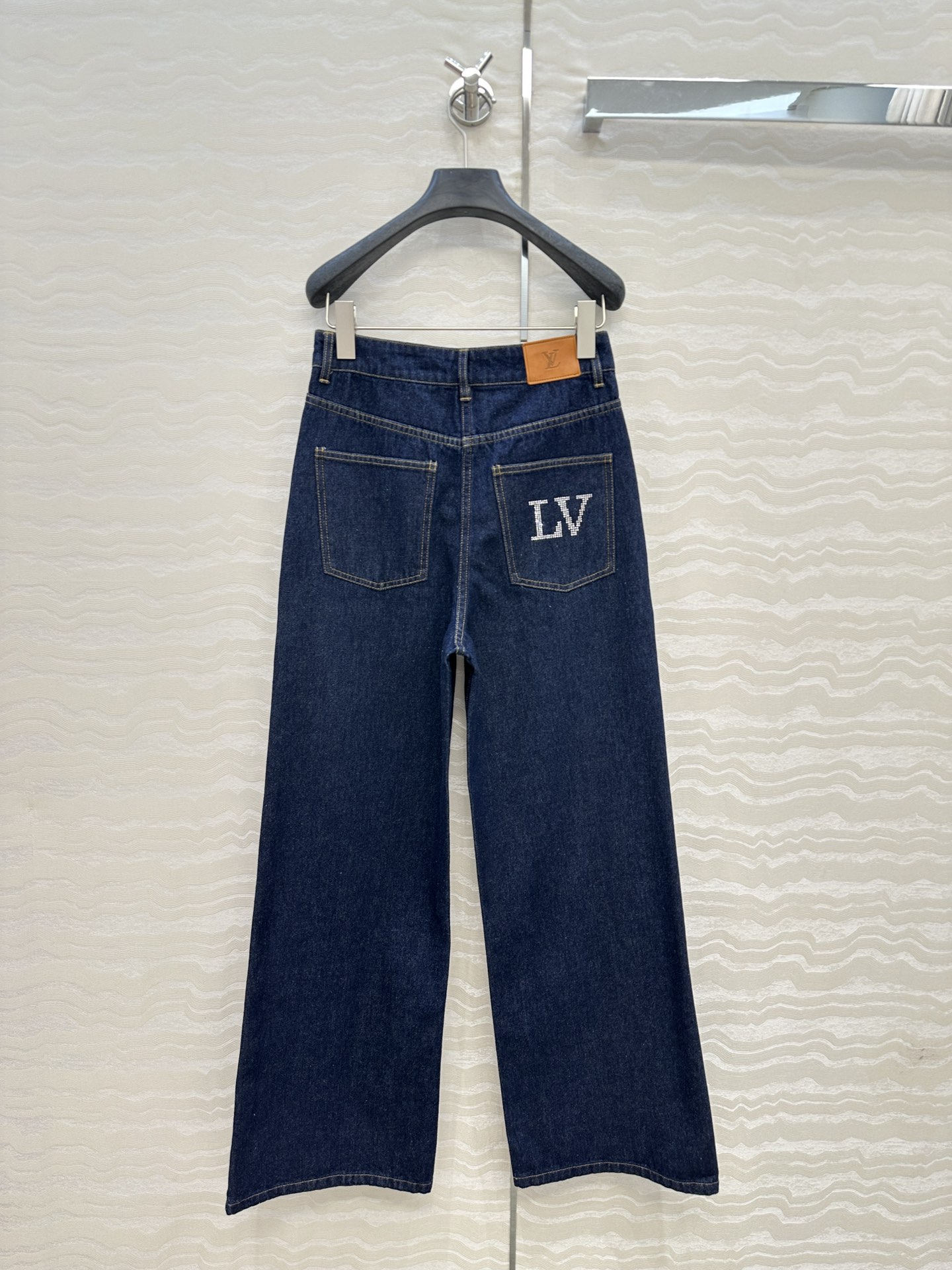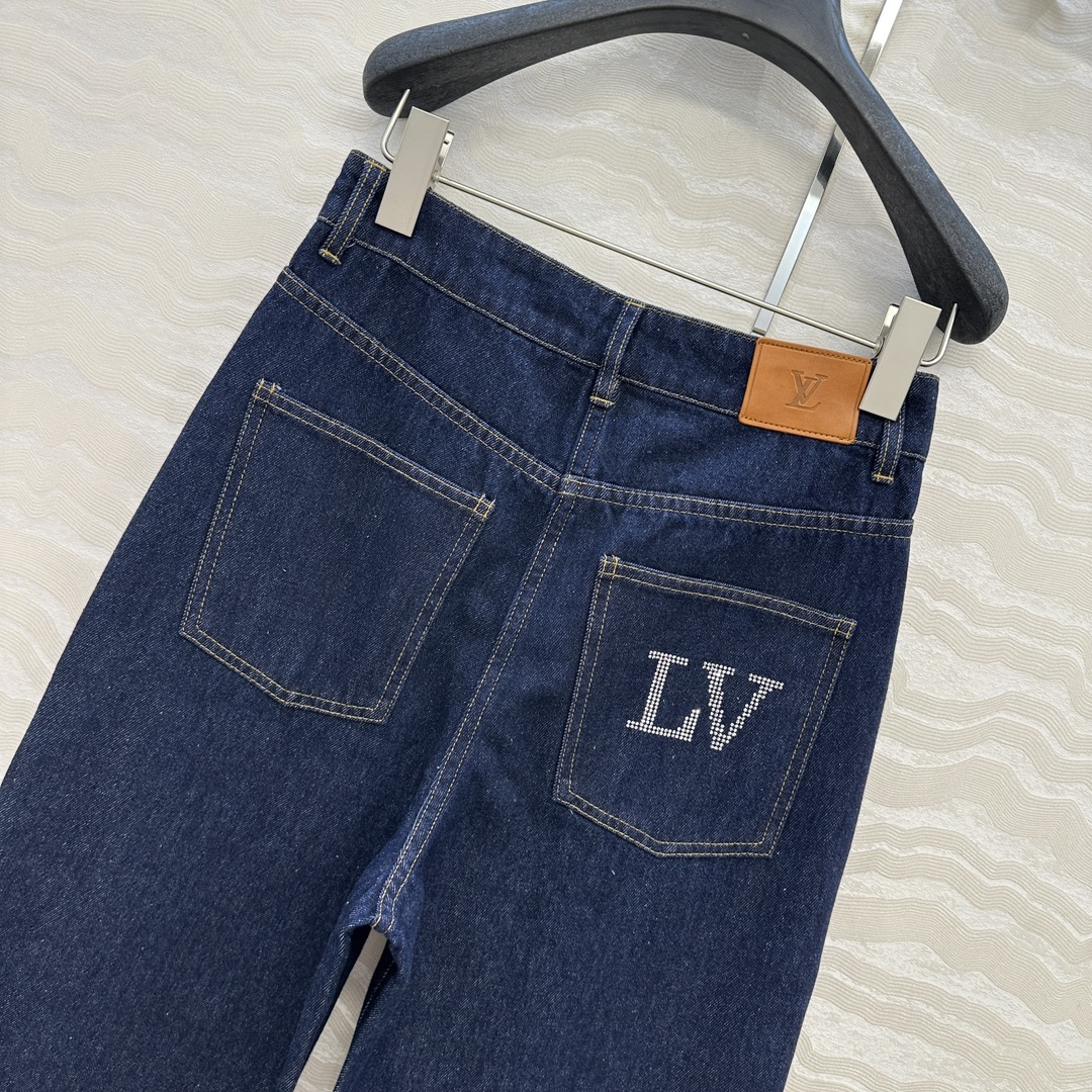These Lousiv25s Bourgeoise series denim jeans are a must-have for any fashion-forward wardrobe. Featuring a classic straight-leg design, these jeans are both stylish and comfortable. The original color denim material is complemented by a monogram logo with rhinestone detailing, adding a touch of luxury to your everyday look.