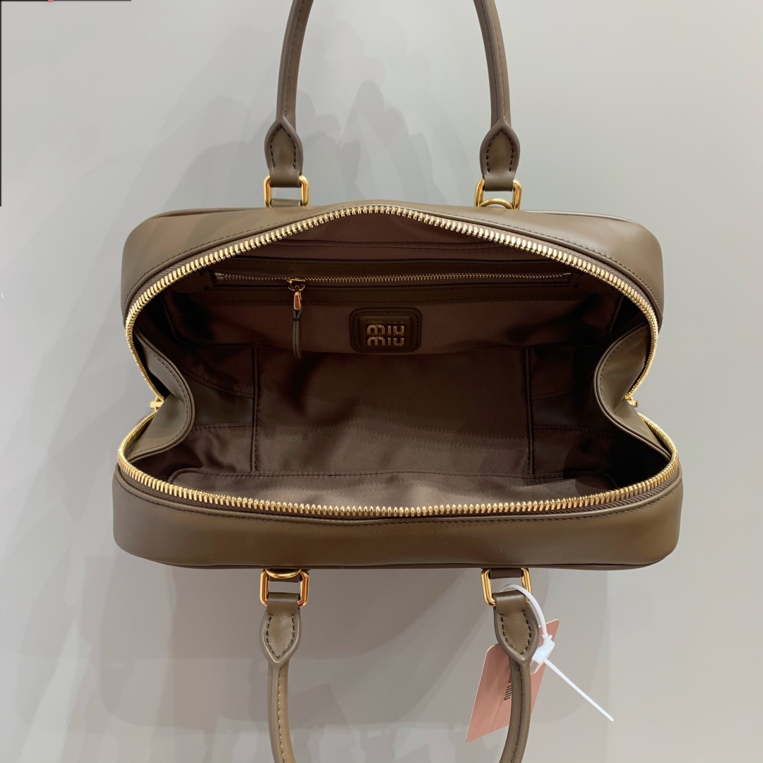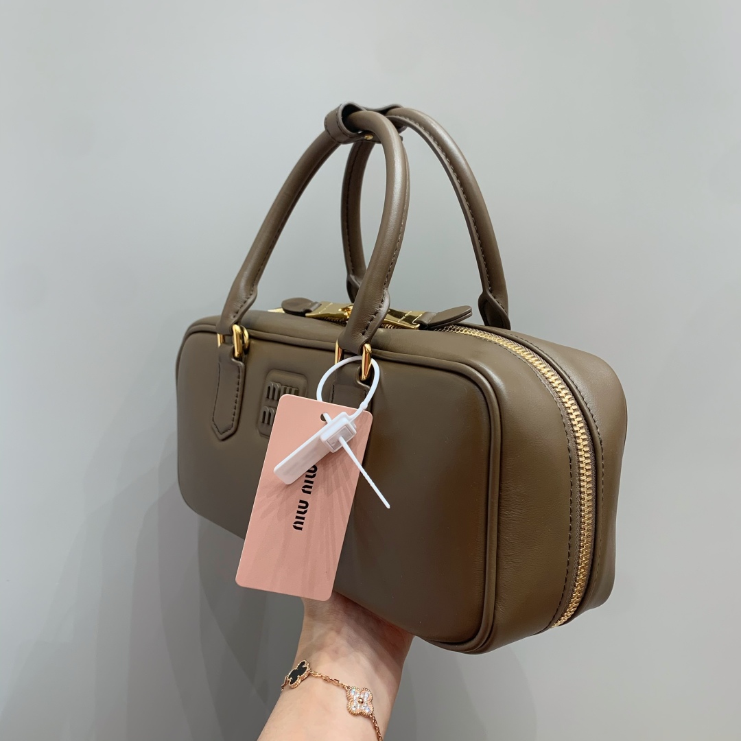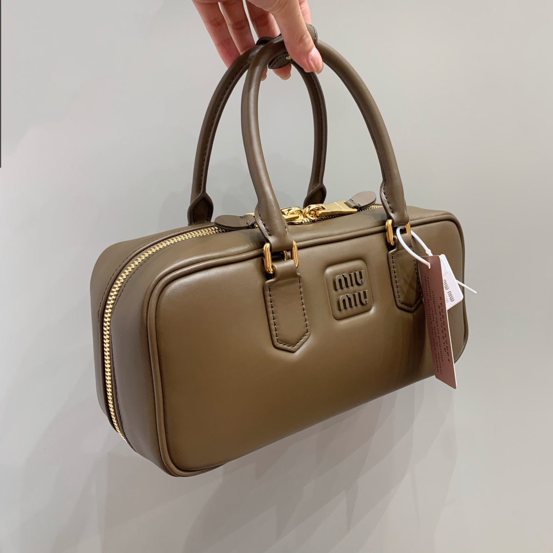 Tags: Designer Handbag, Gold Hardware Bag, Leather Satchel, Luxury Shoulder Bag, Miu Miu Bowling Bag, Tundra Color Bag