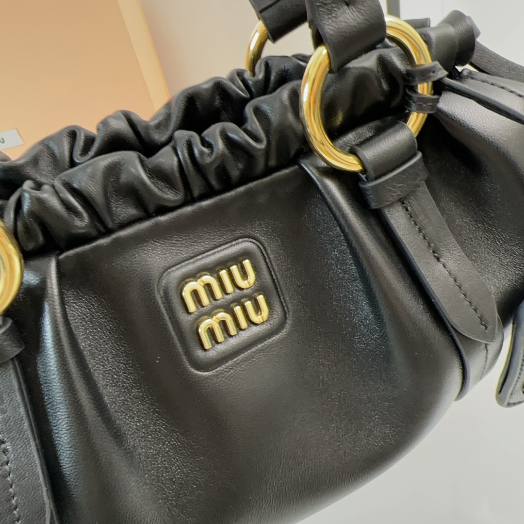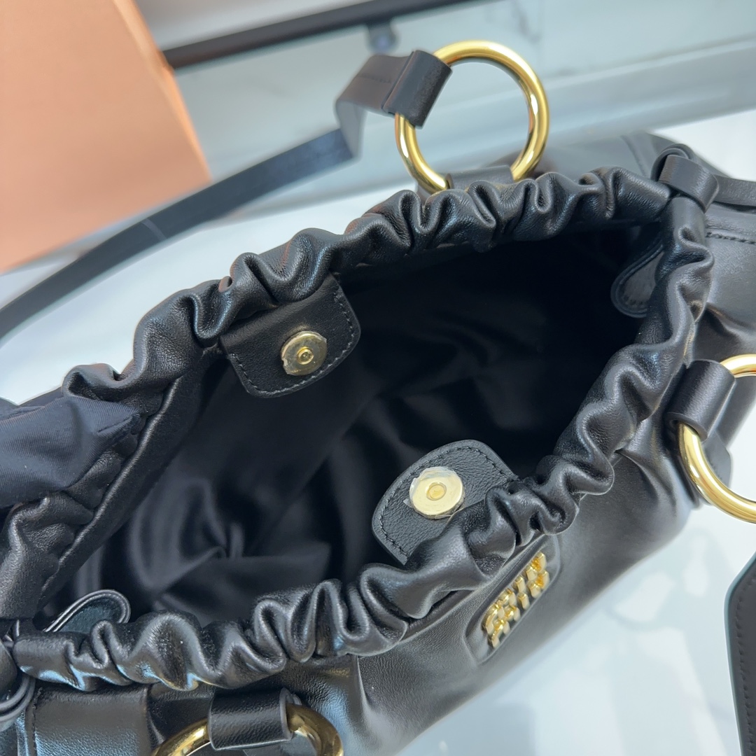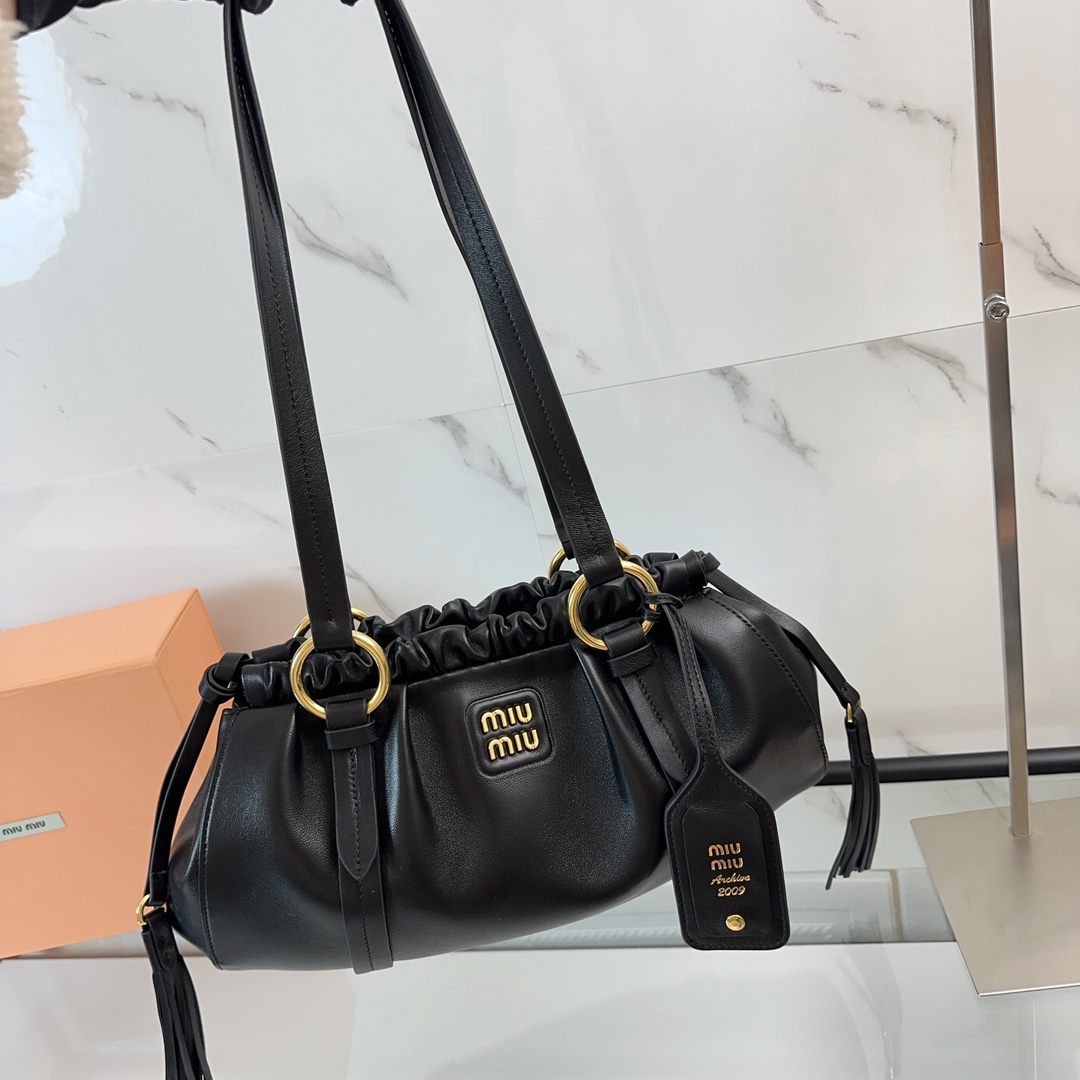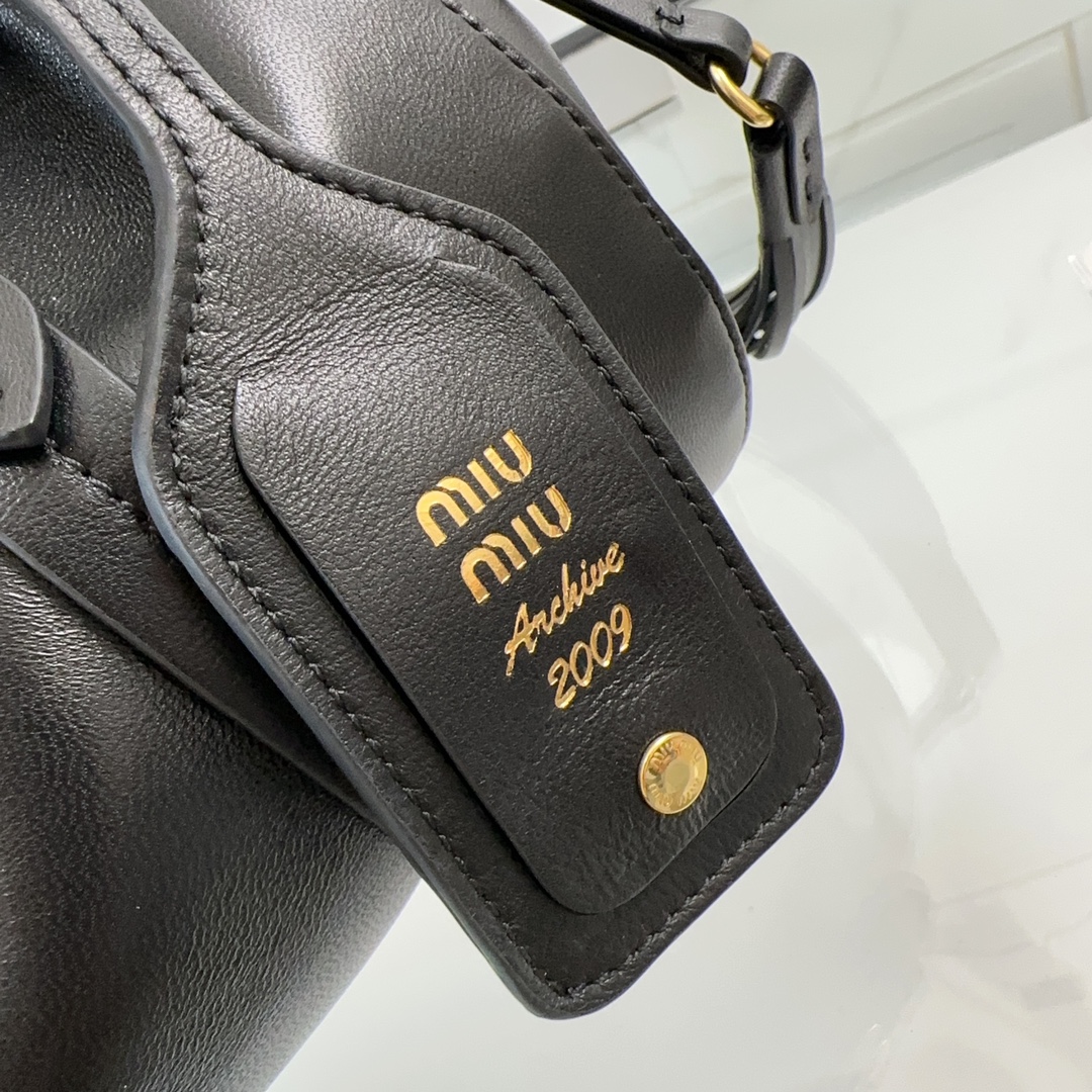 Miu Miu Black Archive Leather Hobo Bag with Drawstring and Gold Hardware