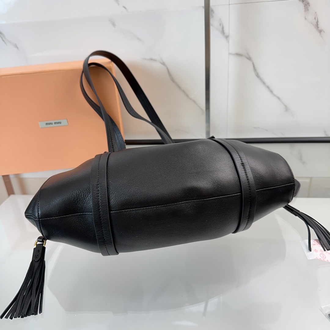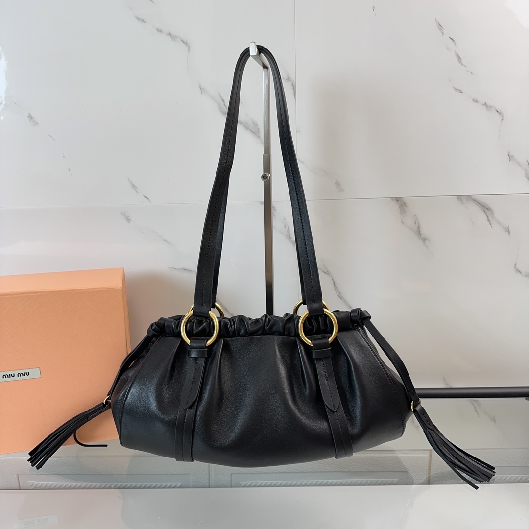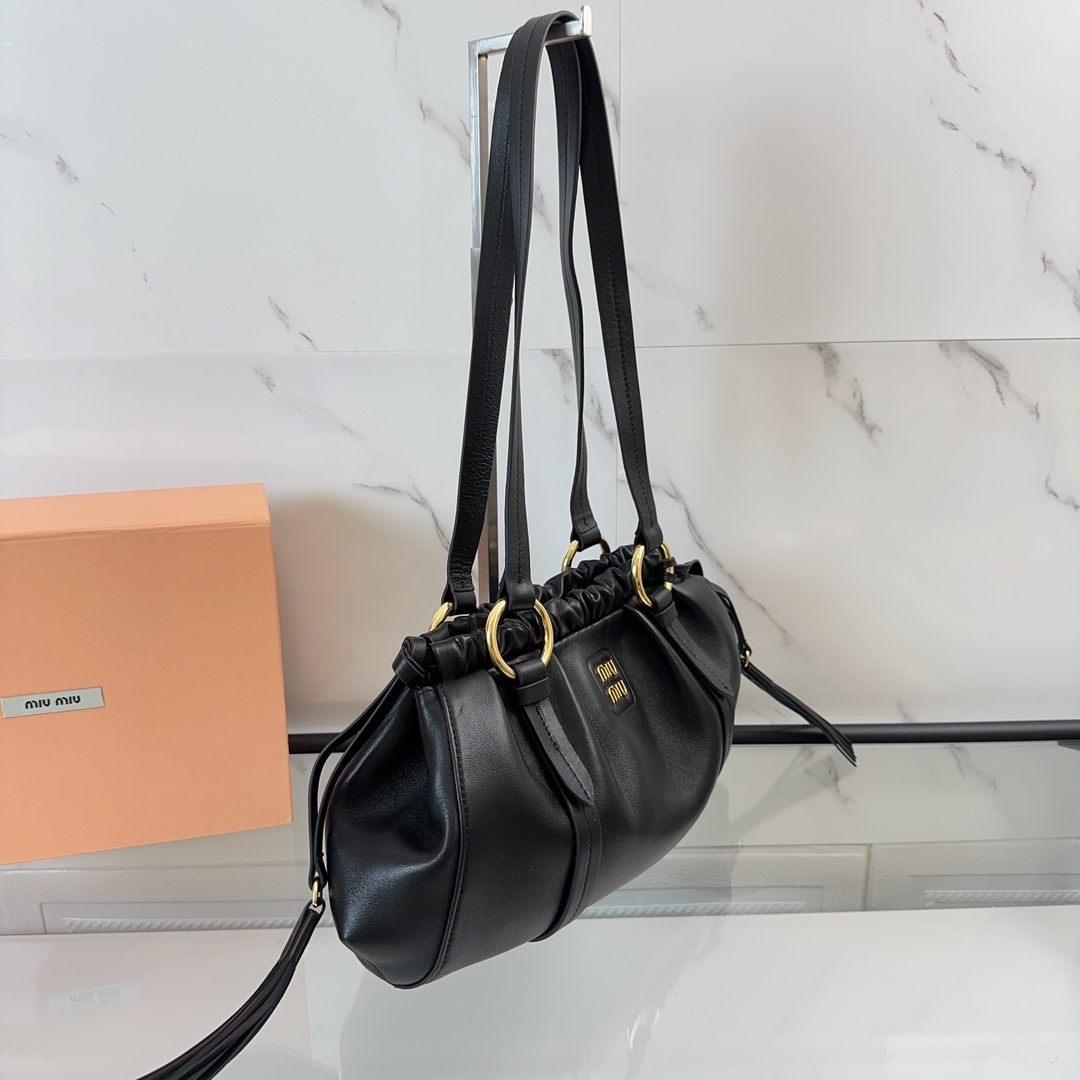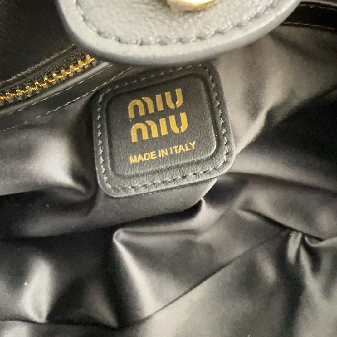 Miu Miu Black Archive Leather Hobo Bag with Drawstring and Gold Hardware
