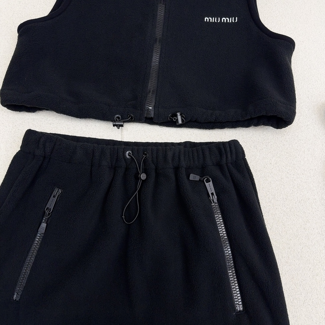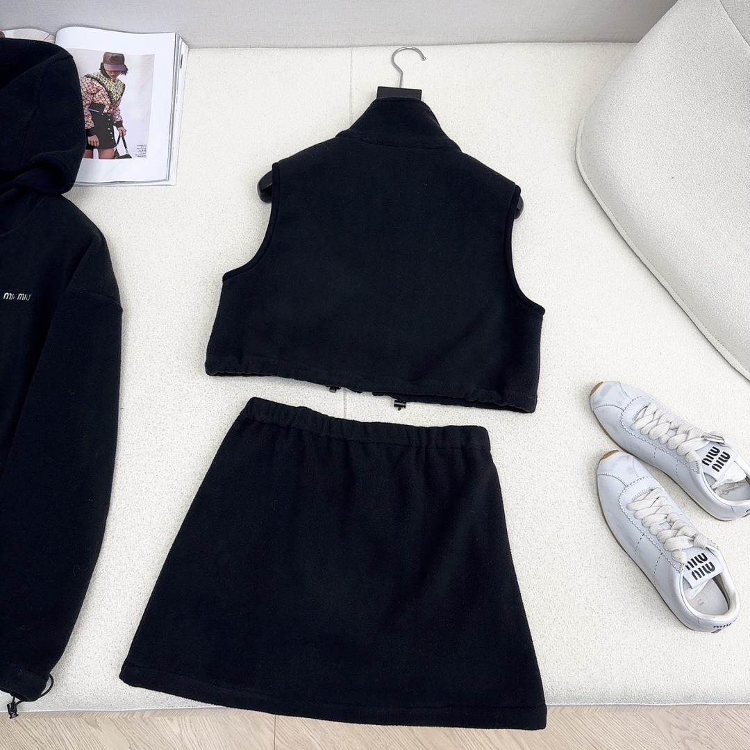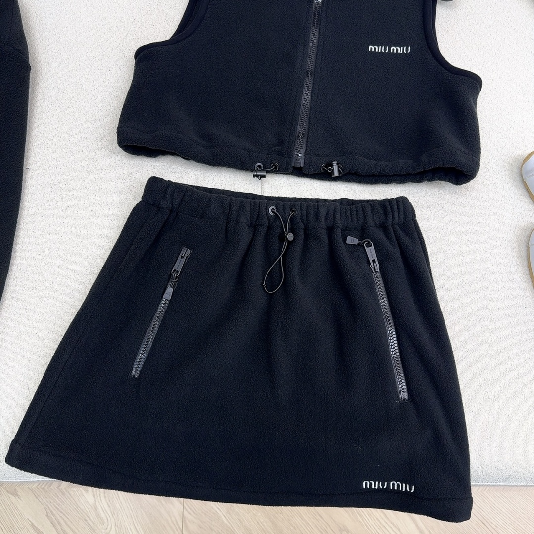 Get a youthful Miu Miu look with this cozy black fleece set. Includes a hoodie, vest, and mini skirt for versatile styling. Perfect for fall and winter.