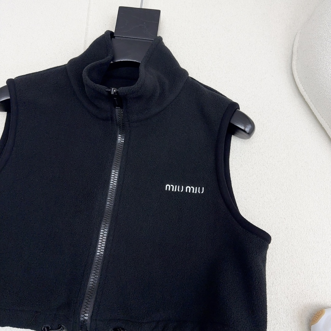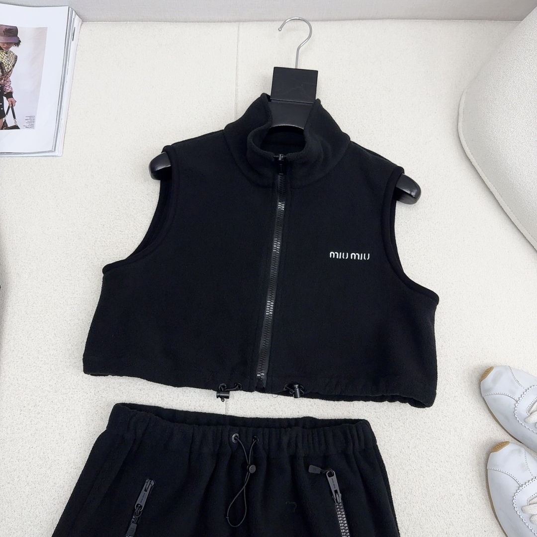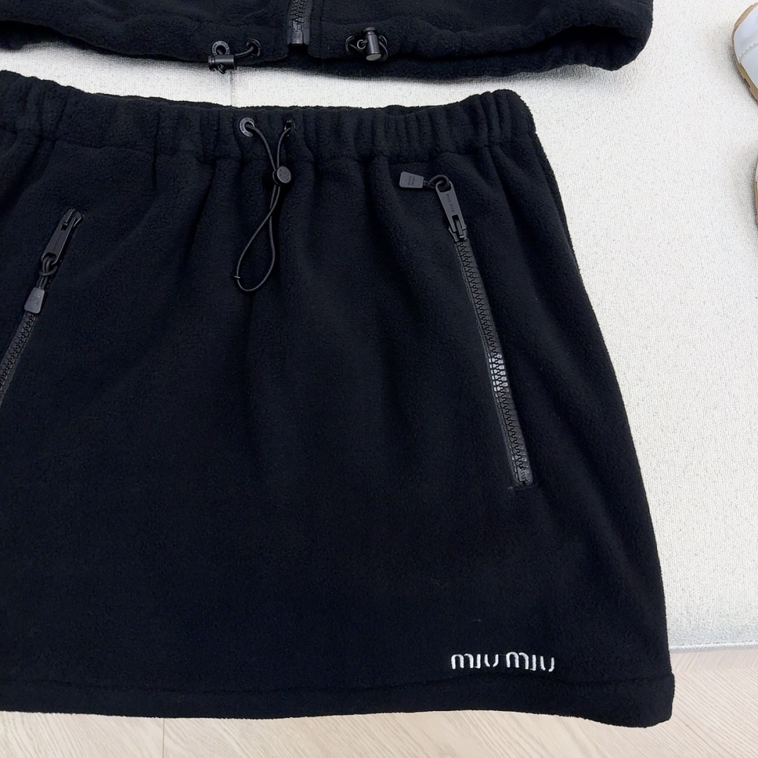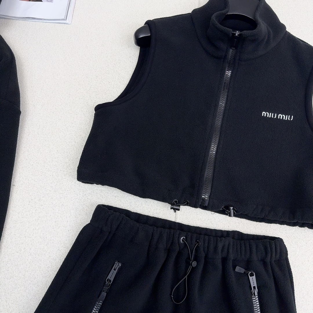 Get a youthful Miu Miu look with this cozy black fleece set. Includes a hoodie, vest, and mini skirt for versatile styling. Perfect for fall and winter.
