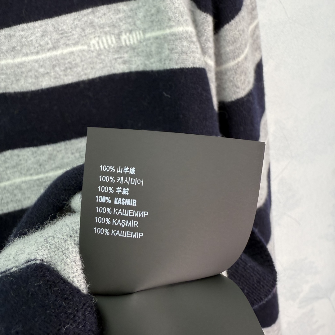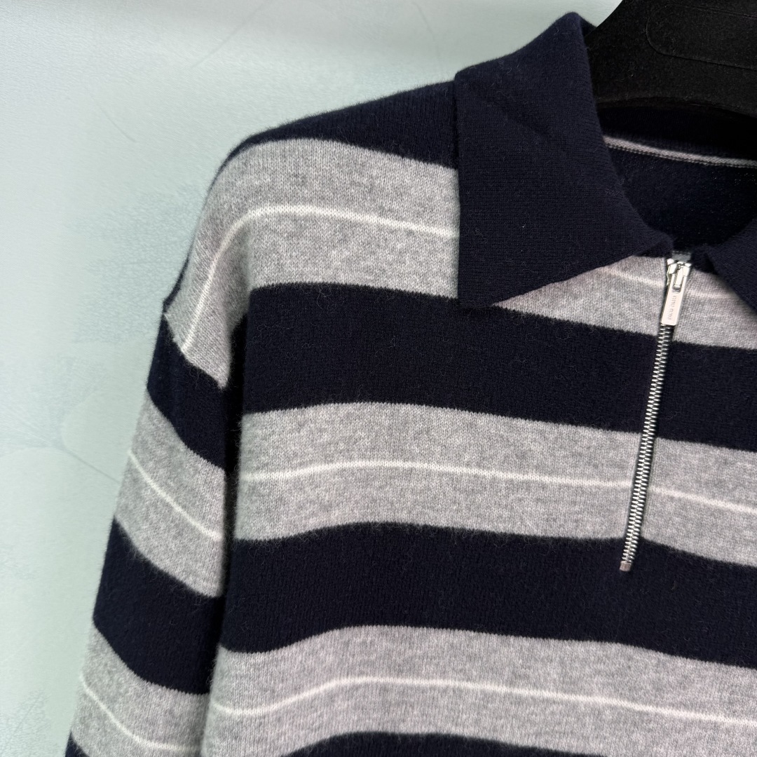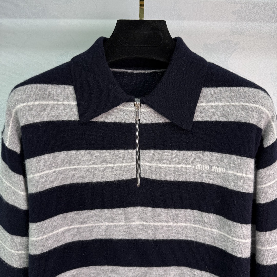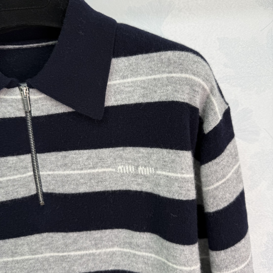 Elevate your wardrobe with this Miu Miu cashmere polo. Featuring a navy grey stripe, half-zip, and soft cashmere, it's a blend of comfort and style.