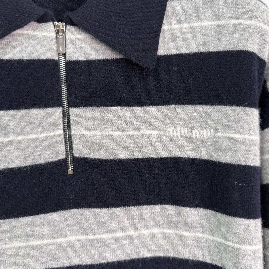 Miu Miu Striped Half-Zip Cashmere Polo Shirt - Navy Grey, Soft & Stylish