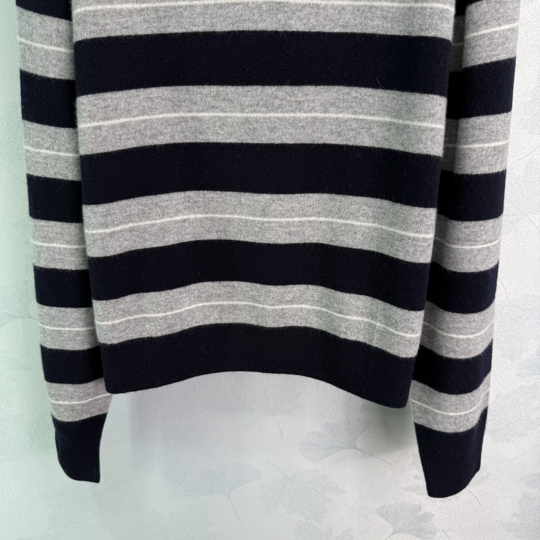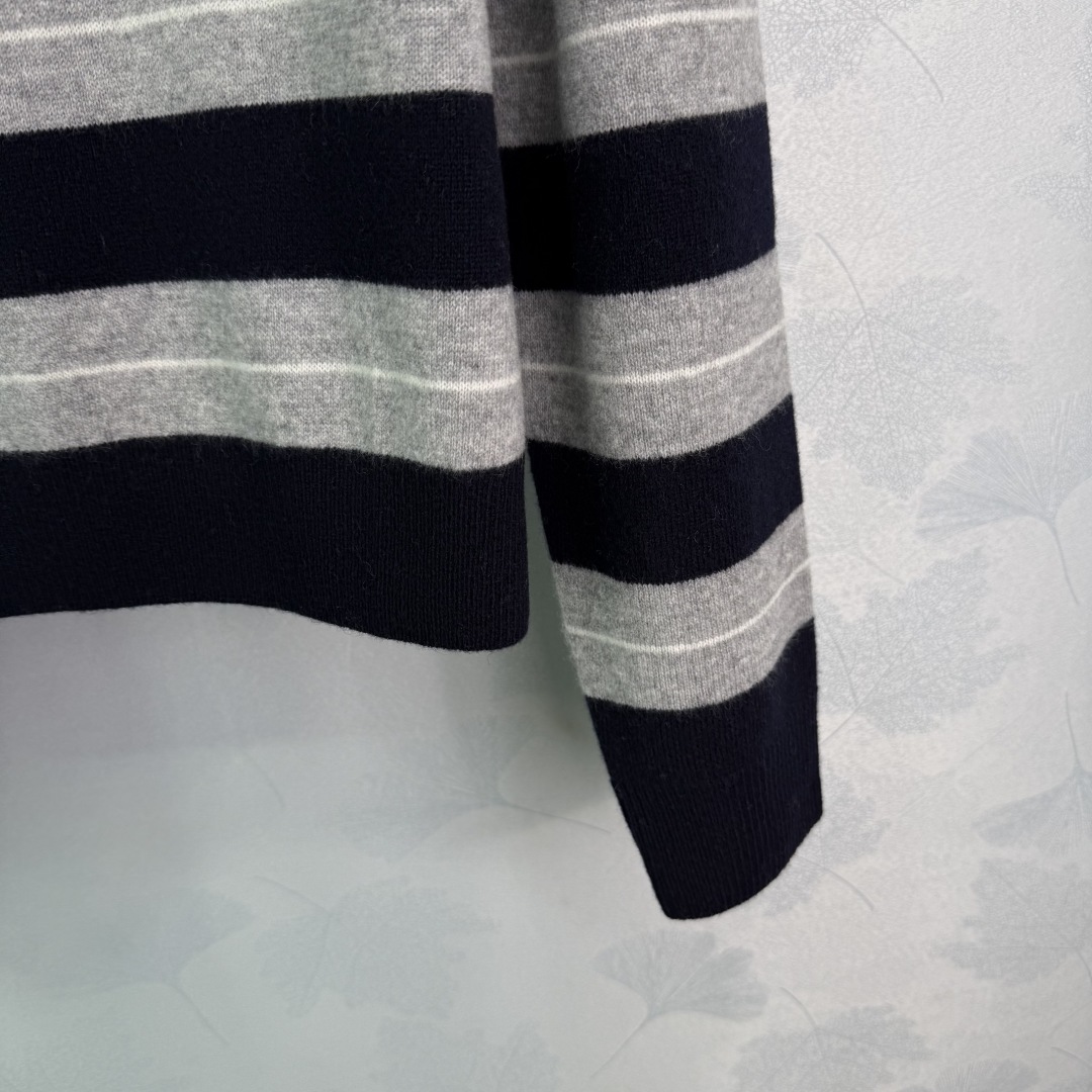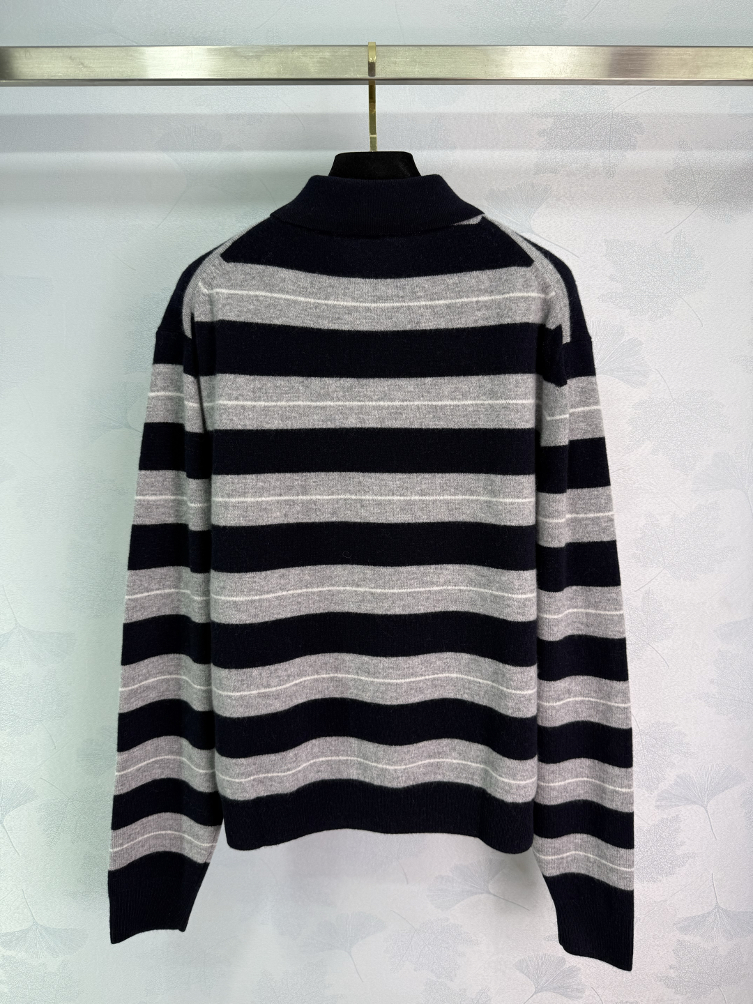 I'm impressed with the quality of this cashmere polo. It's super soft and looks very stylish. The navy and grey stripes are a classic combination.