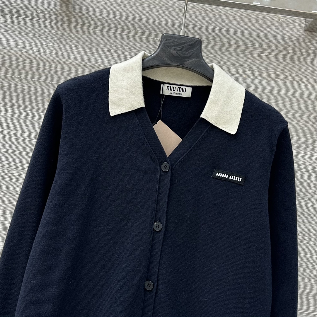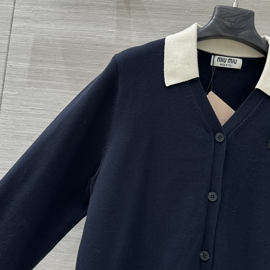 Miu Miu Women's Navy Blue Cotton V-Neck Cardigan with Contrast Collar