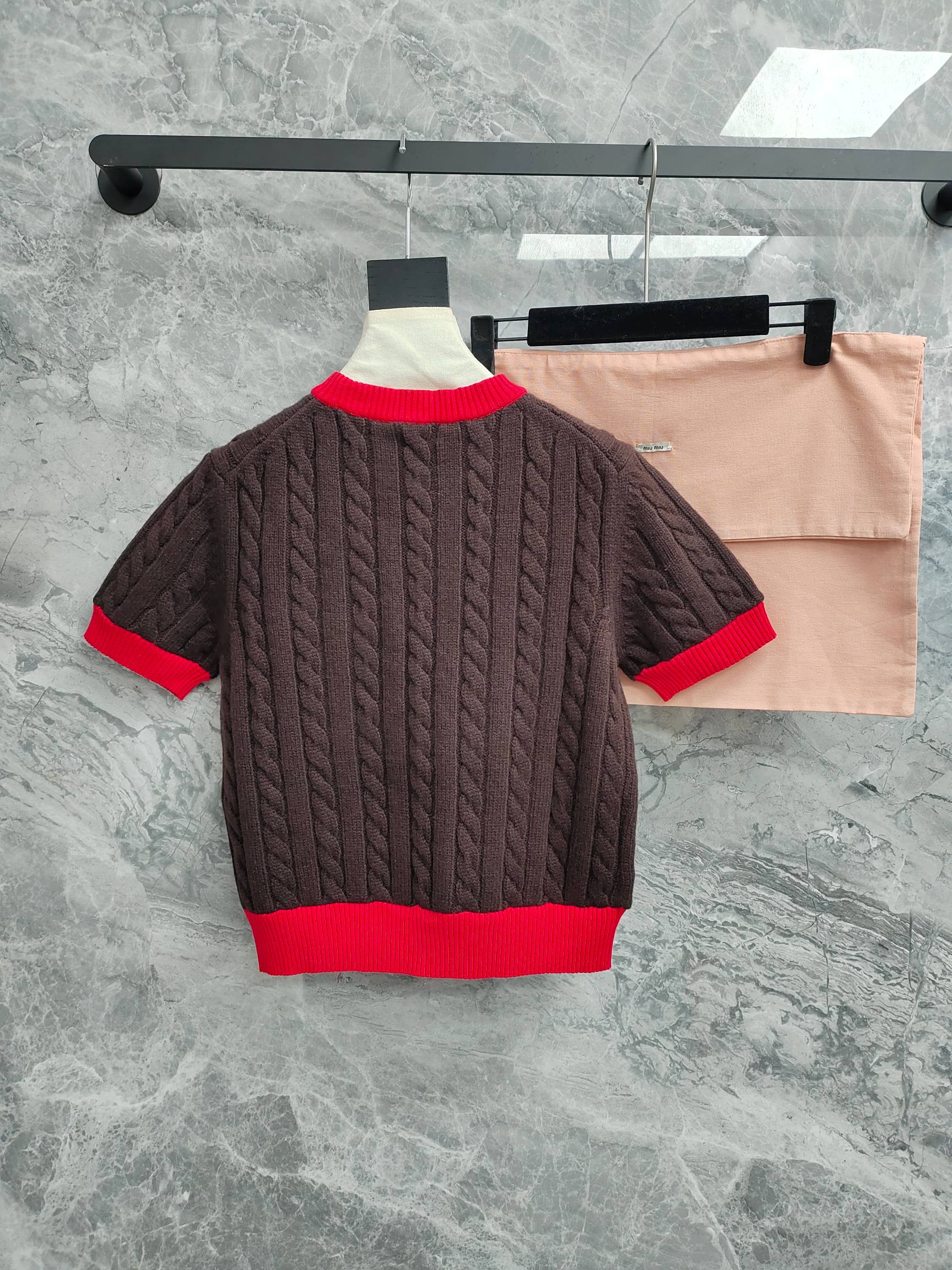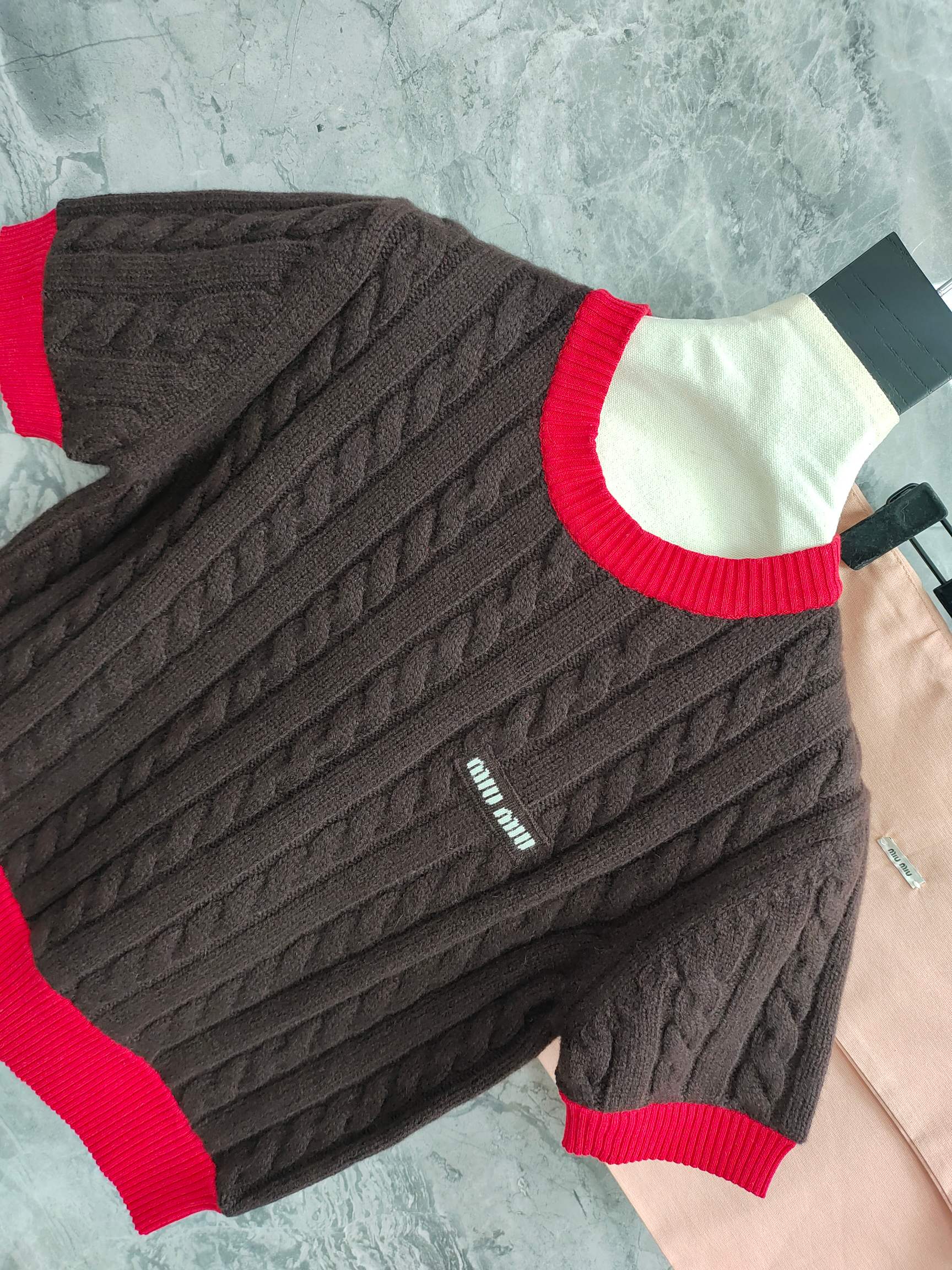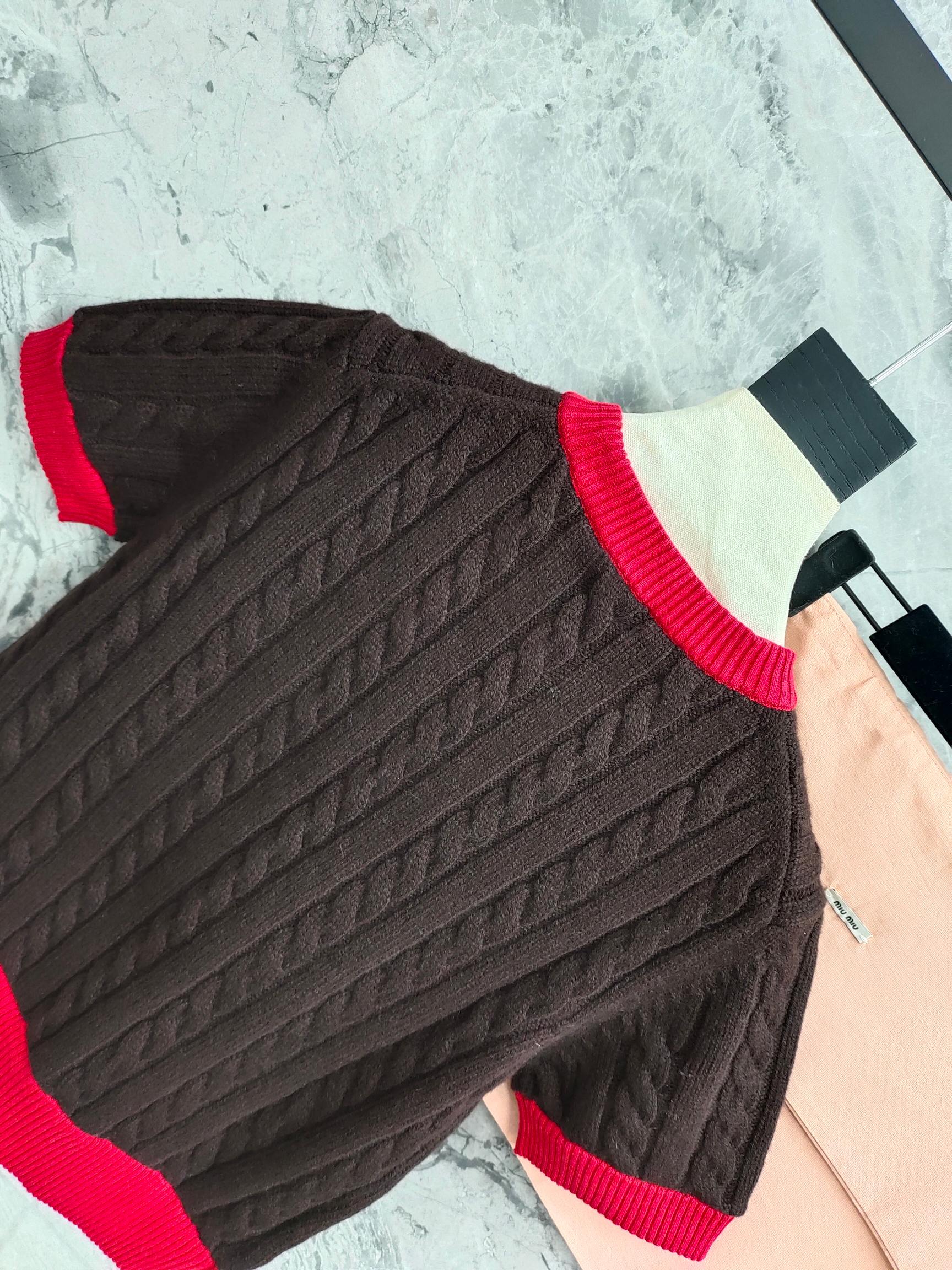 Tags: Cable Knit Short Sleeve, Designer Knitwear, Miu Miu Knit Top, Retro Contrast Top, Wool Blend Top