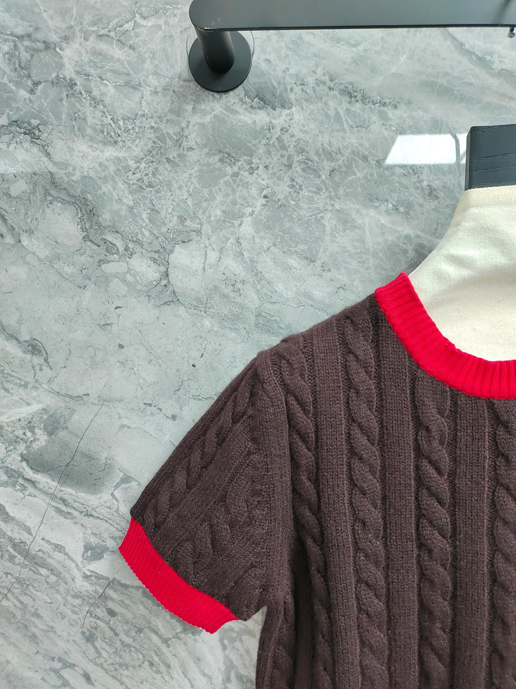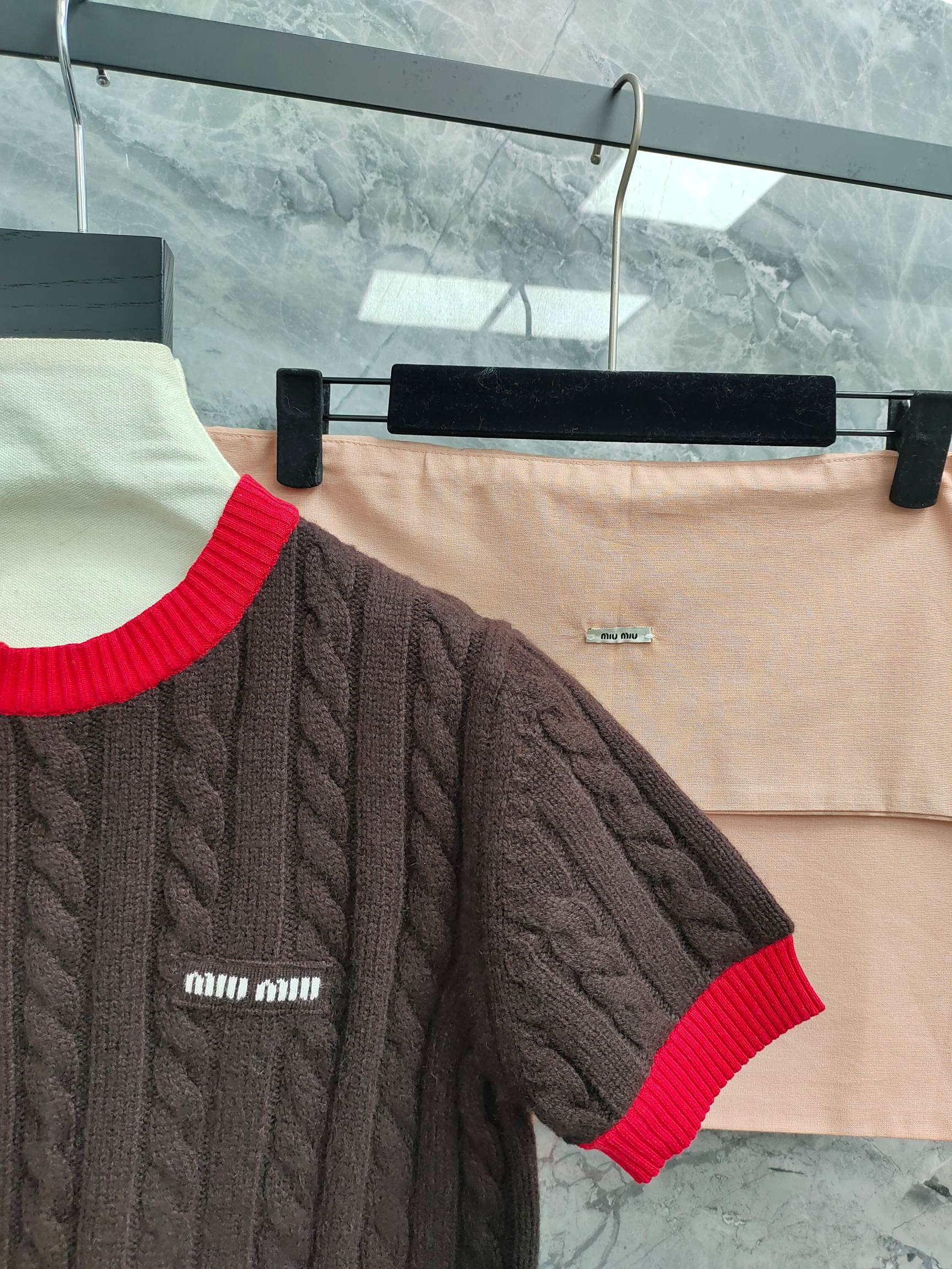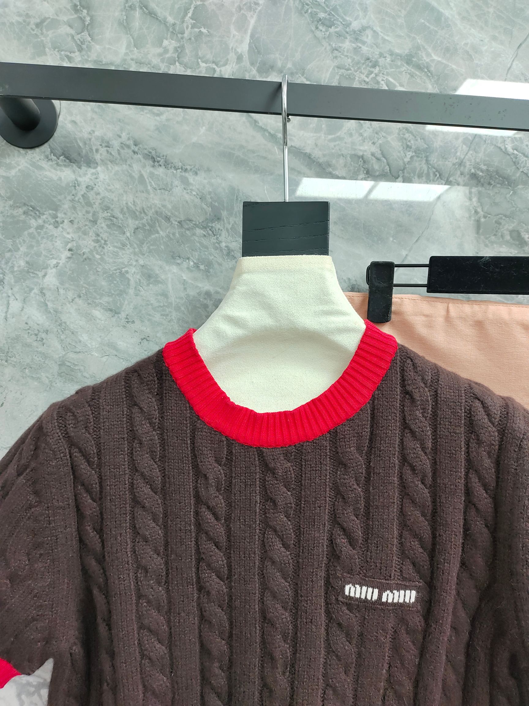 Tags: Cable Knit Short Sleeve, Designer Knitwear, Miu Miu Knit Top, Retro Contrast Top, Wool Blend Top