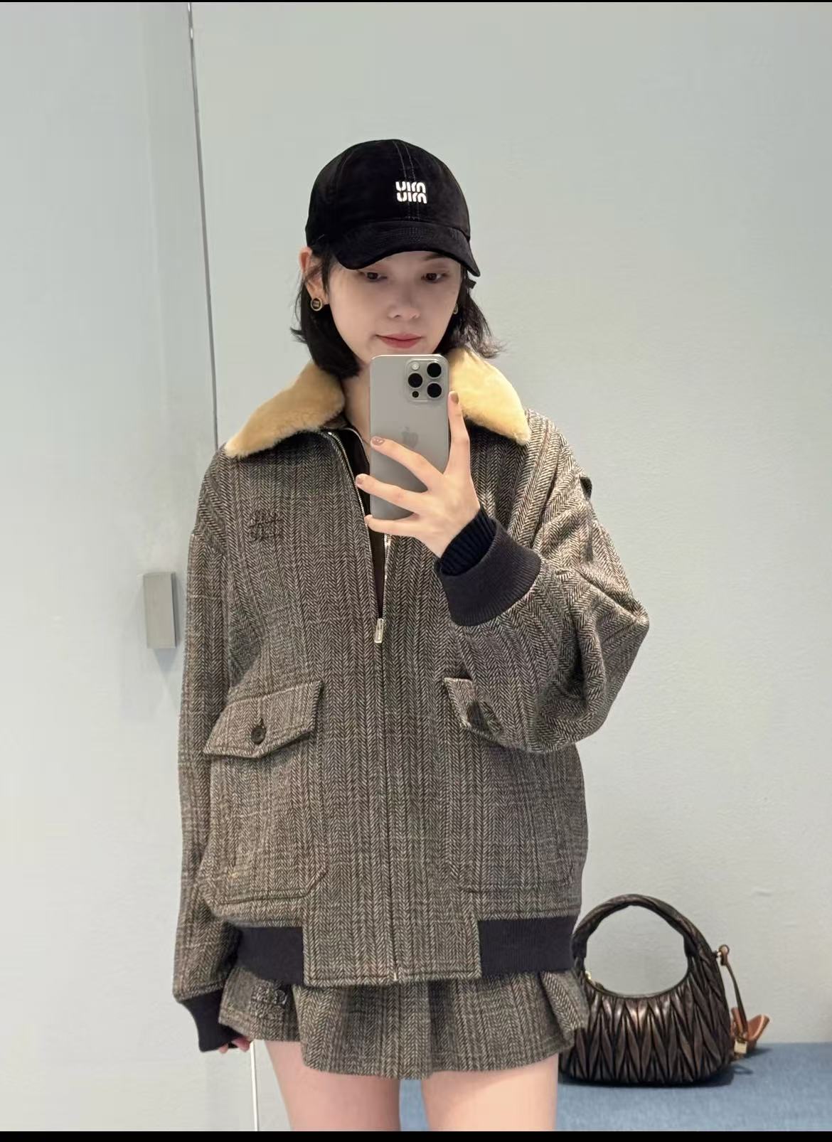 Elevate your style with this Miu Miu wool blazer jacket and plaid skirt set. Featuring logo embroidery, detachable faux fur collar, and a flattering fit.