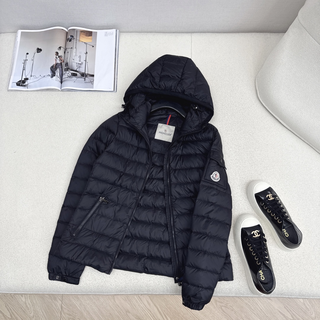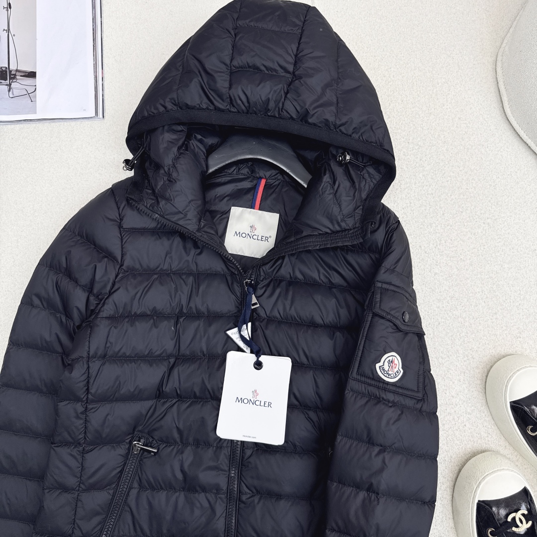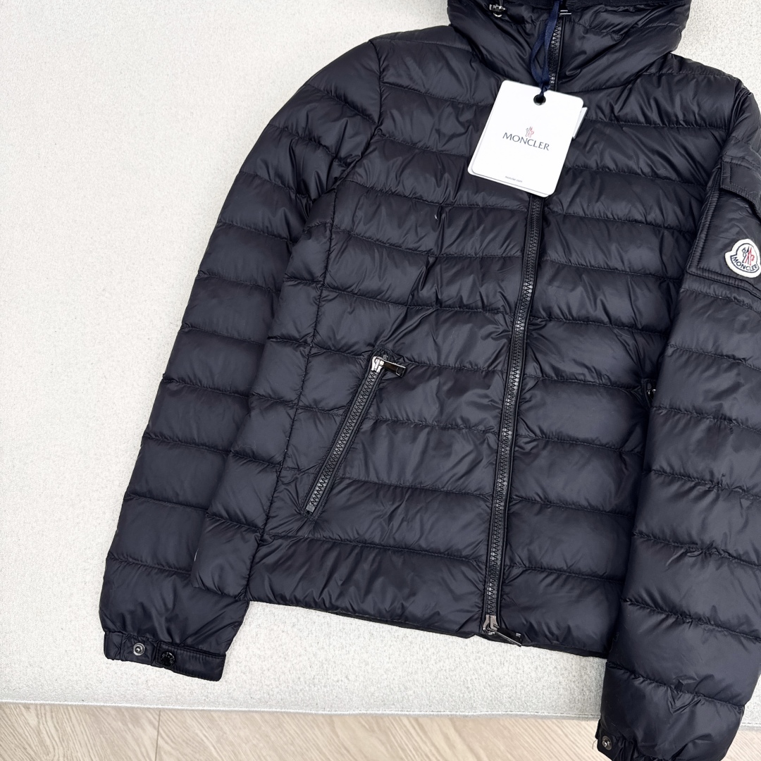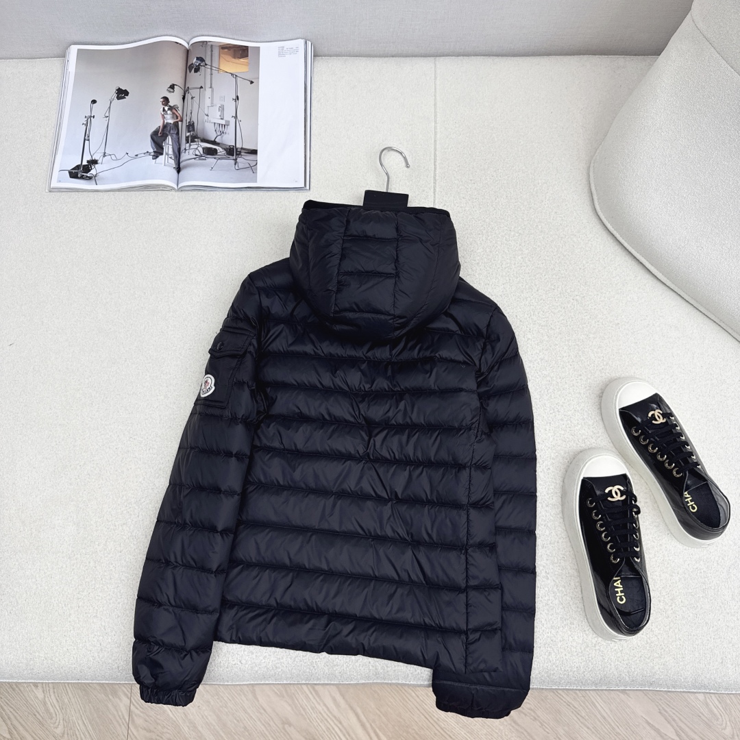 Stay warm and fashionable with this Moncler hooded down jacket. Perfect for chilly days, offering lightweight comfort and a sleek design.