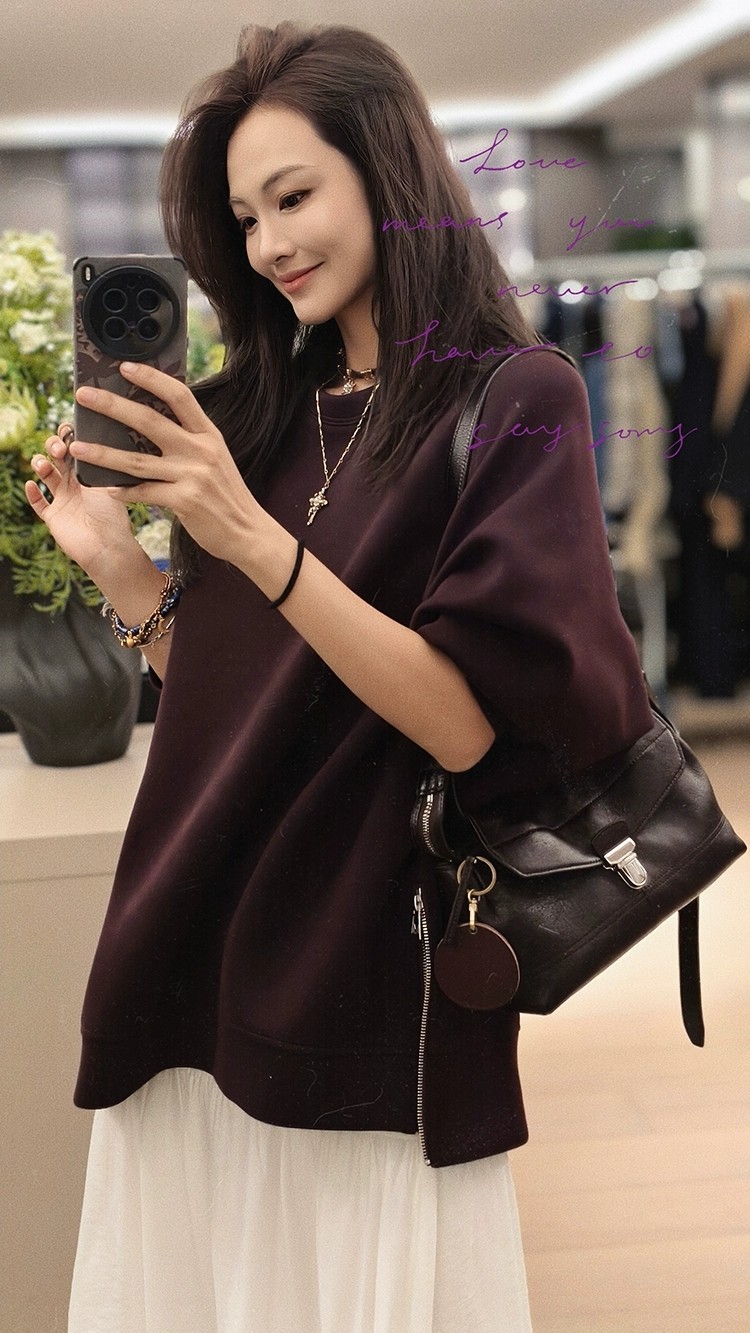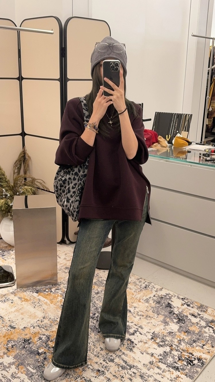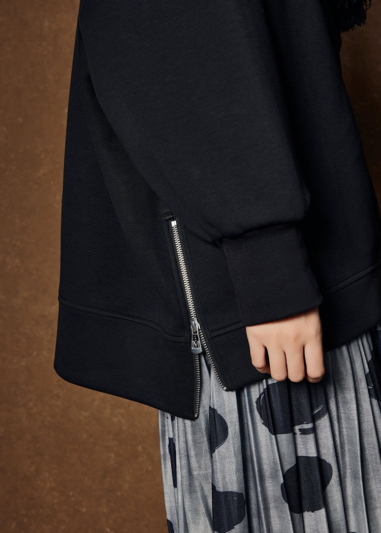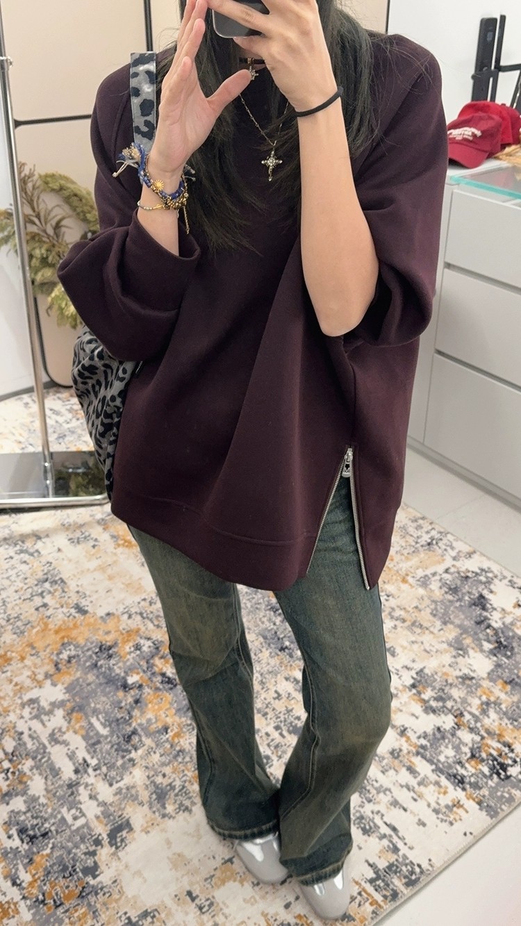 The material is great and the design is very trendy. I love the zipper, it adds a unique edge to the top. The oversized fit is perfect for running errands or just relaxing at home.