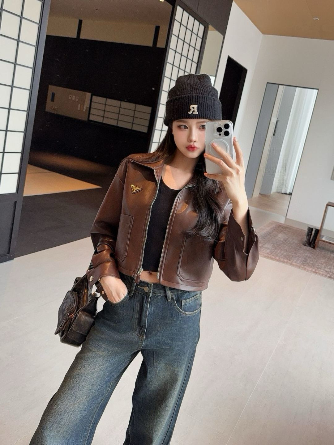Prada 2025FW Women's Brown PU Leather Cropped Jacket - Chic & Stylish