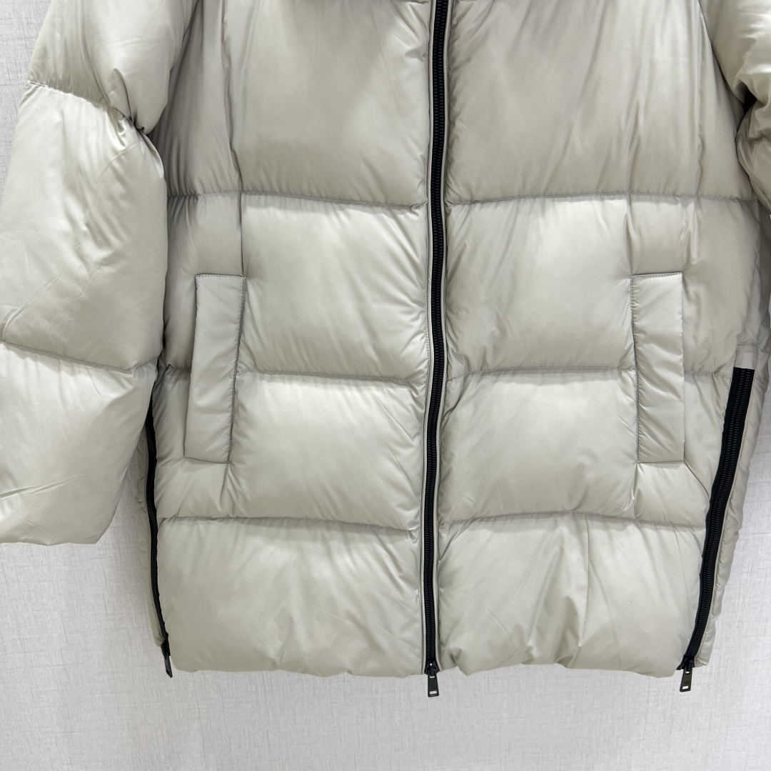 Stay warm in the 2025 Prada down jacket. Filled with 90% white goose down, featuring the iconic triangle logo and a stylish side zipper.