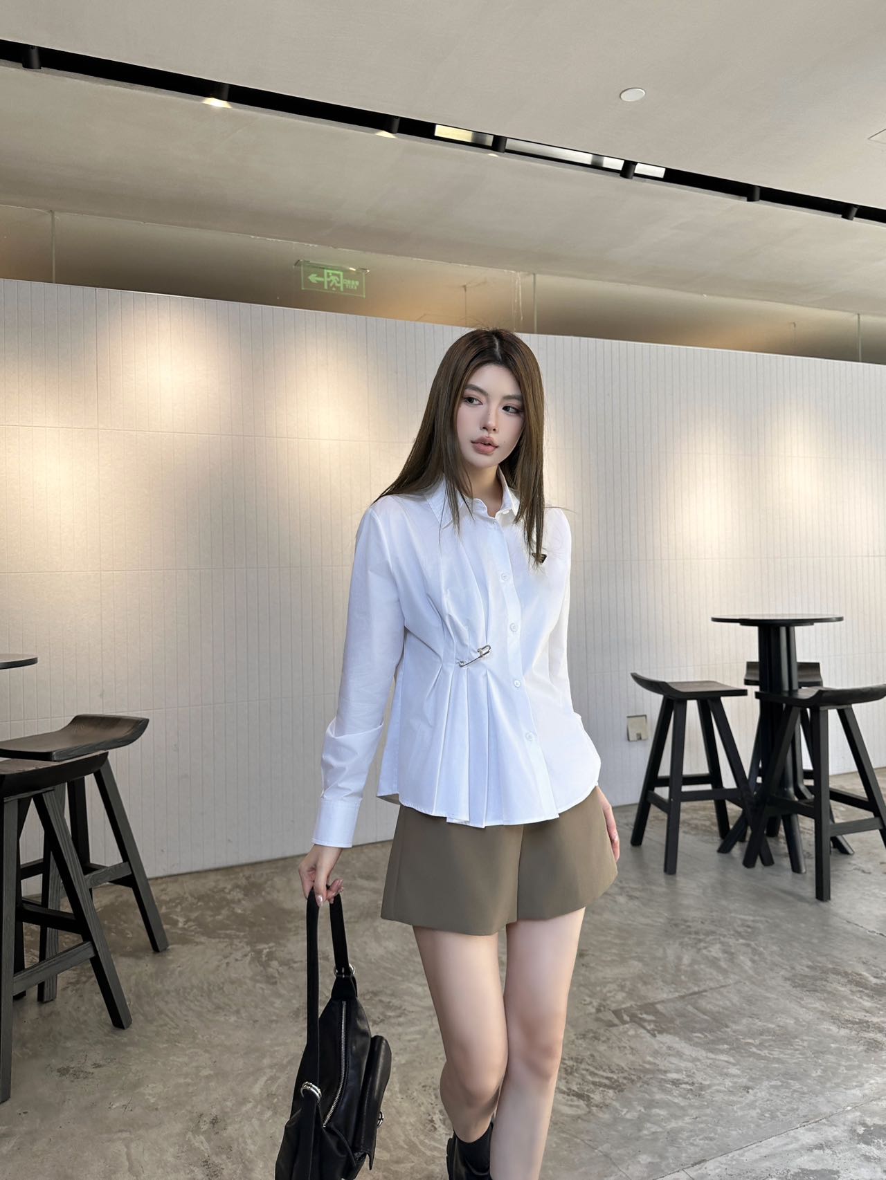 - Design: Asymmetrical pleats with logo pin