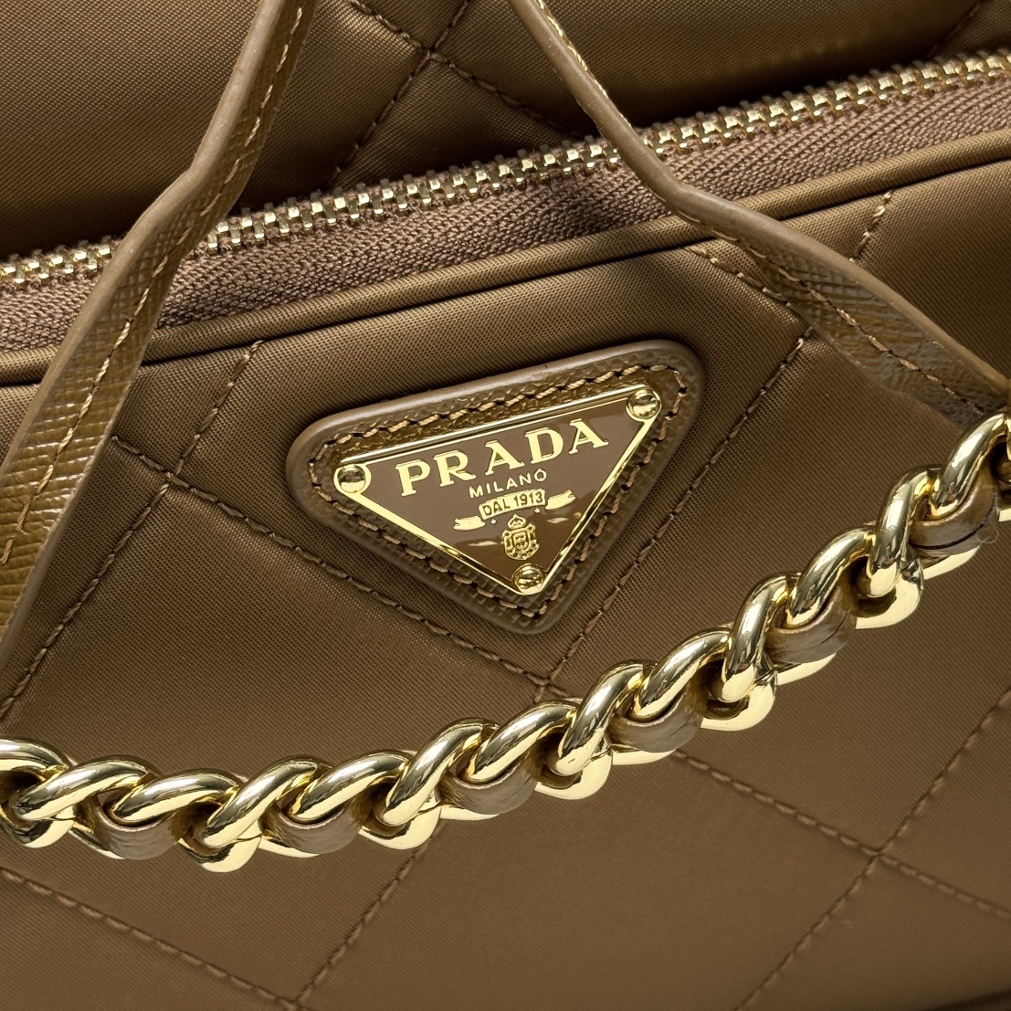 Quilted Re-Nylon bucket bag with chain and adjustable leather strap. Wear as shoulder, crossbody, or carry by hand. Spacious, practical, and stylish.