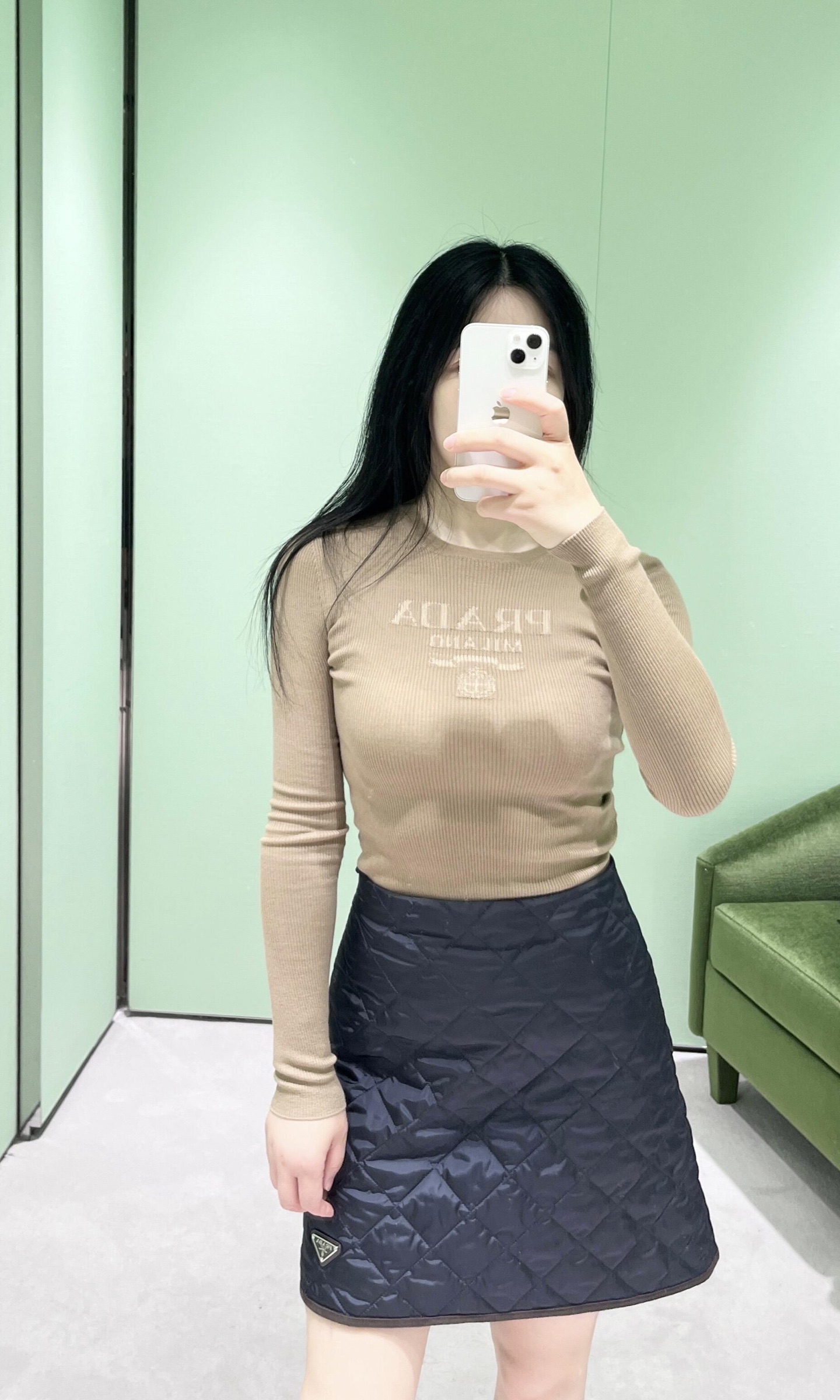 Luxurious & soft wool-blend Prada top sculpts a flattering silhouette. Perfect as a standalone piece or layering. Available in S/M/L.
