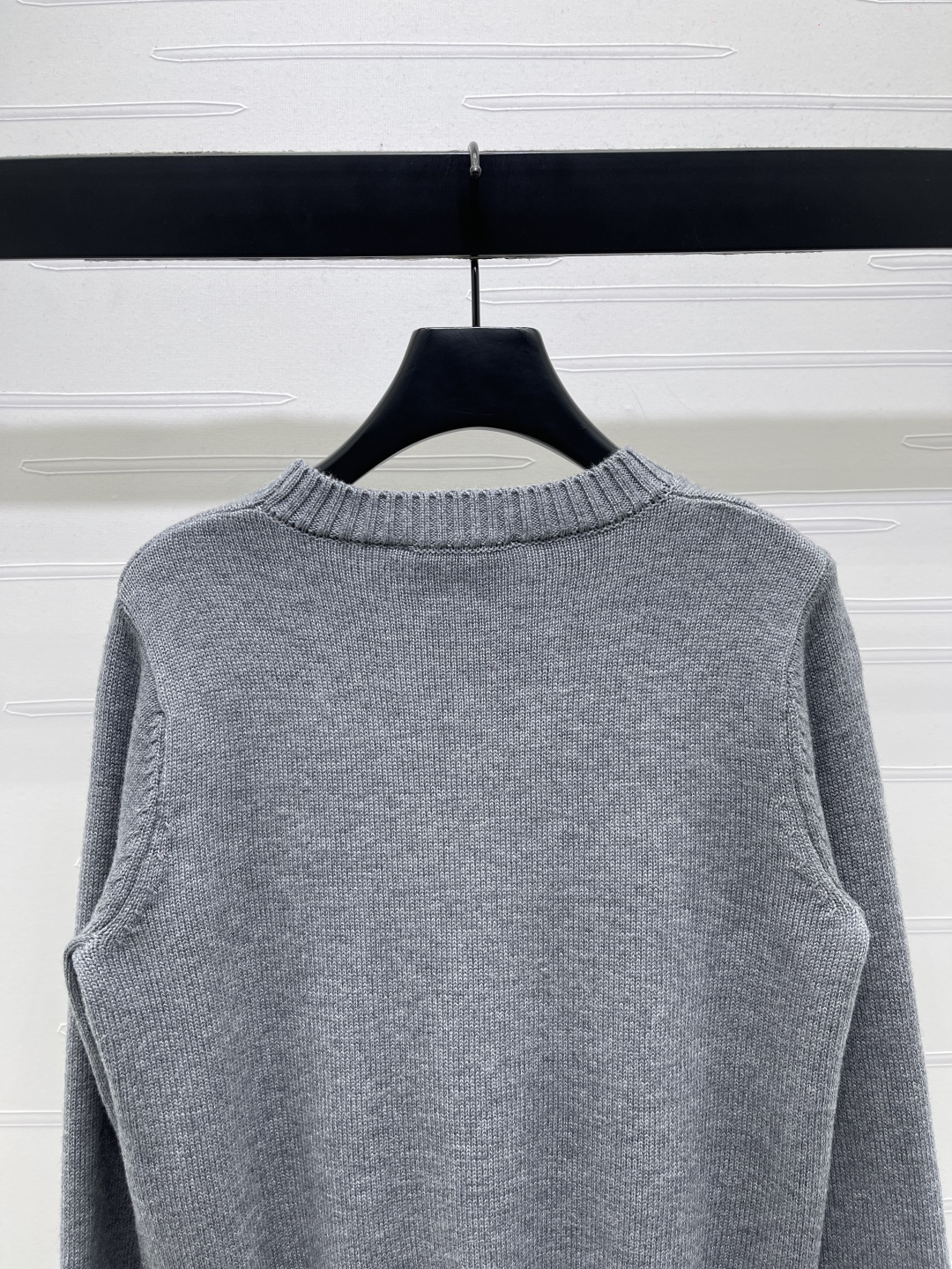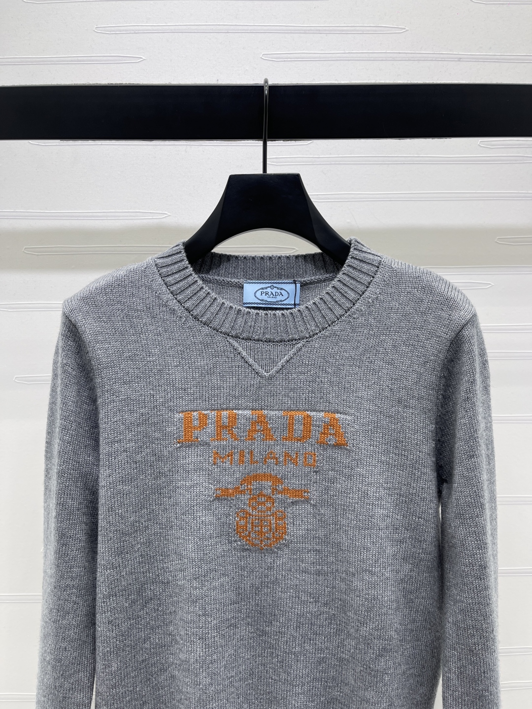 Prada Wool Sweater with Logo, Grey Round Neck Jumper, Elegant Knitwear