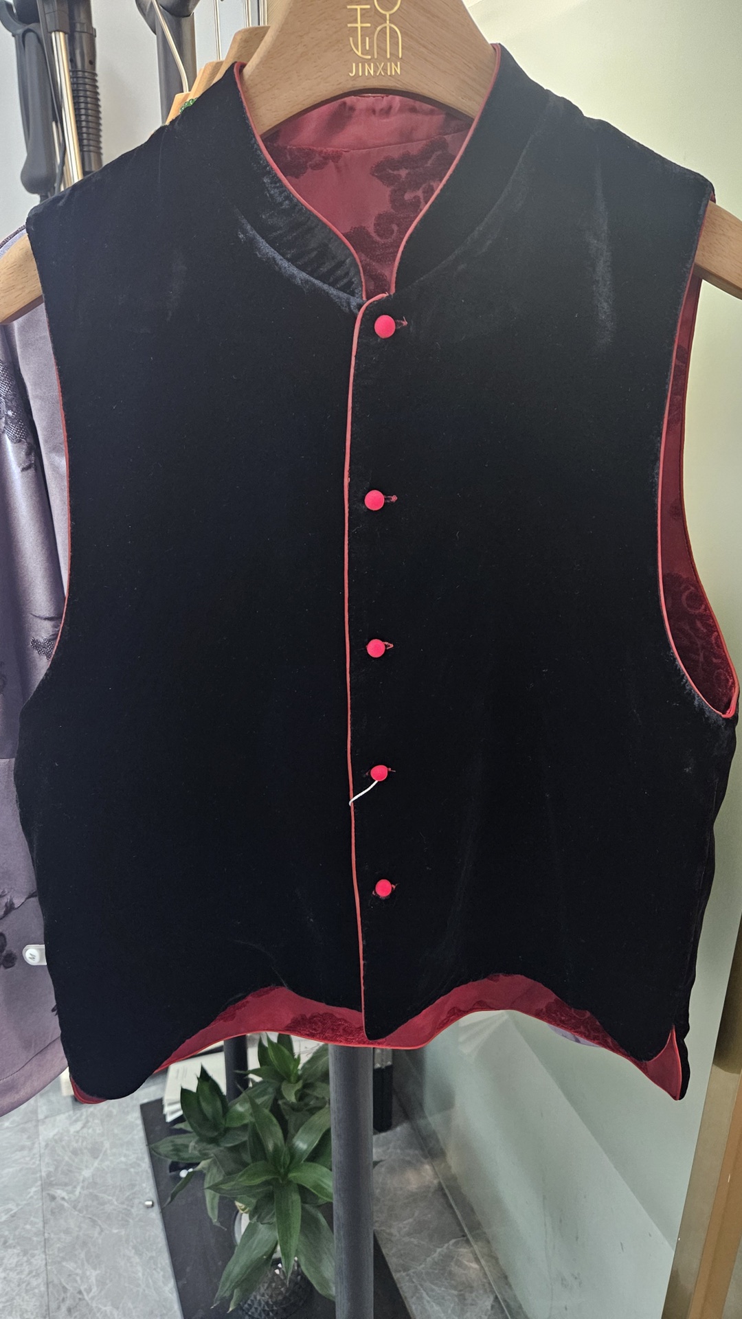Elegant reversible vest featuring a festive red silk blend with a traditional Chinese design on one side and sleek black velvet on the other.