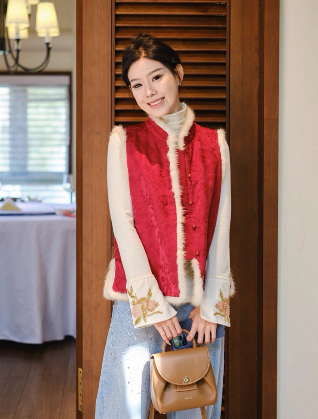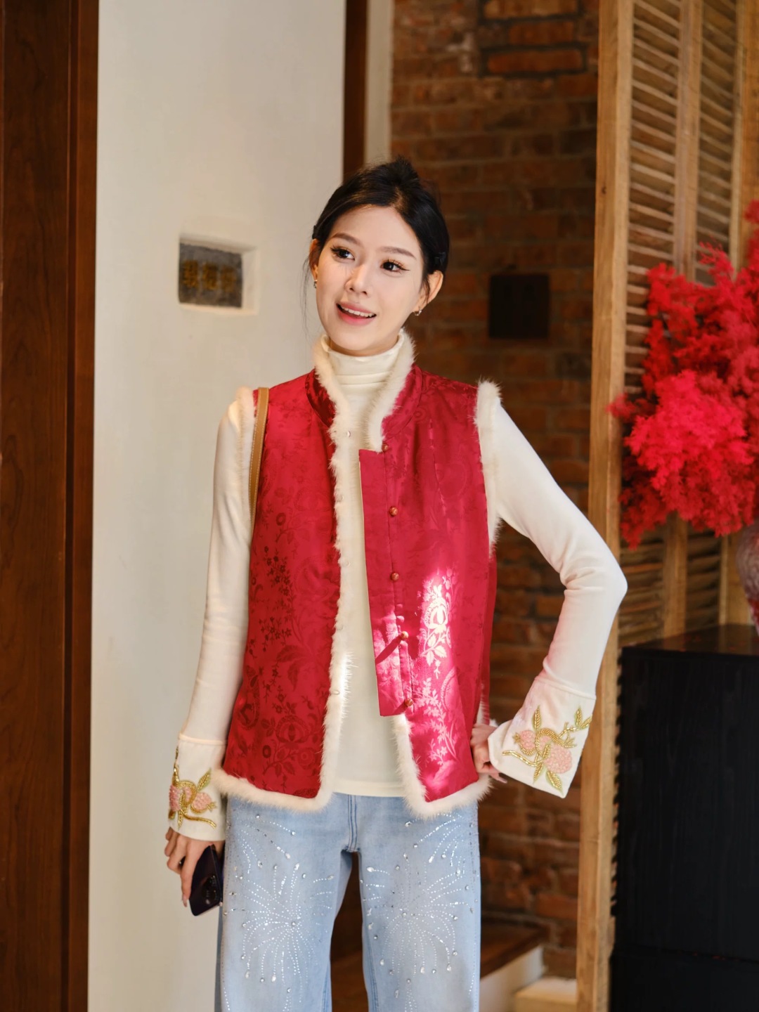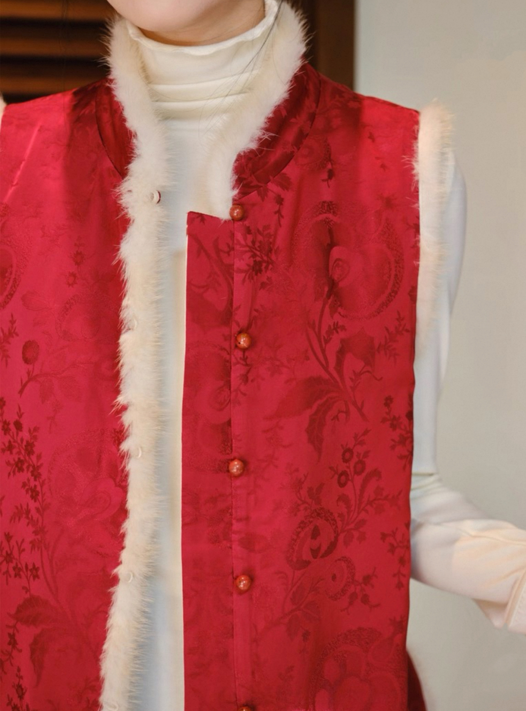 Elegant, vintage-inspired reversible vest featuring silk jacquard, mink fur trim, & quilted cotton. Perfect for layering with a Chinese-inspired aesthetic.