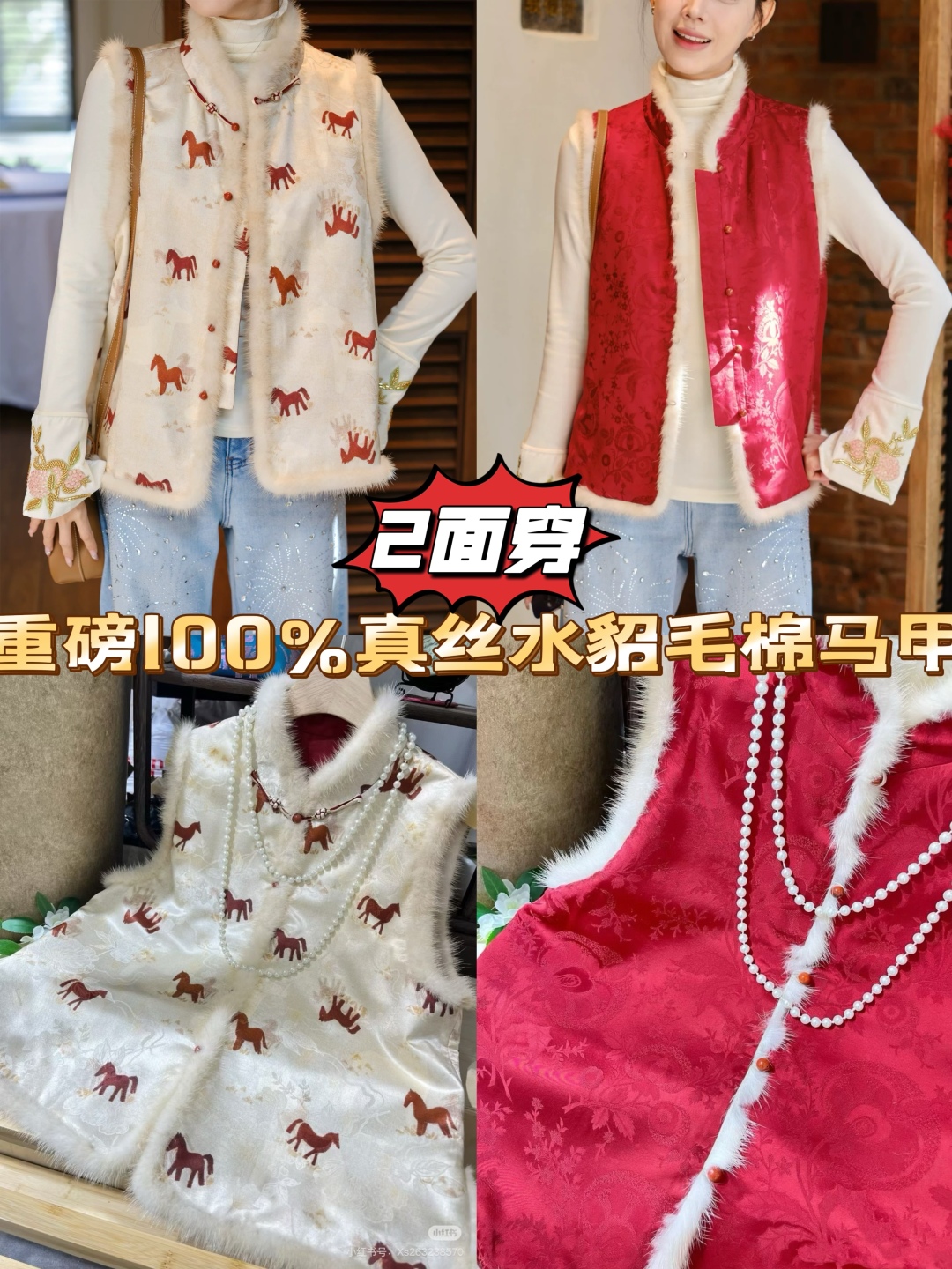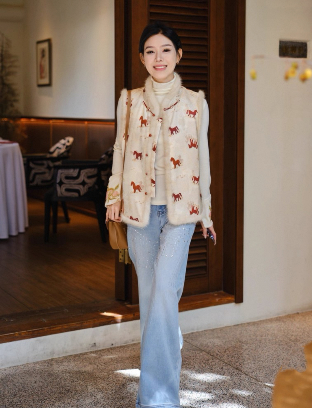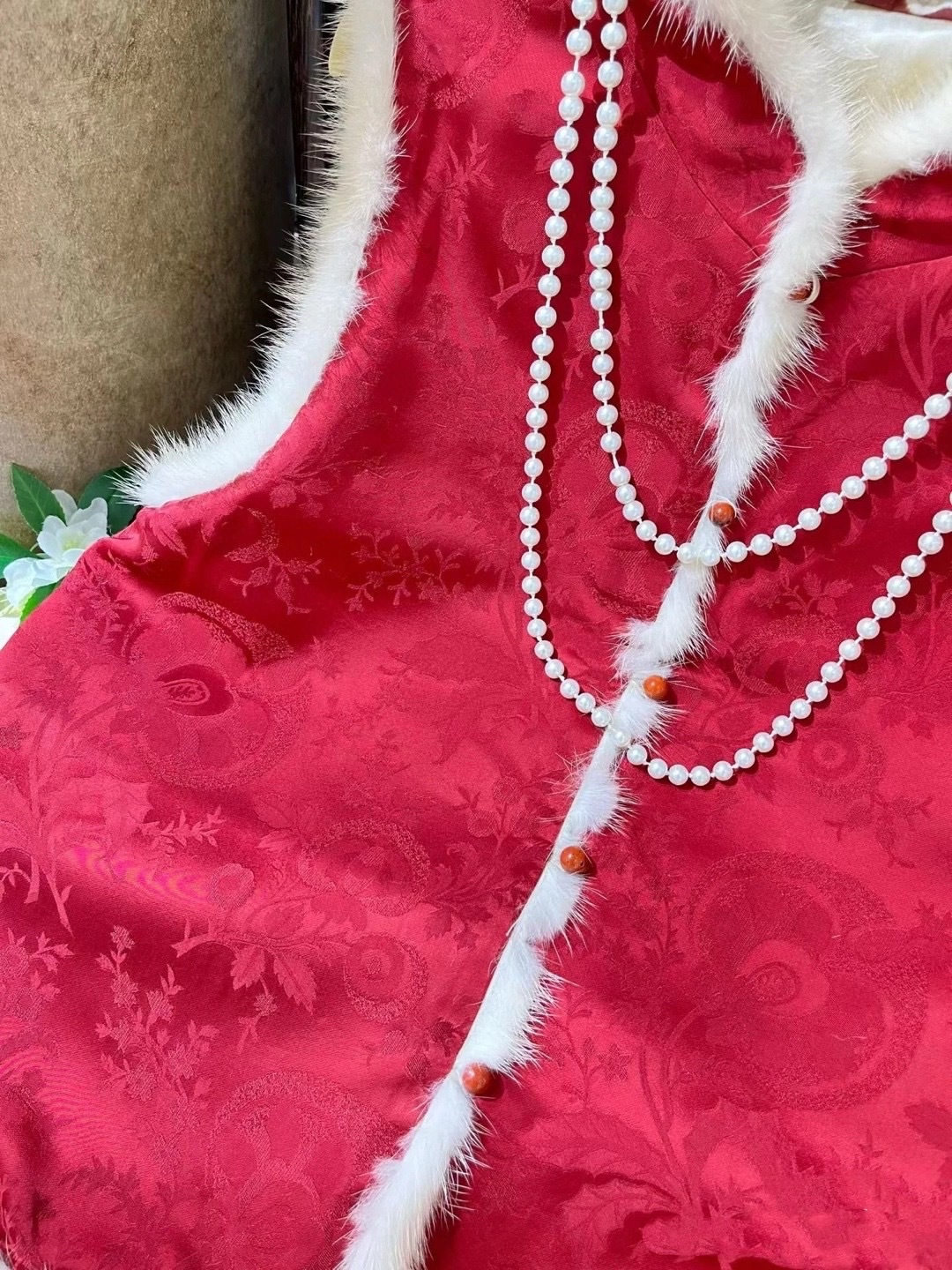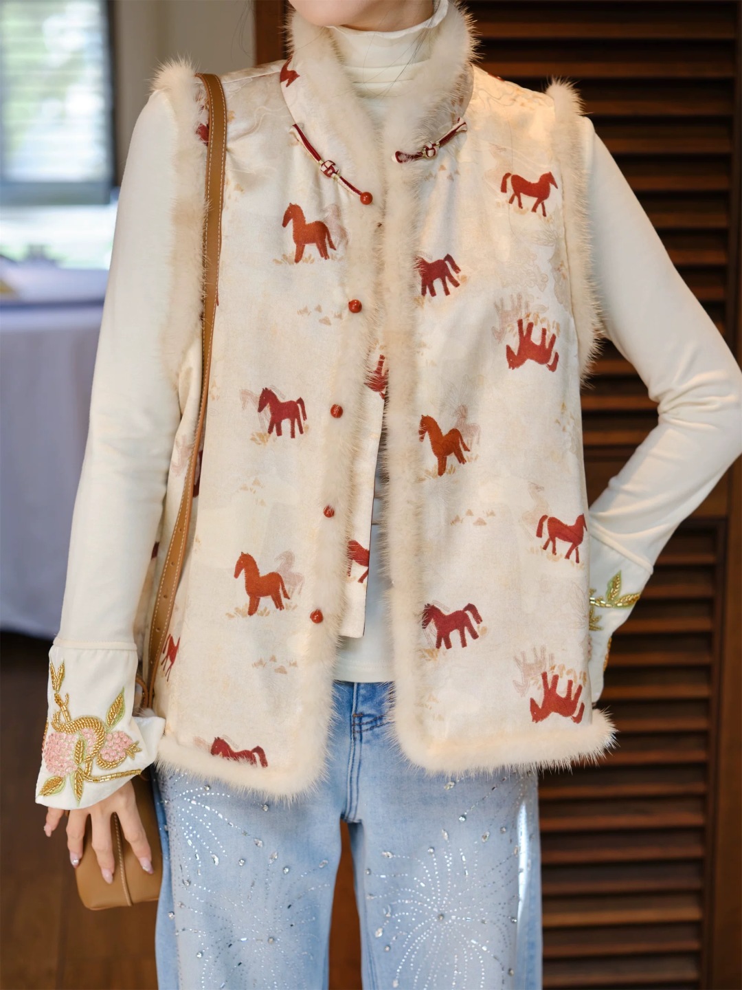 Elegant, vintage-inspired reversible vest featuring silk jacquard, mink fur trim, & quilted cotton. Perfect for layering with a Chinese-inspired aesthetic.
