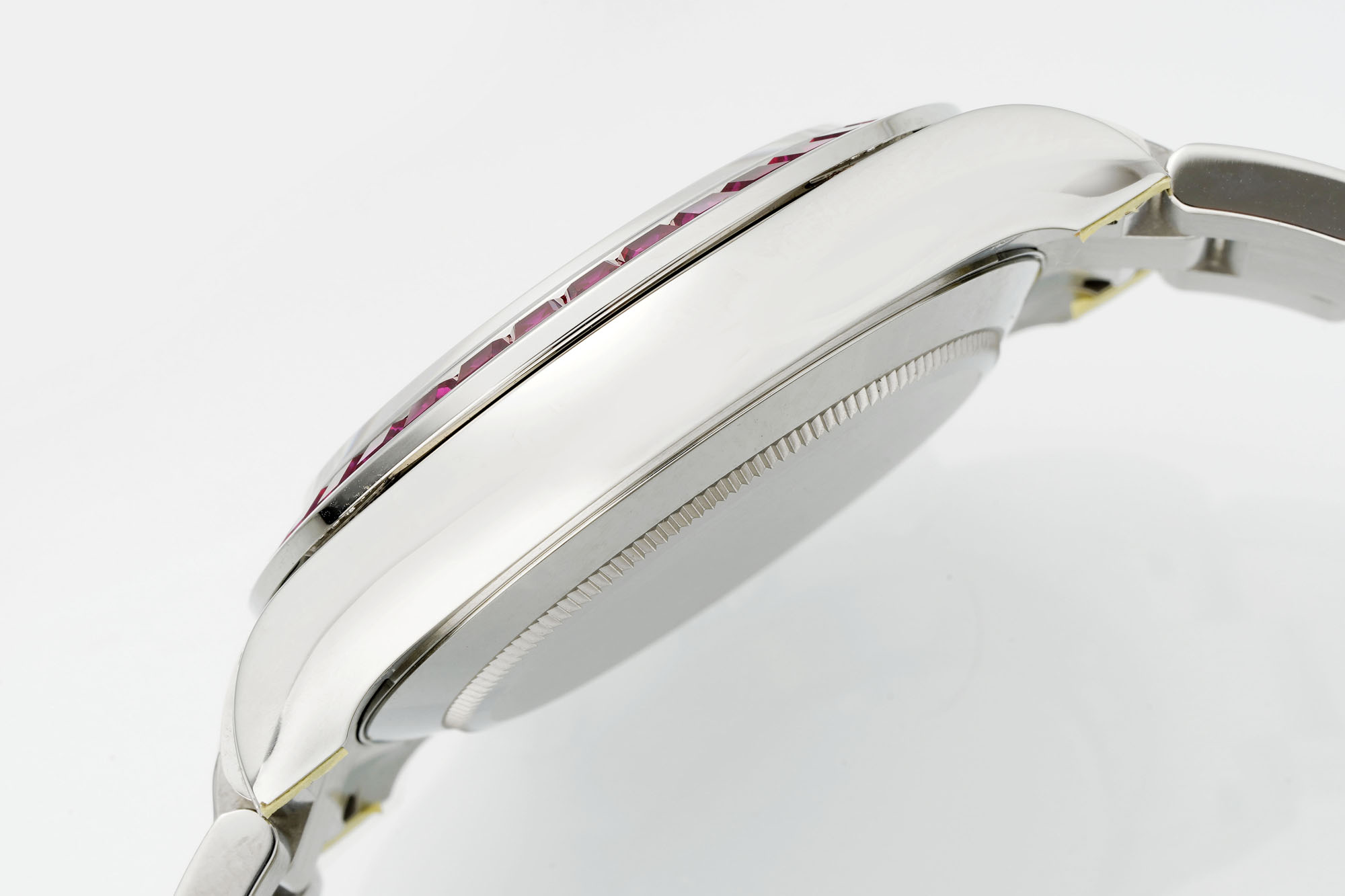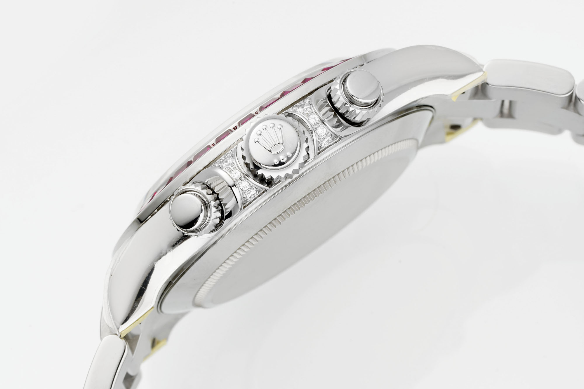 - Bezel: Set with red gems and diamonds