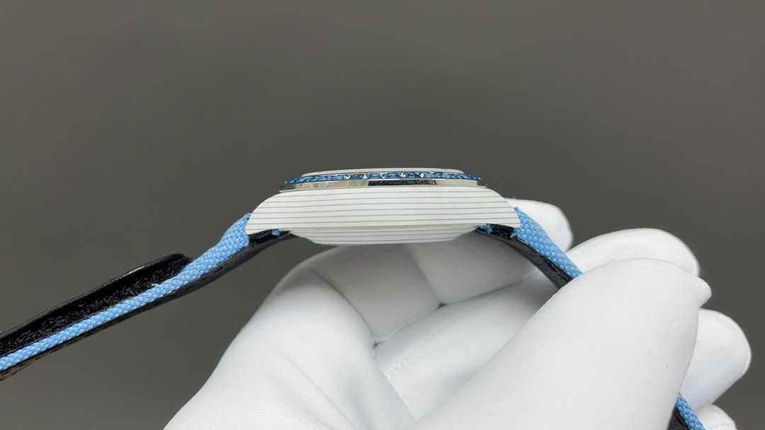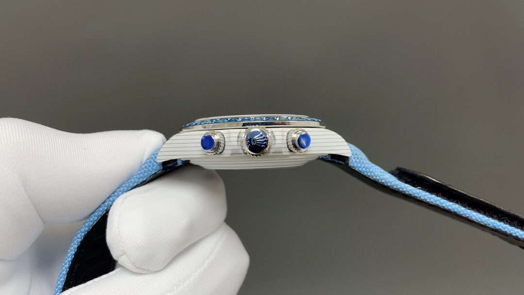 I'm a big fan of Rolex watches, and this custom model is one of my favorites. The blue sapphire bezel adds a unique touch, and the light blue canvas strap is a refreshing change from the usual metal bracelet.