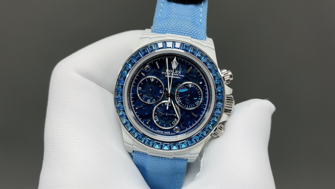 Tags: Blue Sapphire Bezel, Canvas Strap Watch, Custom Rolex Watch, Luxury Chronograph Watch, Rolex Custom Watch, Sapphire Bezel Watch