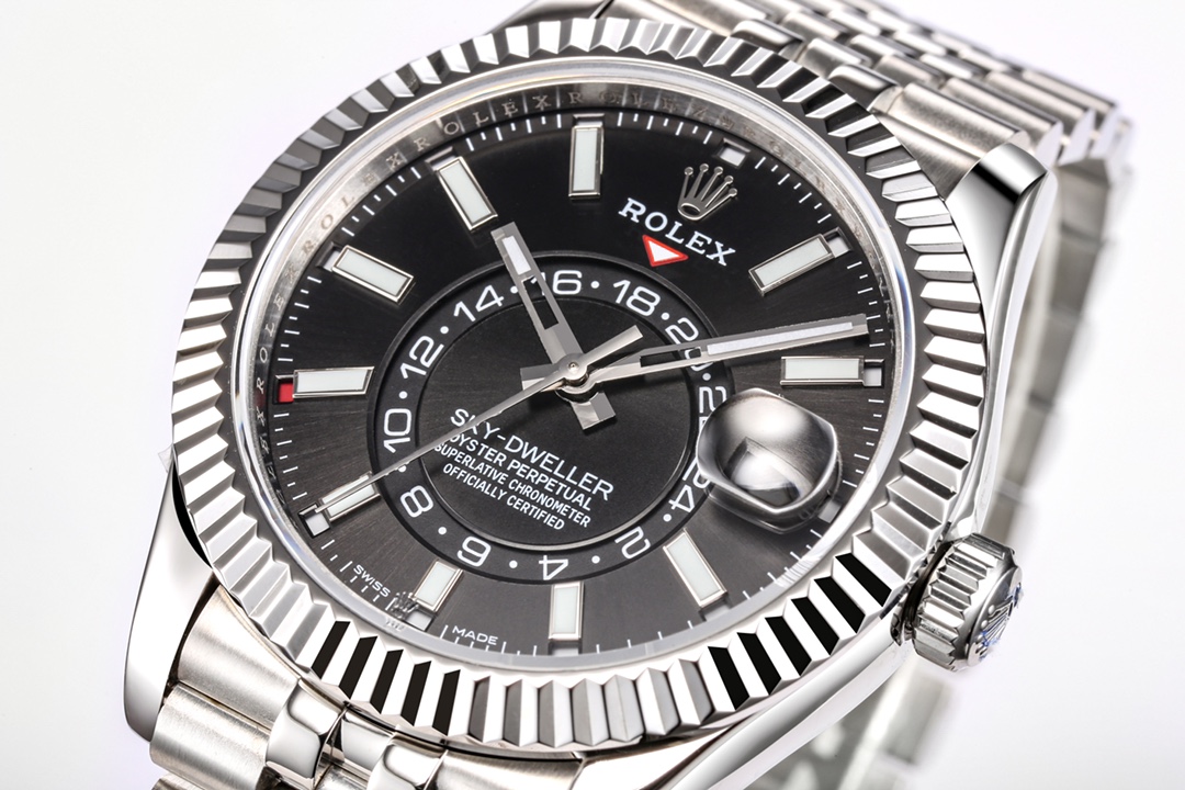 Experience the ultimate in luxury with the Rolex Sky-Dweller. Featuring a black dial, Oystersteel bracelet, and exceptional functionality.