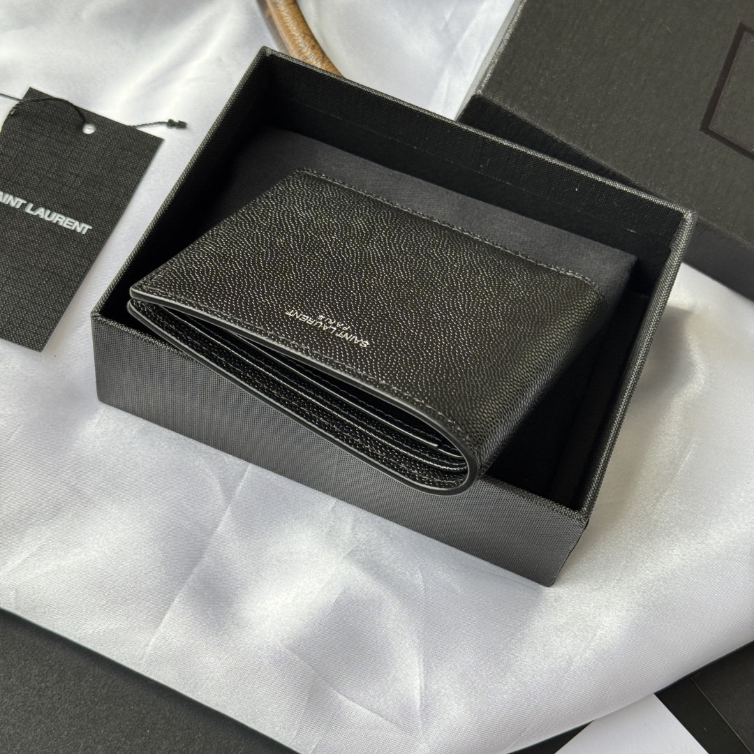 Elevate your style with this Saint Laurent bifold wallet. Crafted from luxurious caviar leather with silver hardware, it's a timeless accessory.