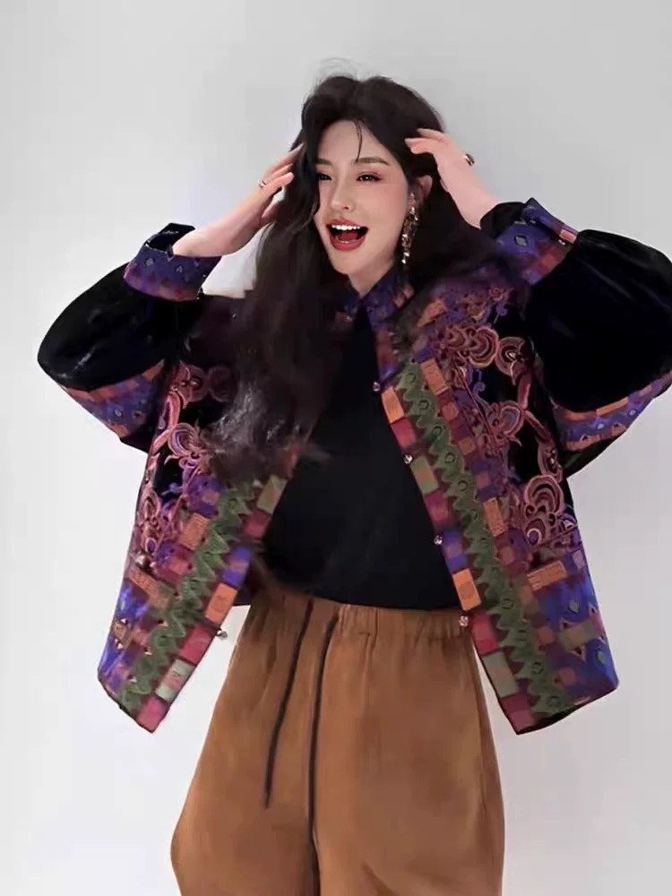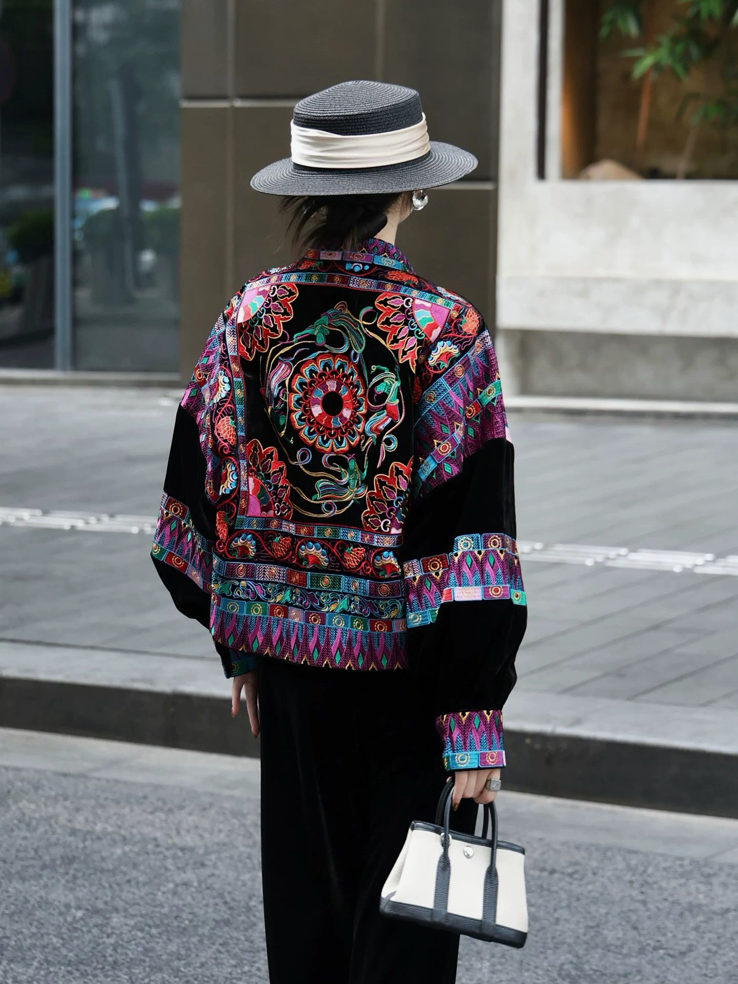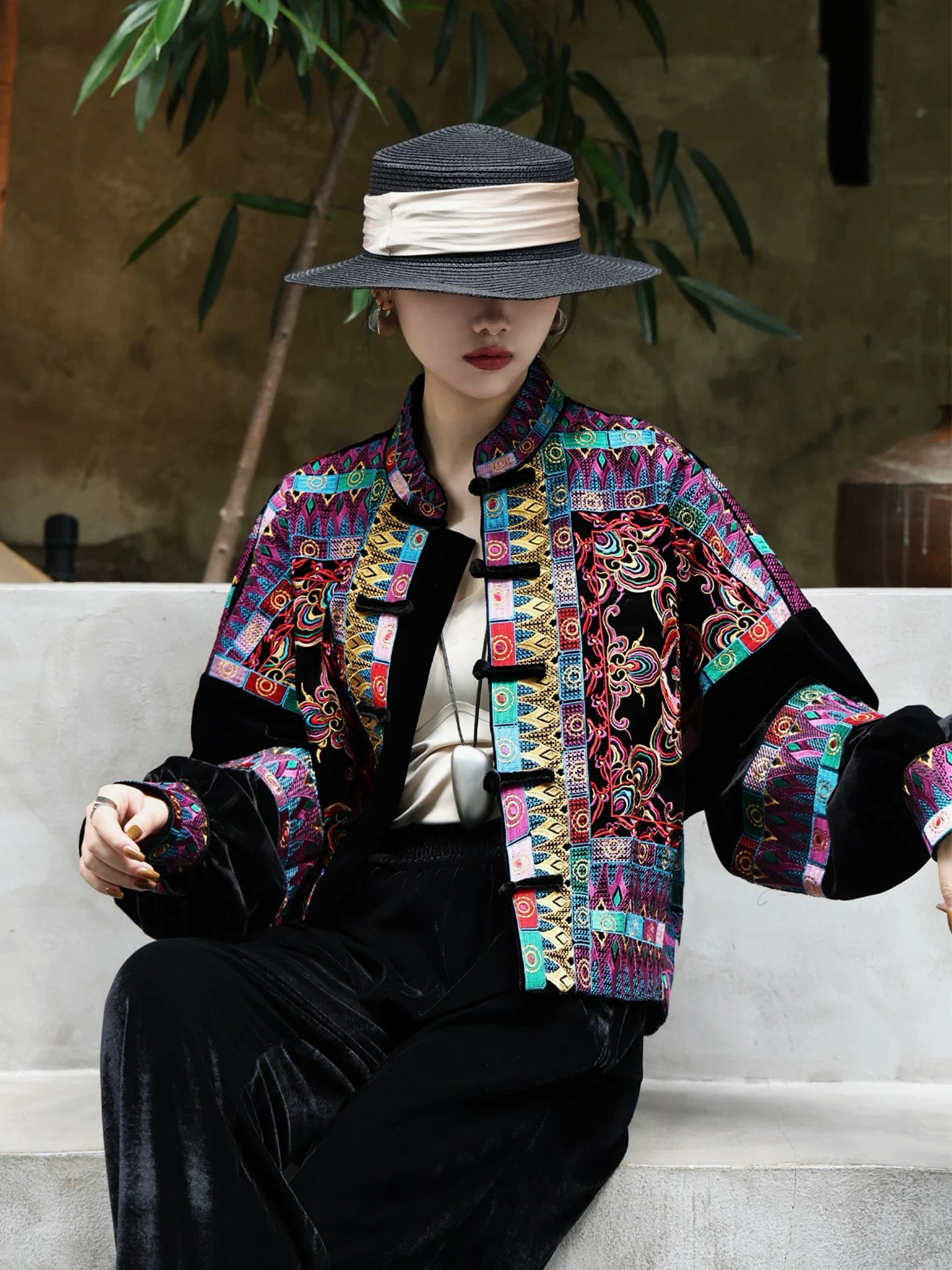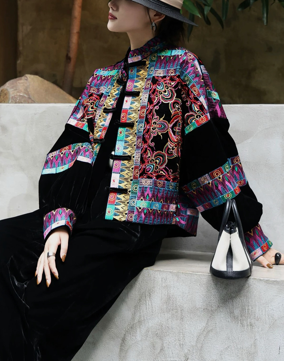 Silk Velvet Baseball Jacket with Miao Embroidery & Chinese Knot Buttons
