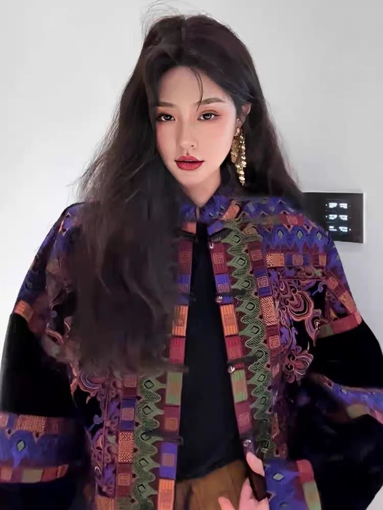 Exquisite baseball jacket featuring silk velvet, traditional Miao embroidery, and Chinese knot closures. A luxurious and artistic statement piece.