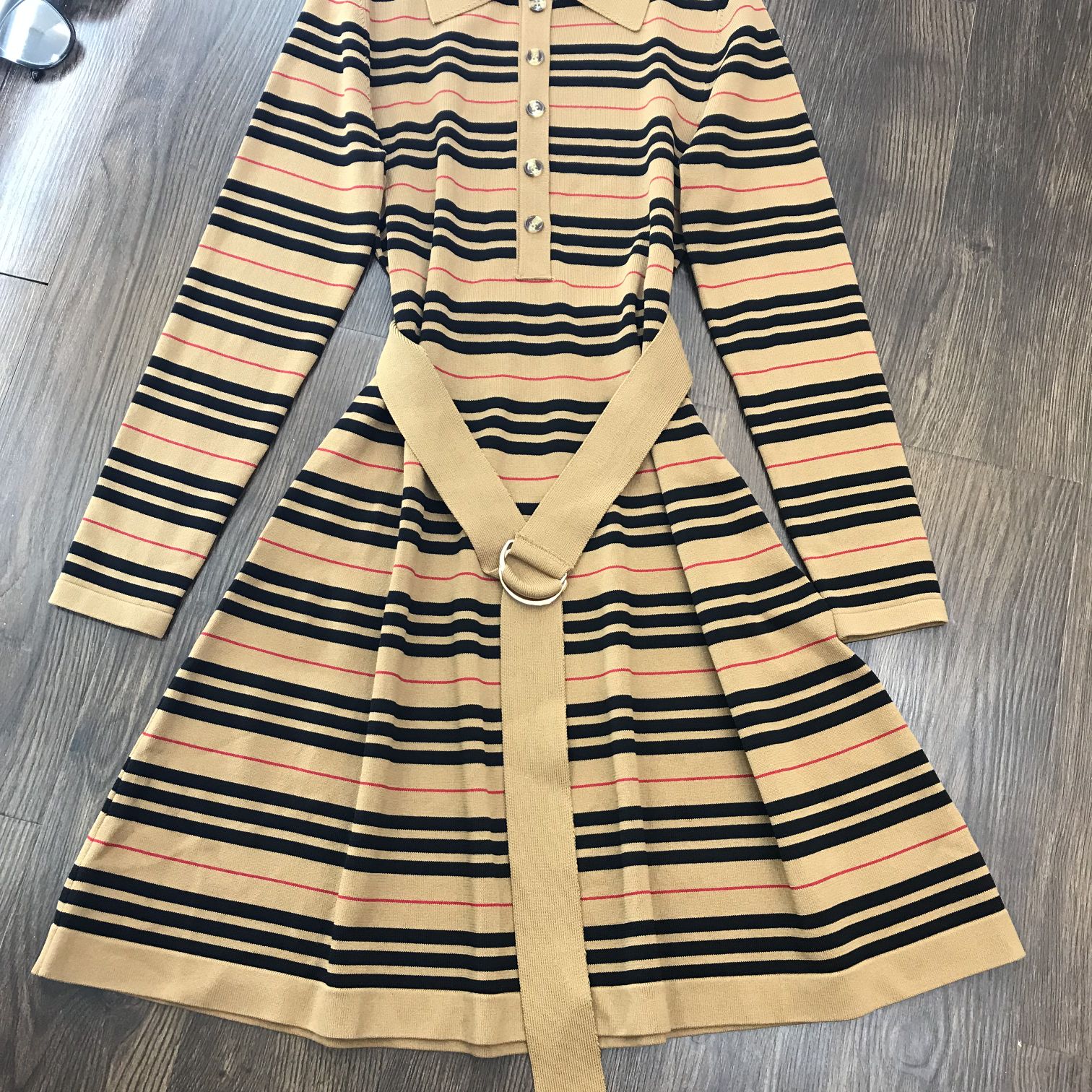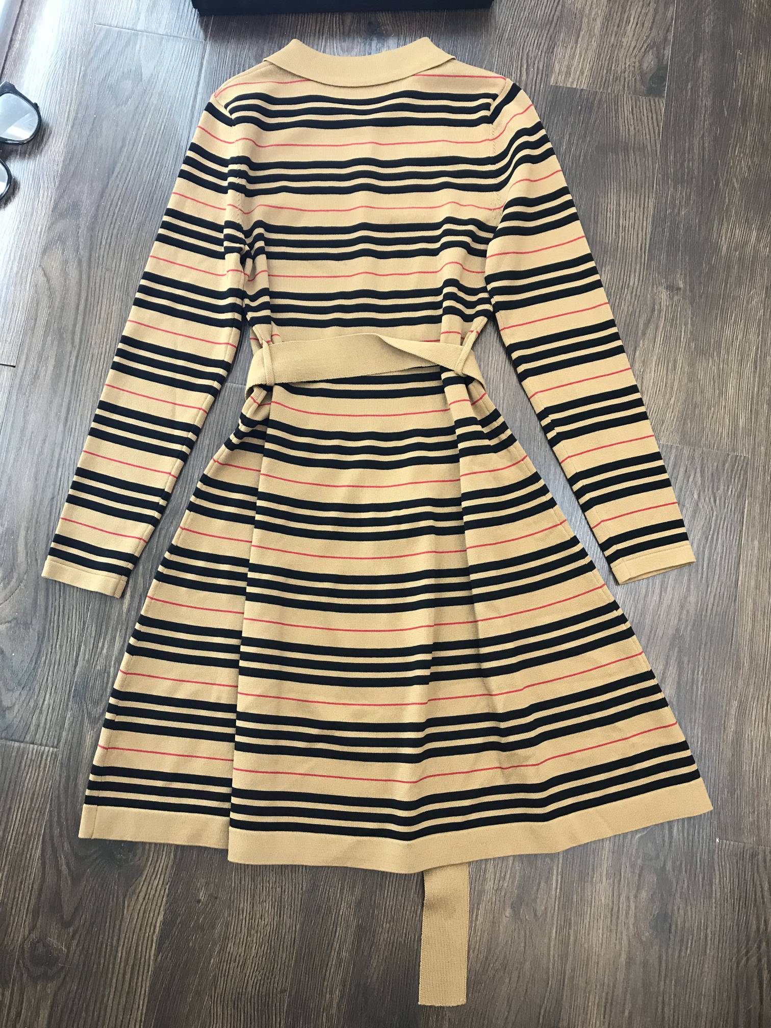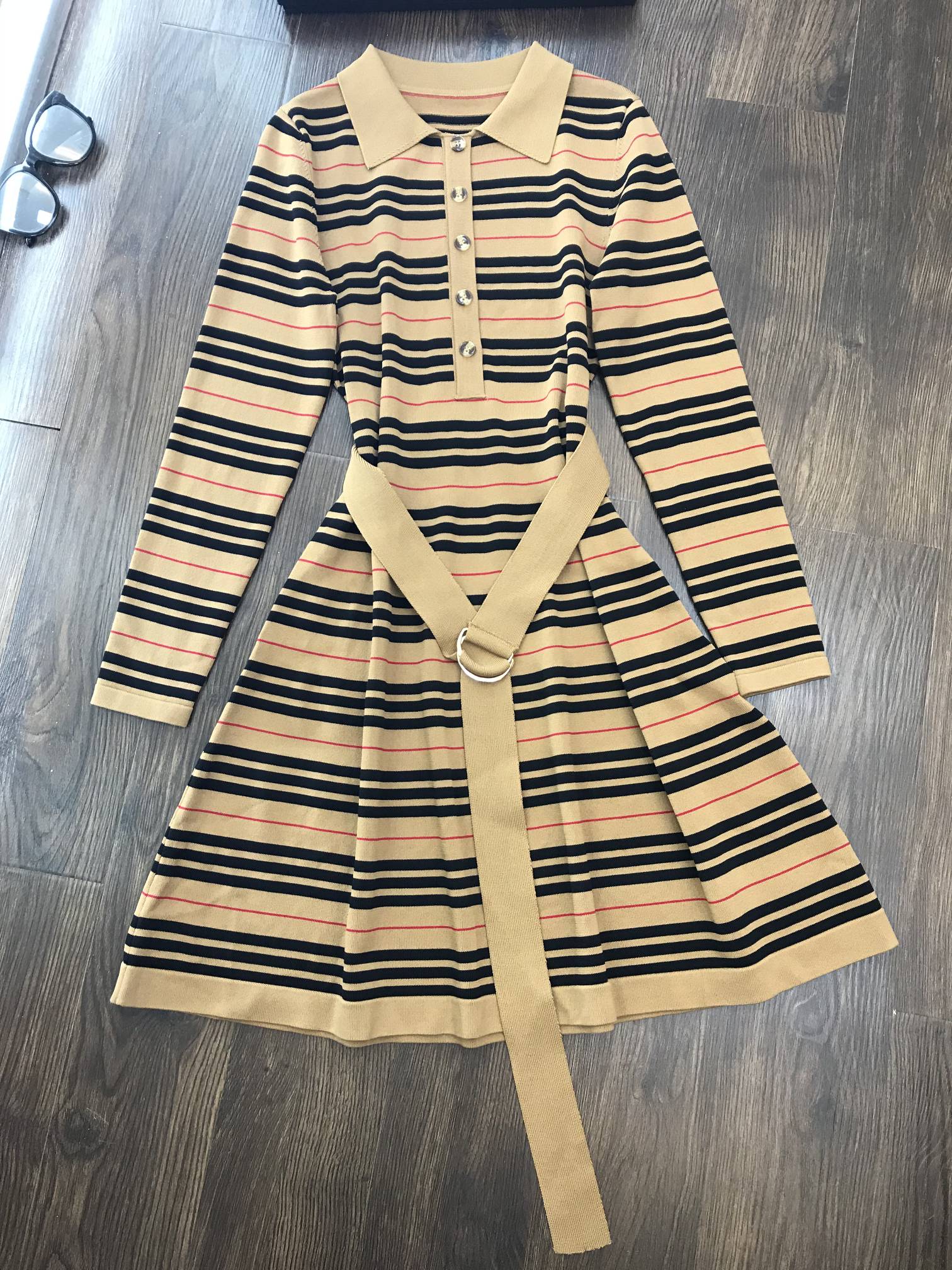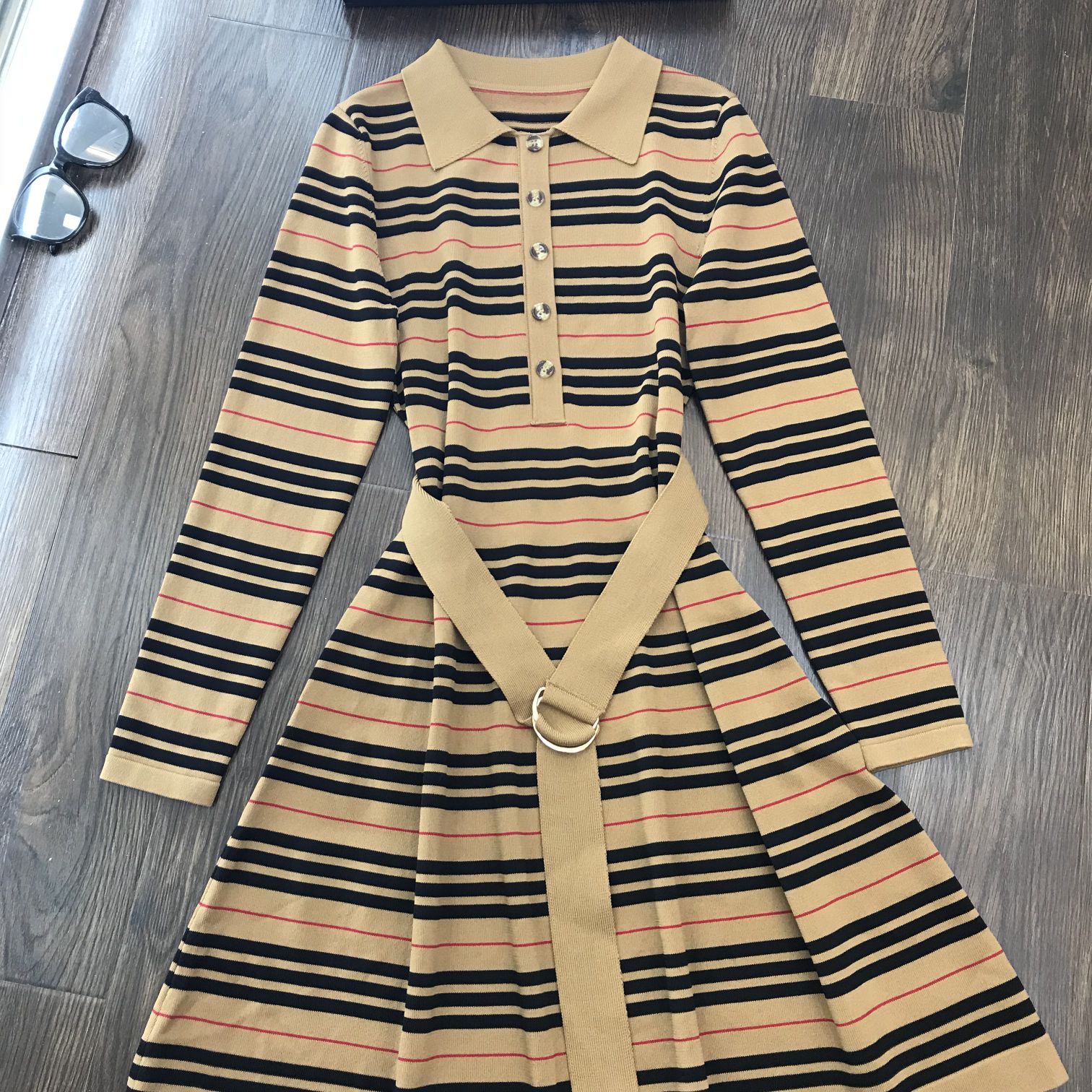 Elevate your wardrobe with this chic striped knit dress. Featuring a flattering A-line silhouette and detachable belt for a touch of elegance.