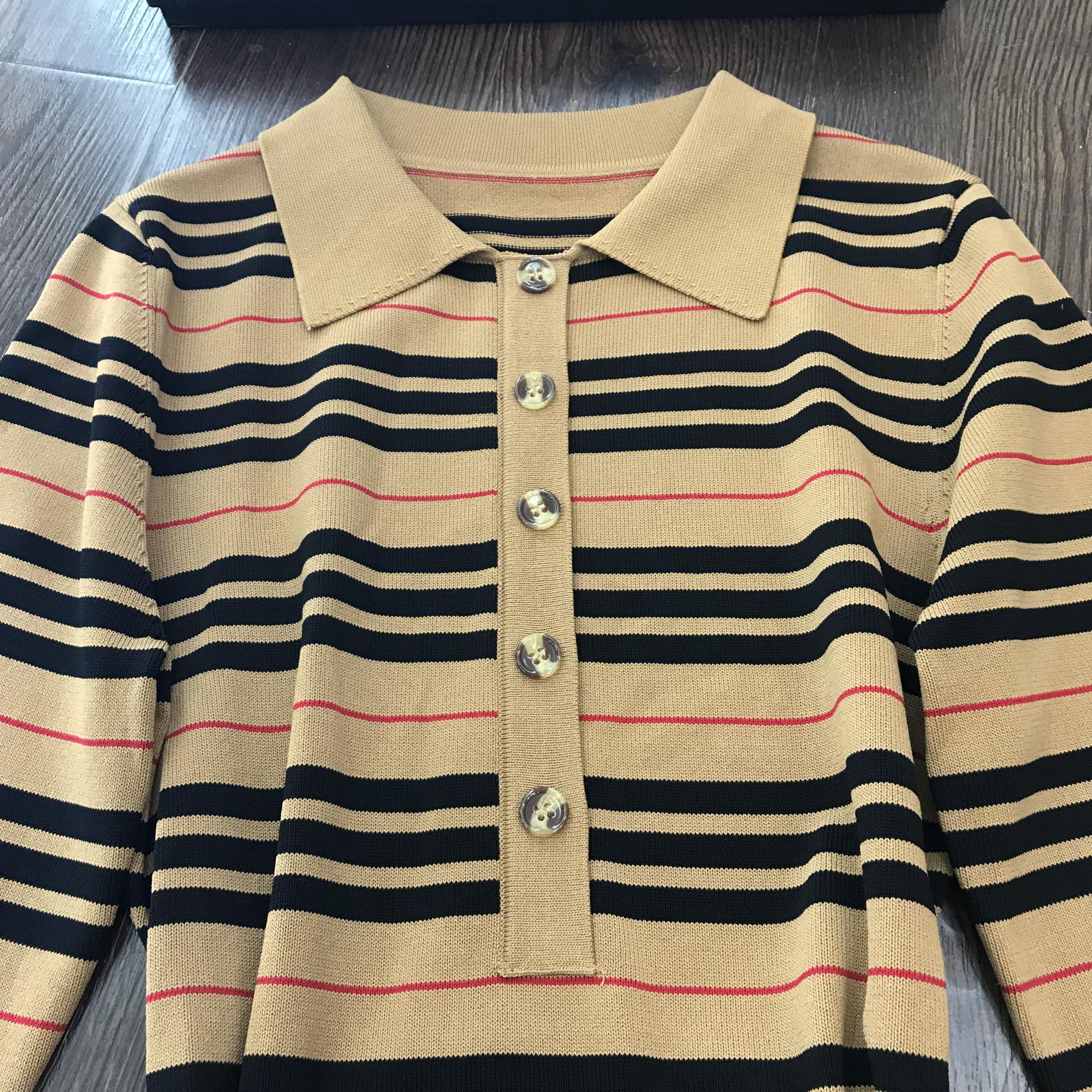 Striped Polo Collar Knit Dress with Belt, Elegant Casual Style