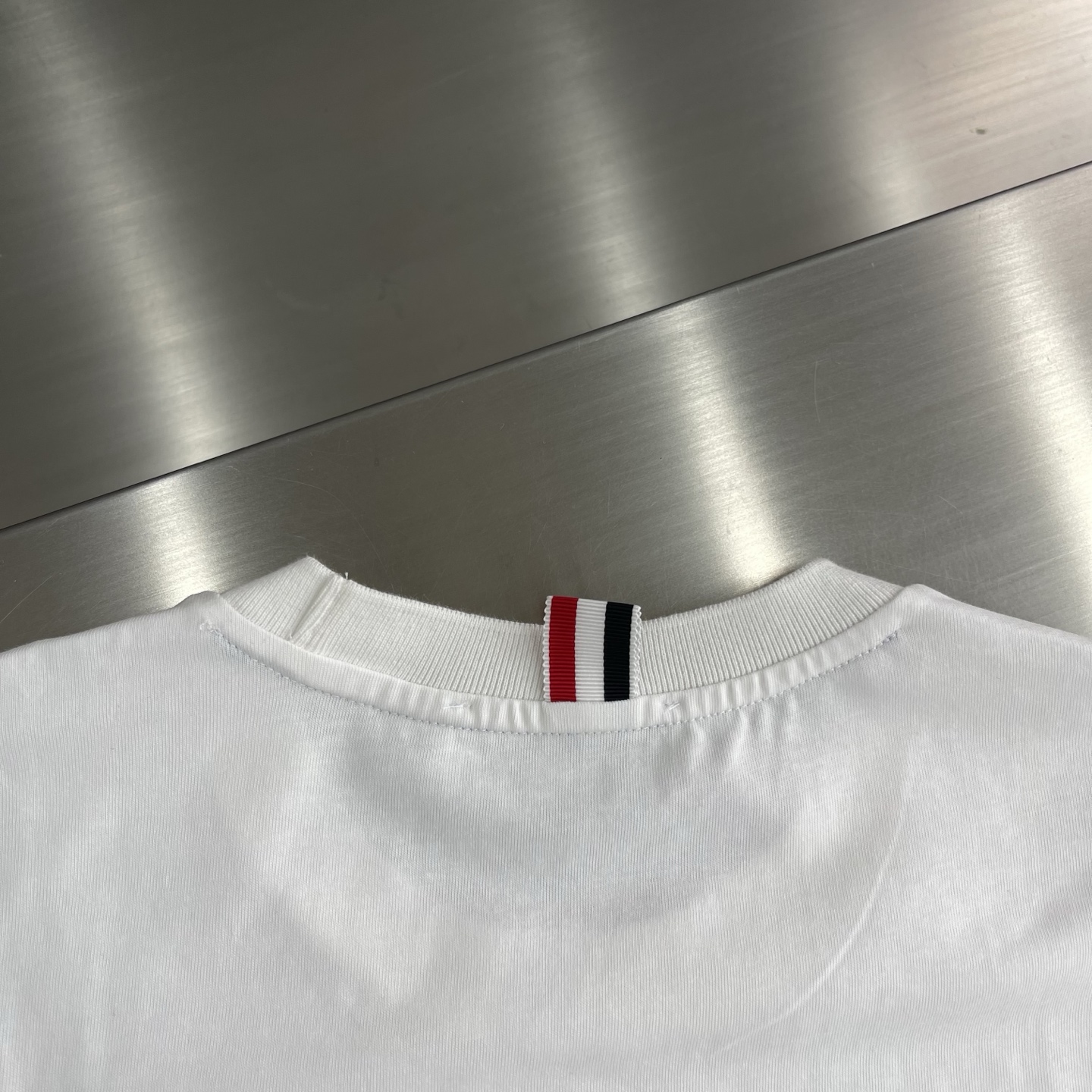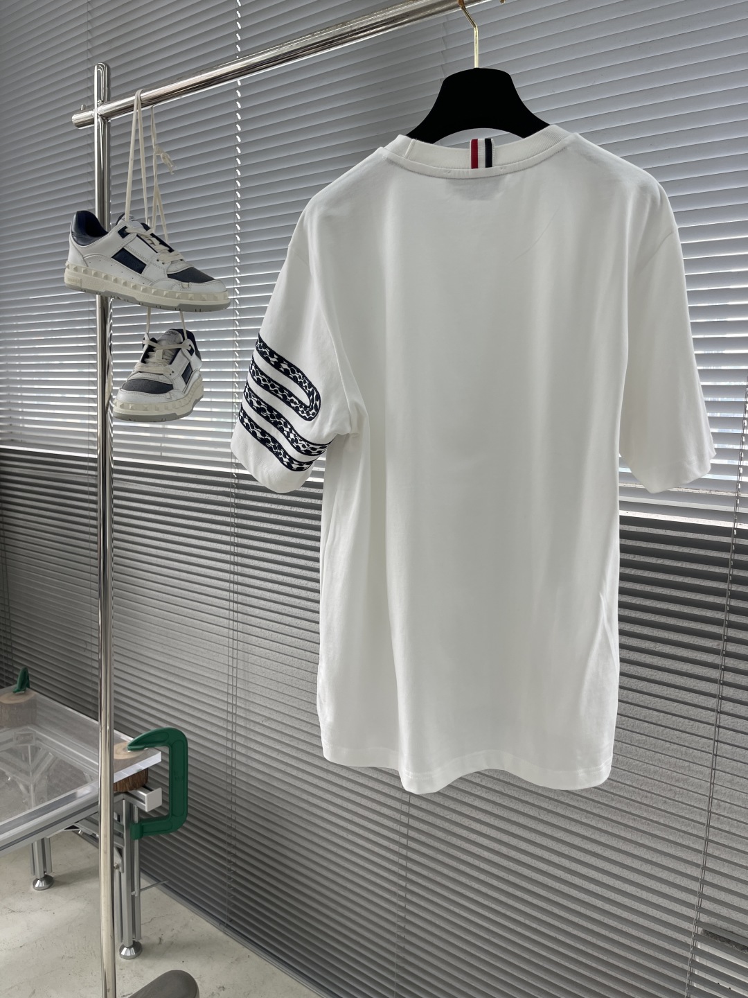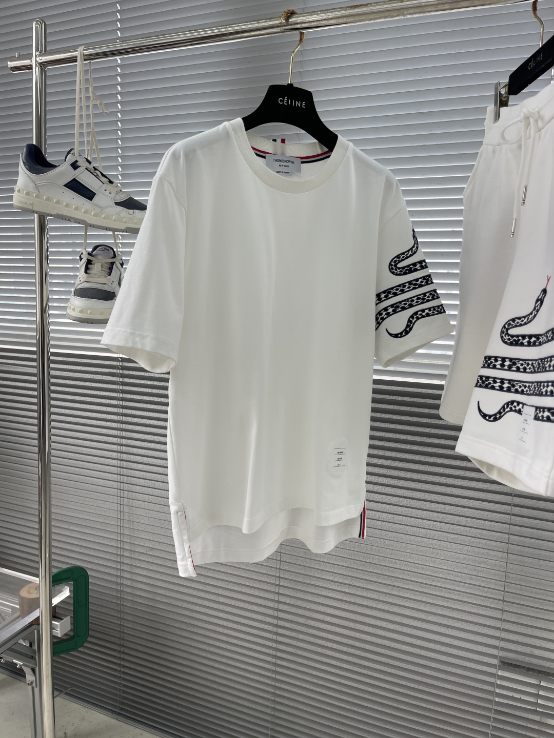 This Thom Browne T-shirt is a stylish and comfortable addition to any wardrobe. Made from high-quality cotton, it features a unique snake embroidery on the sleeve, adding a touch of luxury to a casual staple.