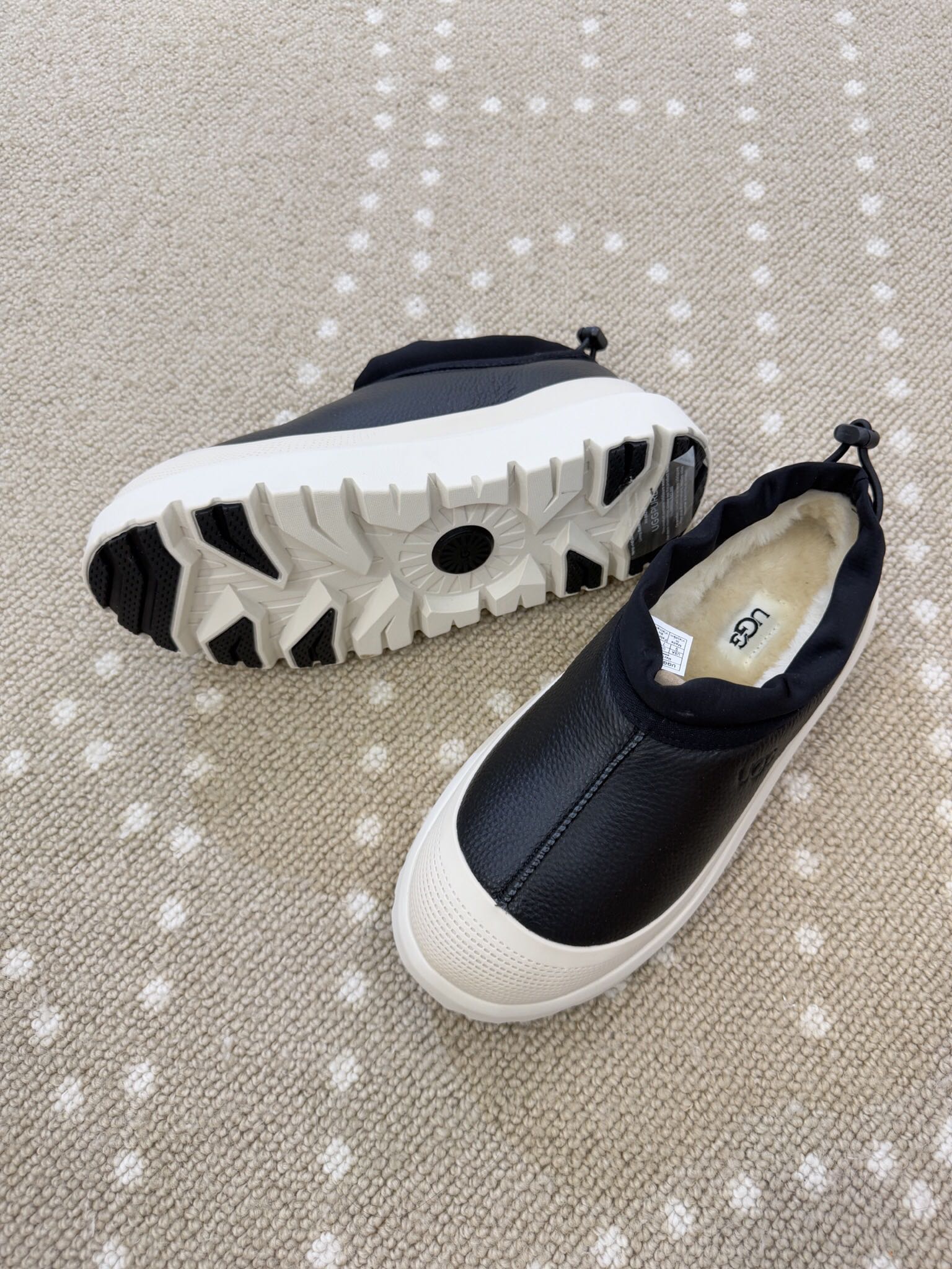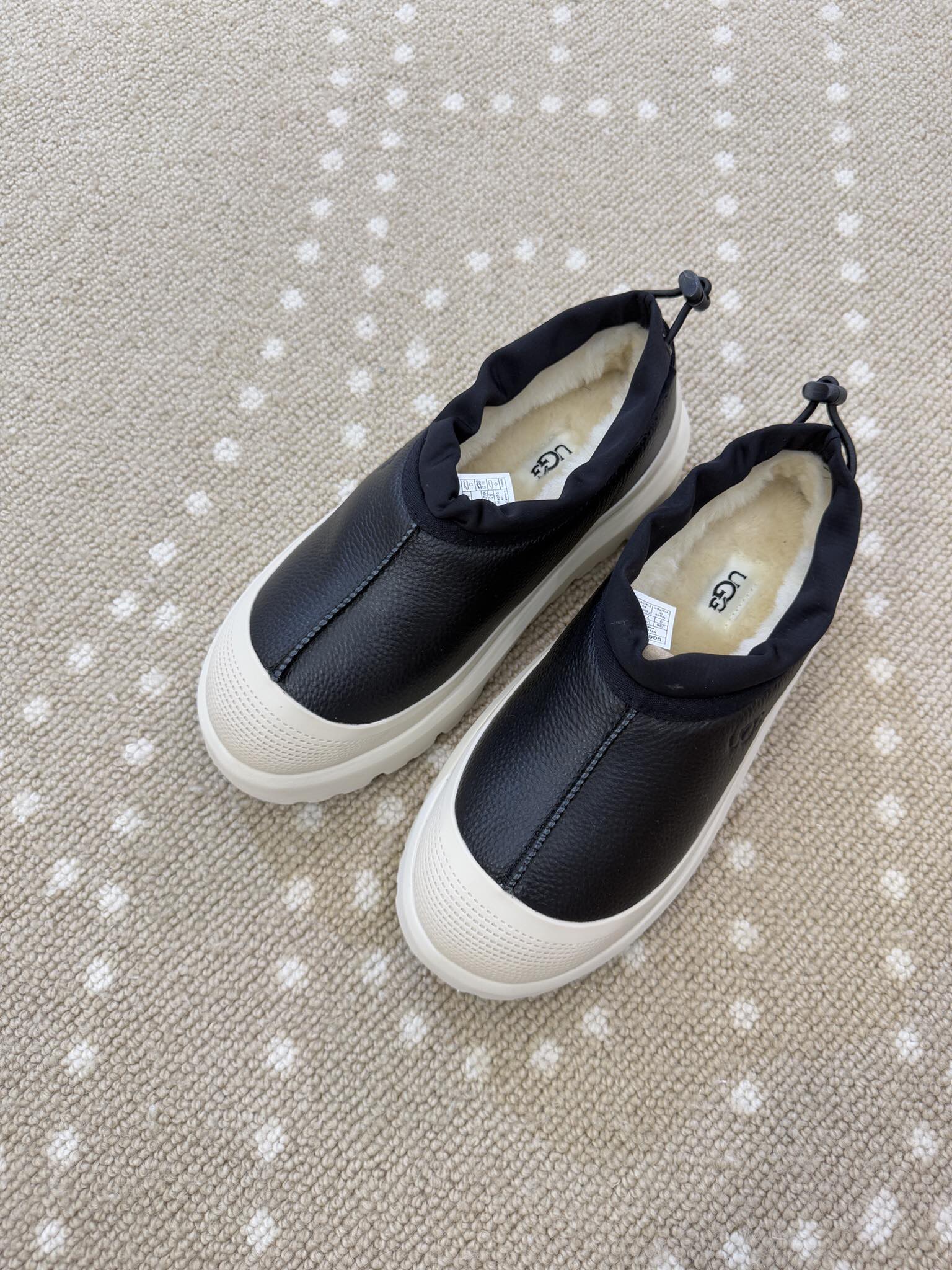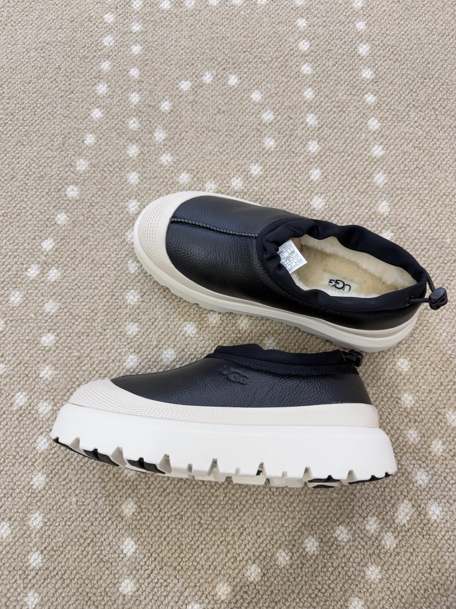 - Material: Leather upper, Wool lining, Rubber sole