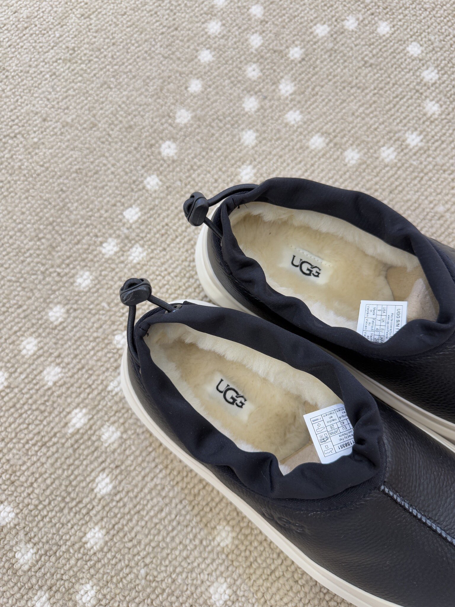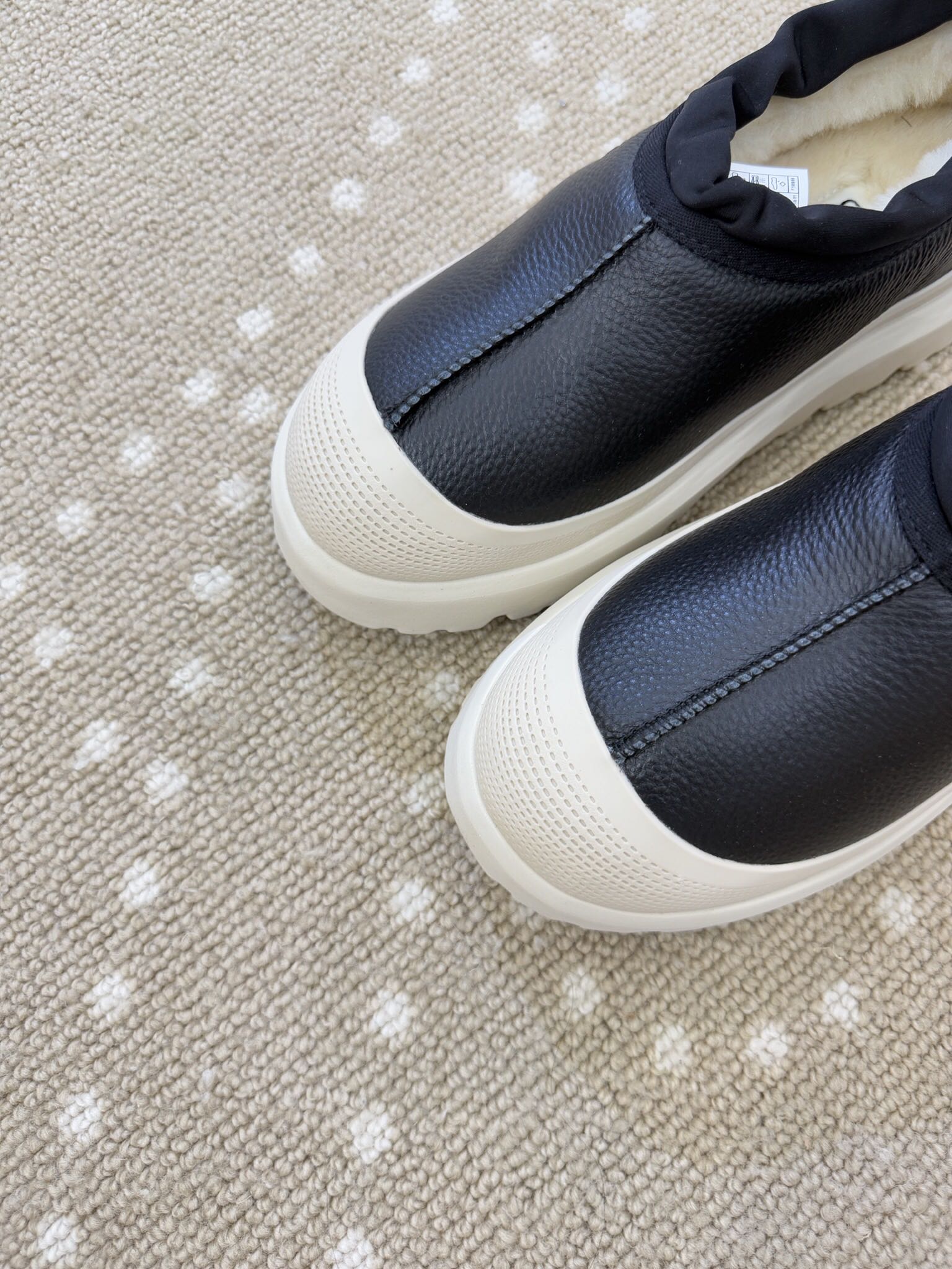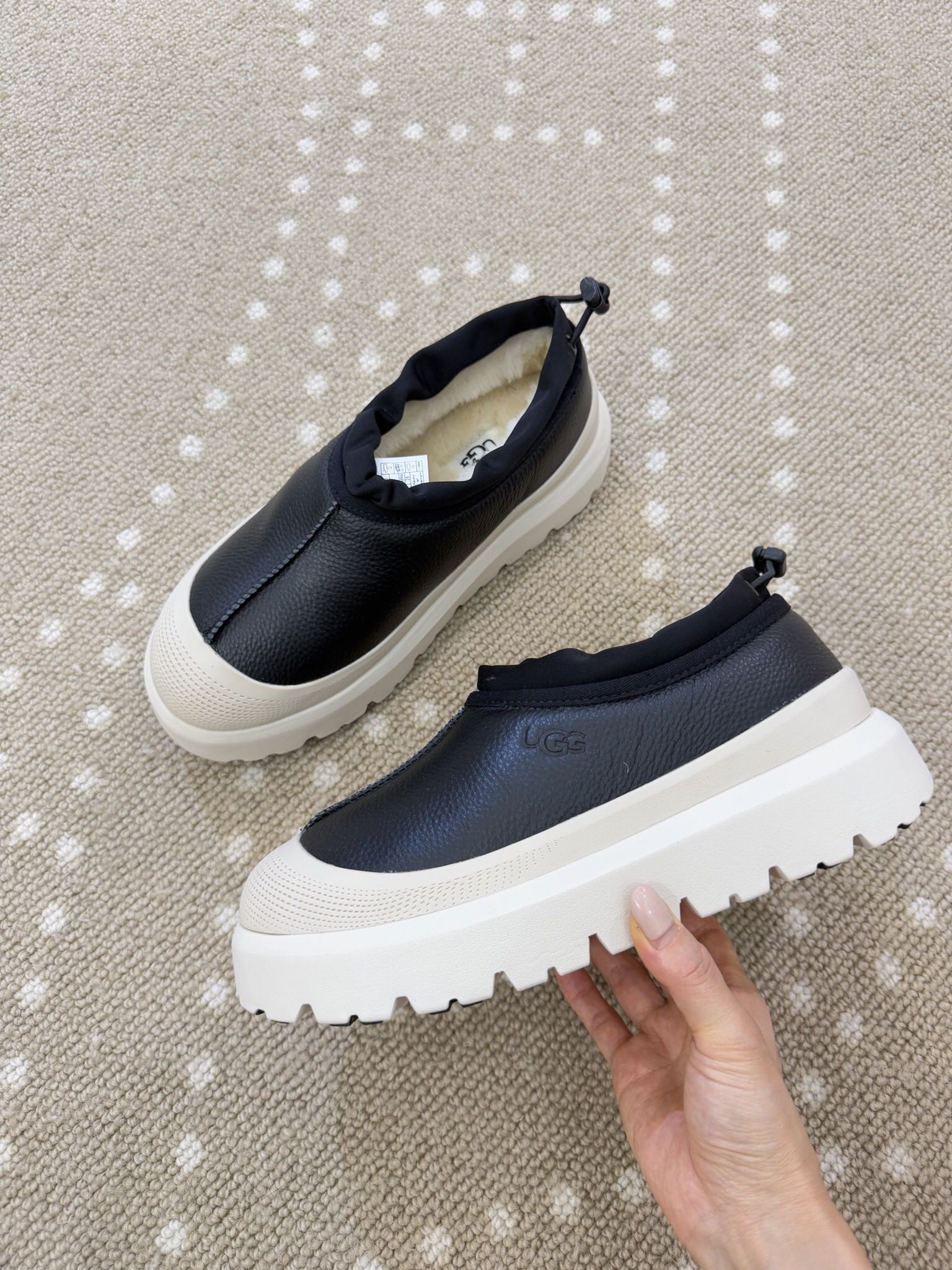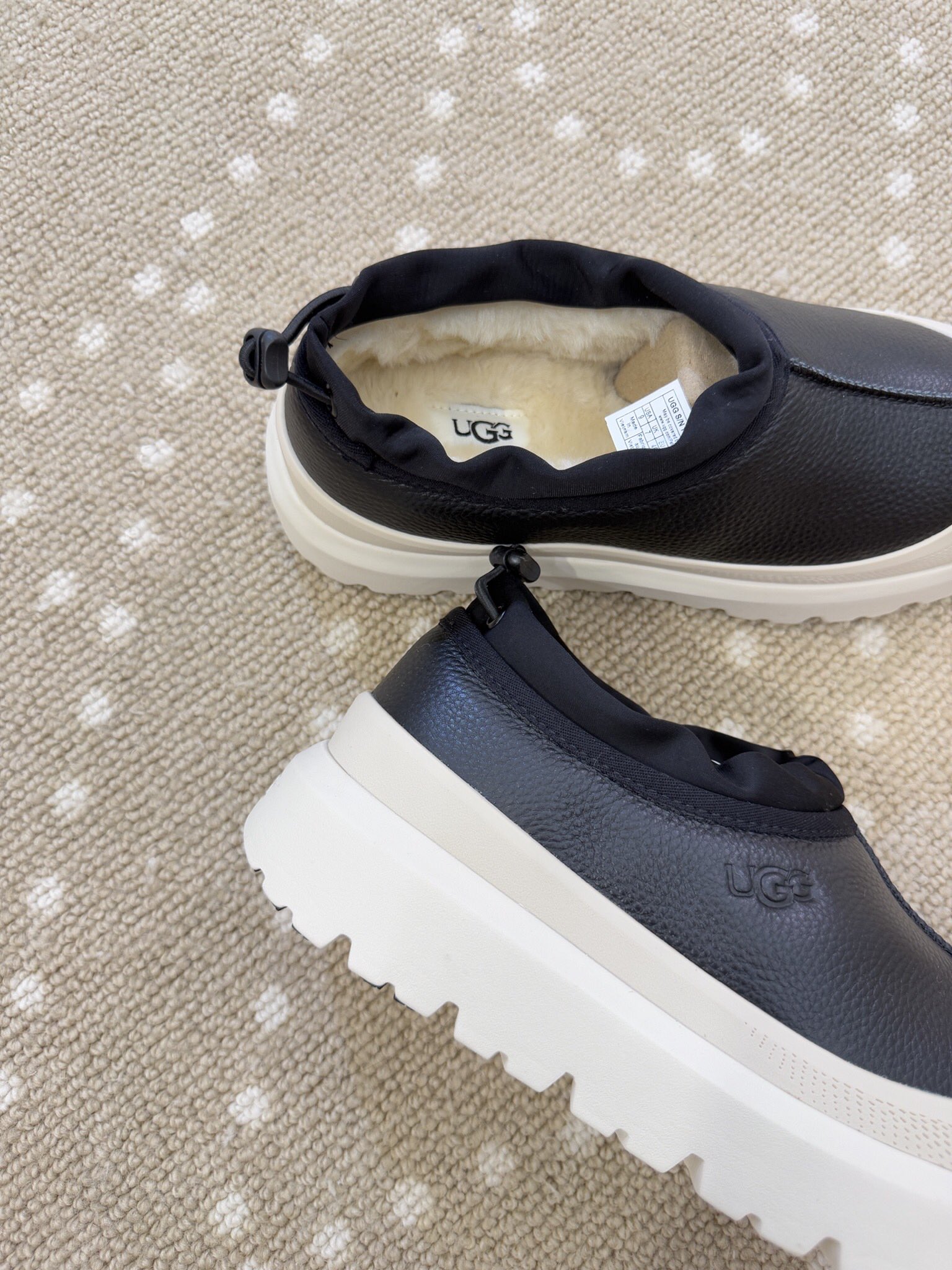 - Material: Leather upper, Wool lining, Rubber sole