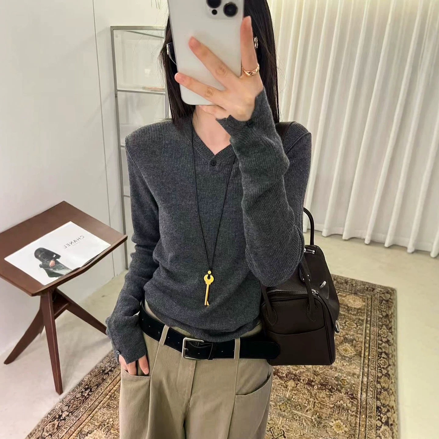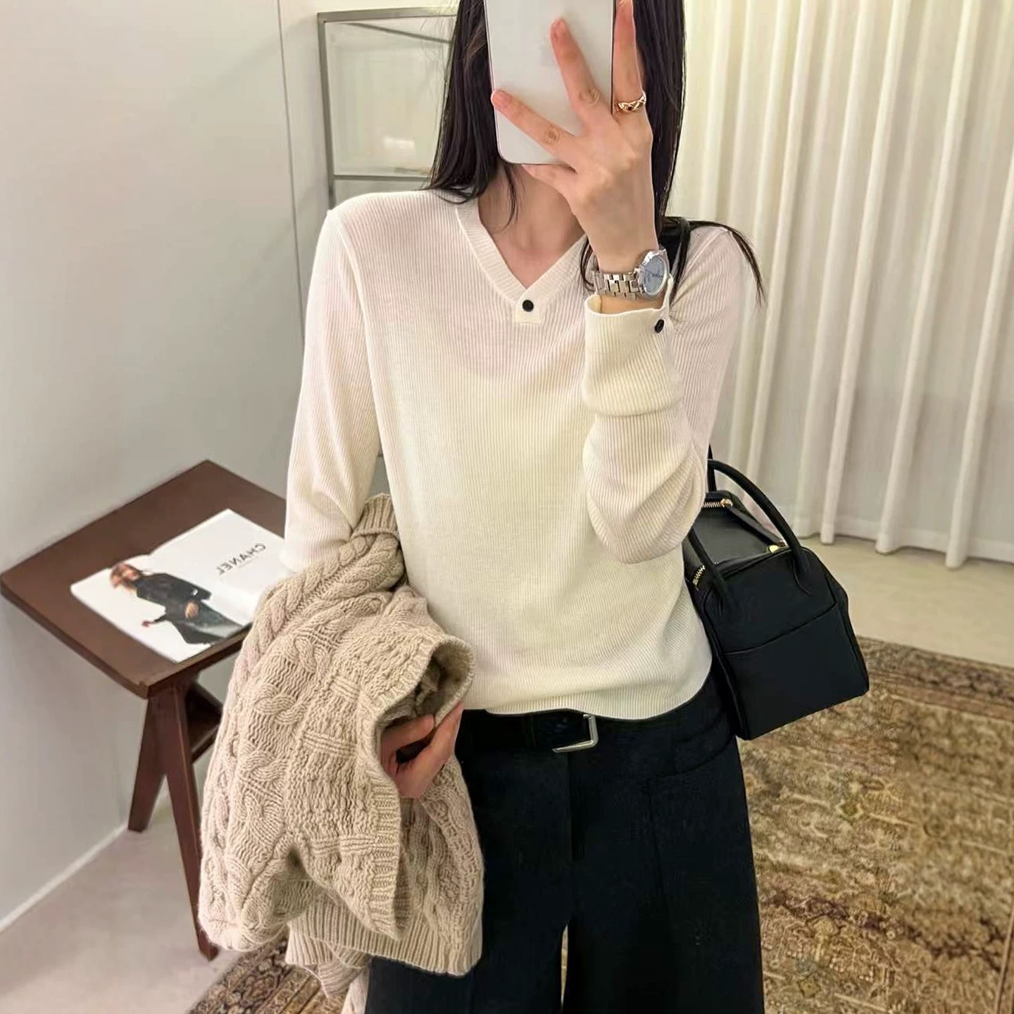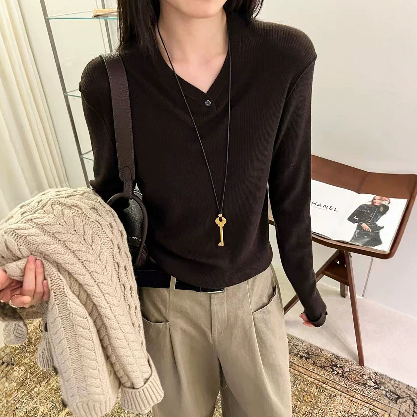 With its blend of comfort, style, and versatility, this V-neck knit top is a must-have for any fall and winter wardrobe. Stay warm and fashionable with this essential piece.