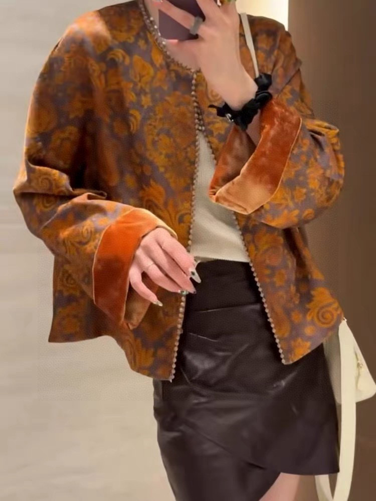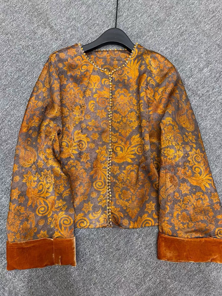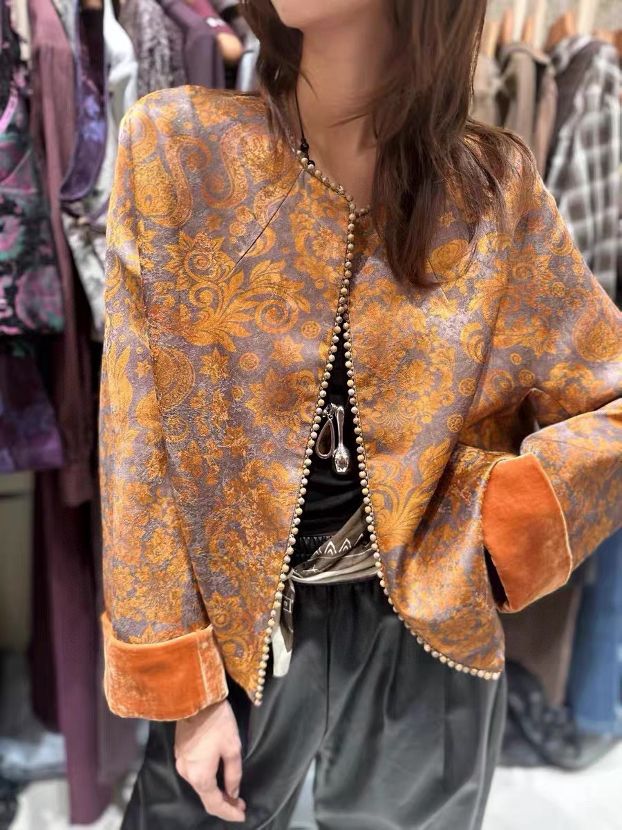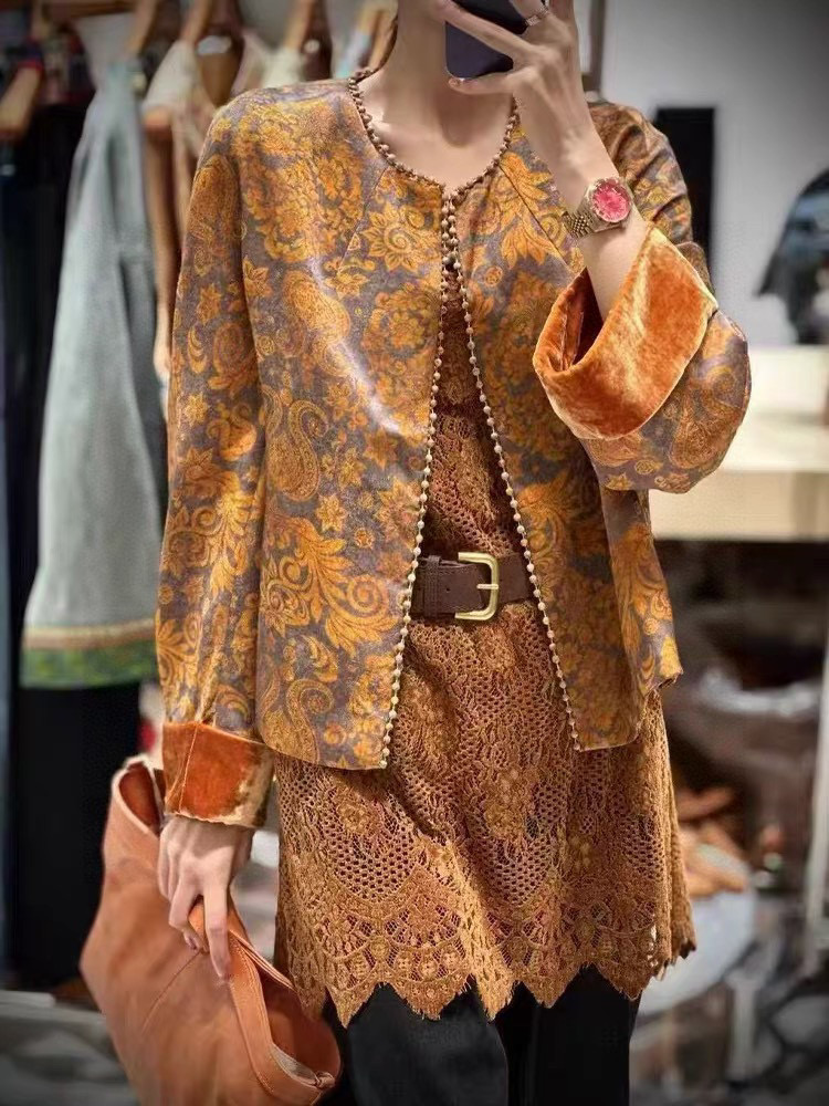 Vintage Linen Blend Print Velvet Jacket Elegant Wooden Beaded Trim Coat
